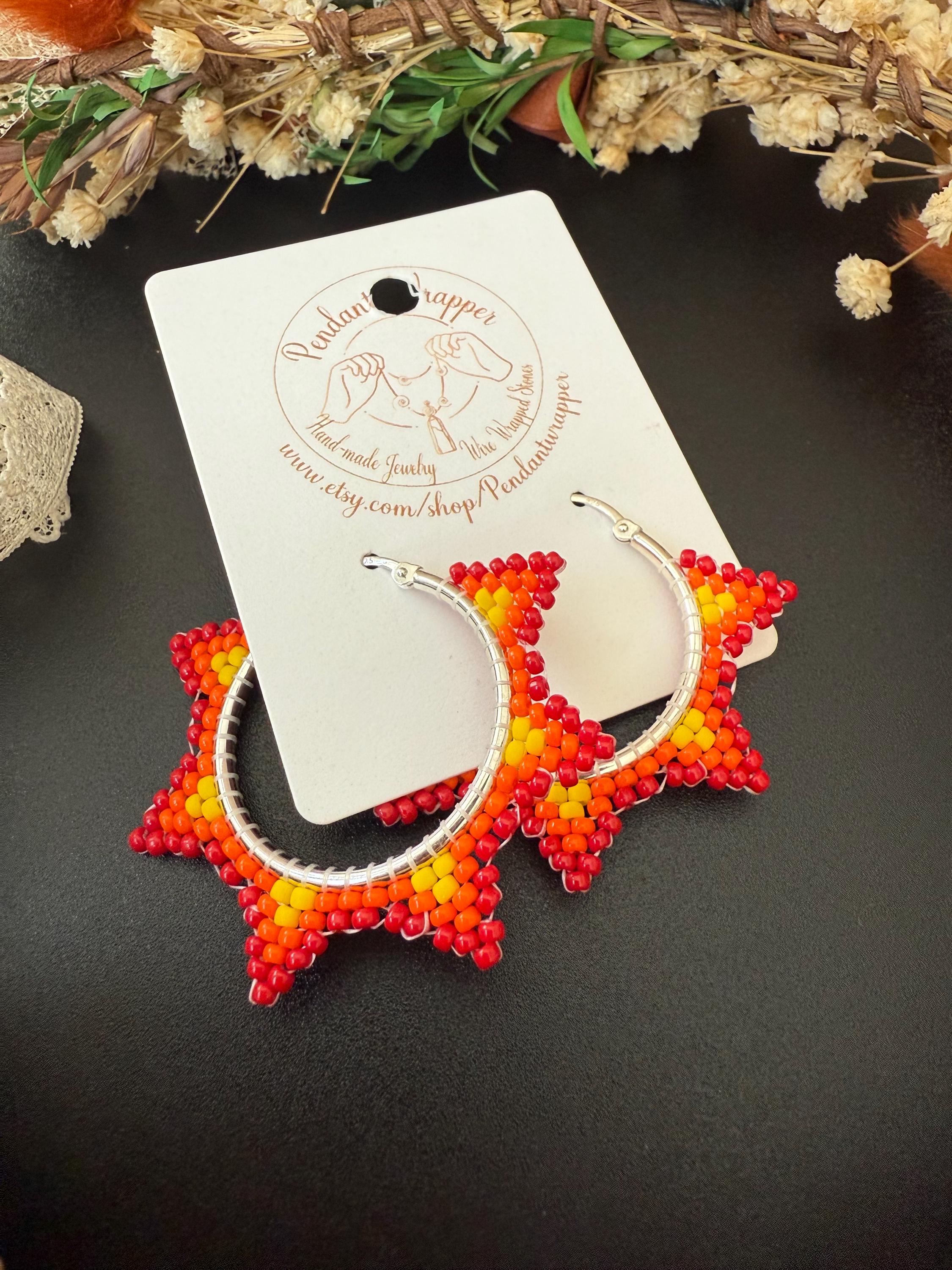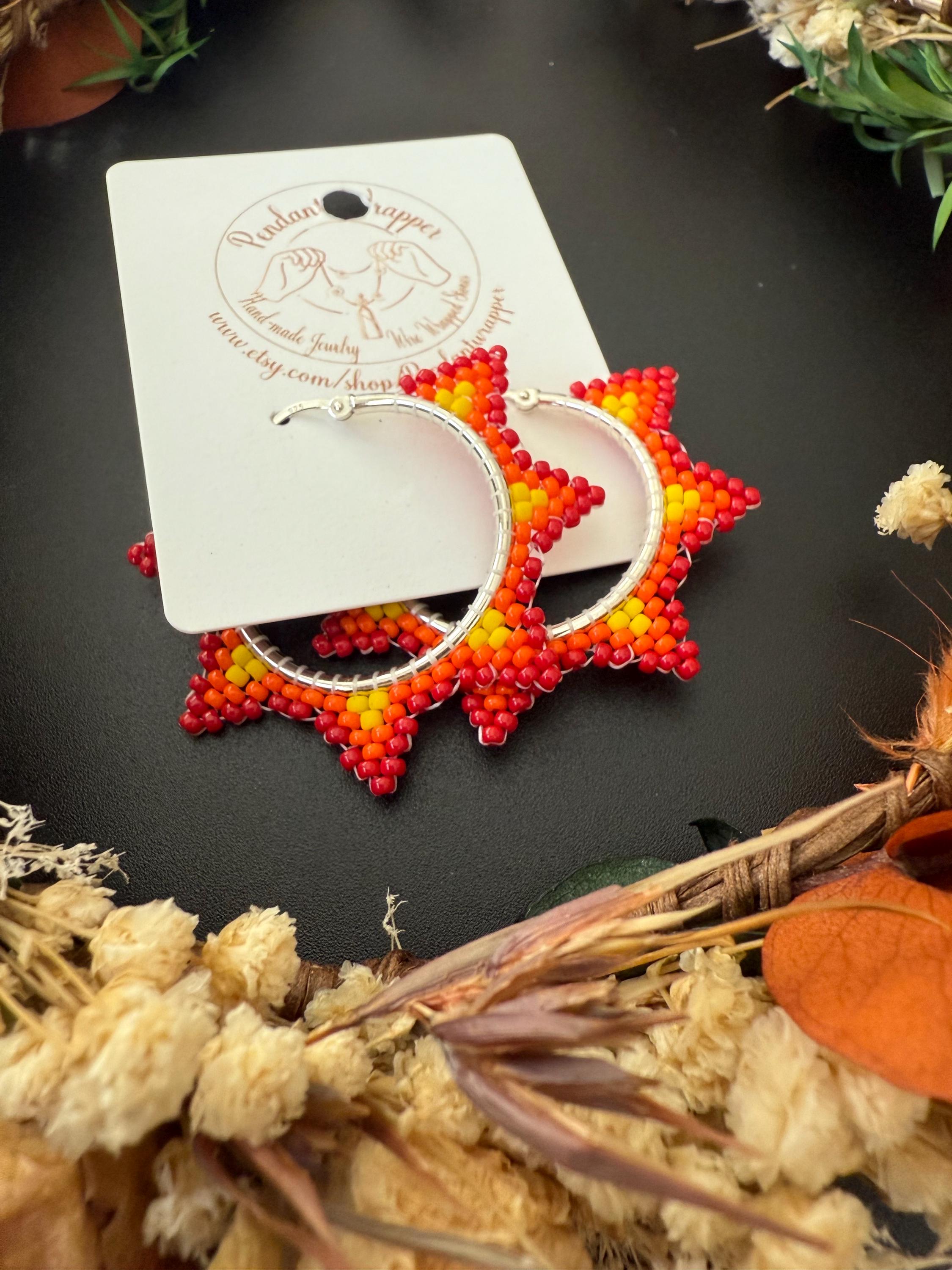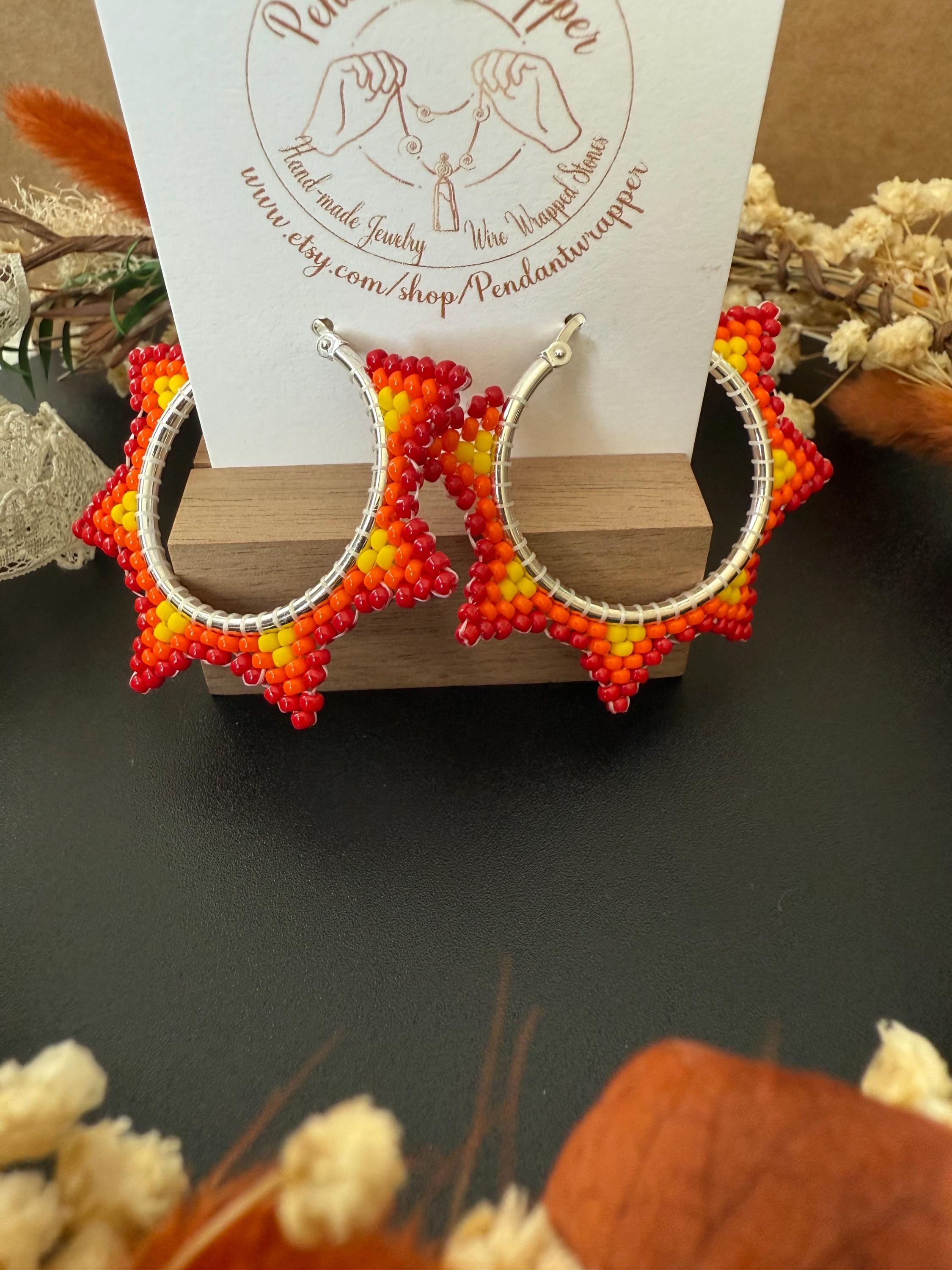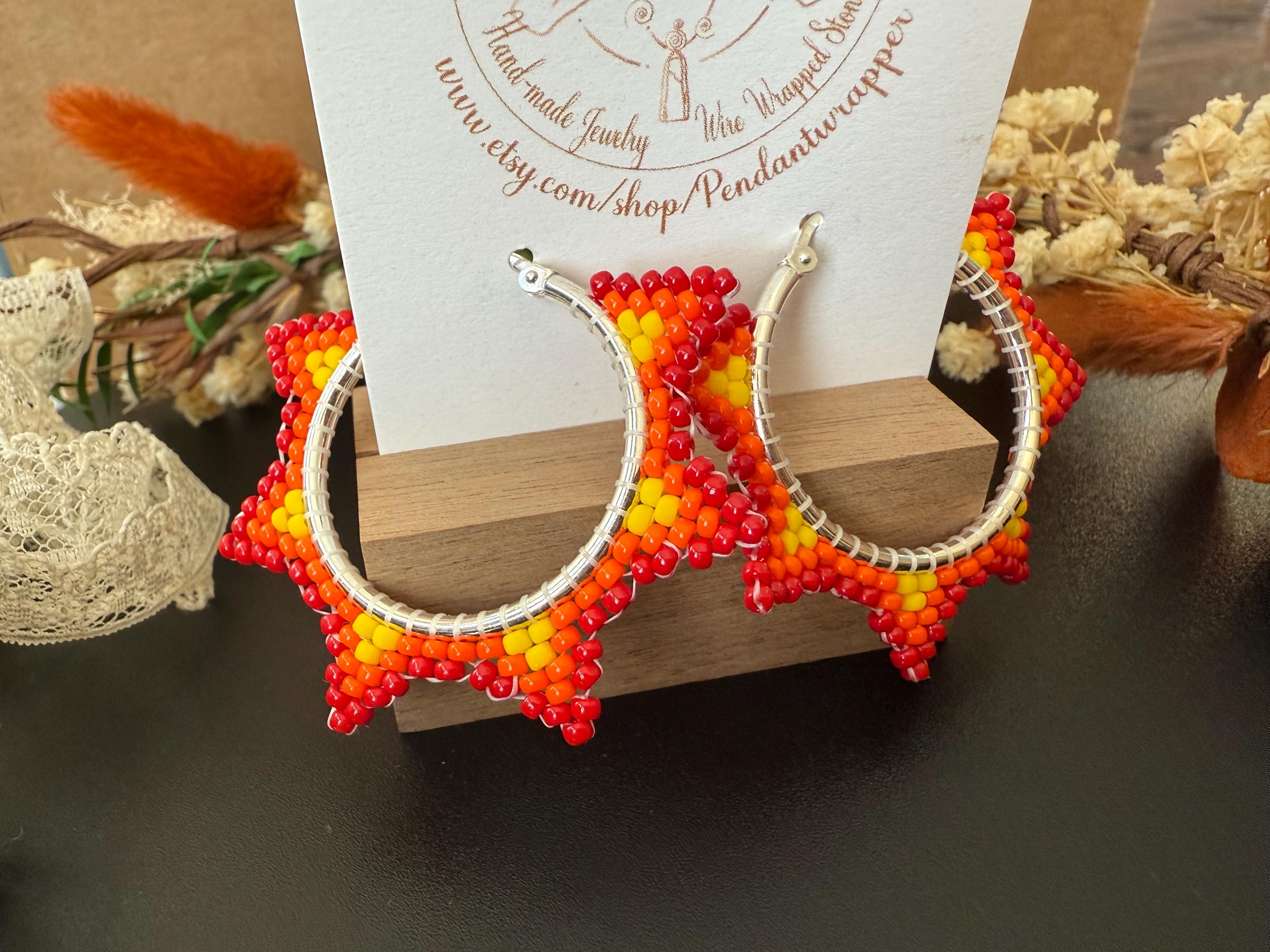 These beautiful hoops are designed on a sterling silver .925 hoop frame, sewn on with size 11 seed beads with the deepest colors of fire embedded throughout. The silver hoop frames have been purchased, but all beading is done by me. Start to finish time on these beautiful hoops is just around 2 hours. A polish cloth is included with your earrings.