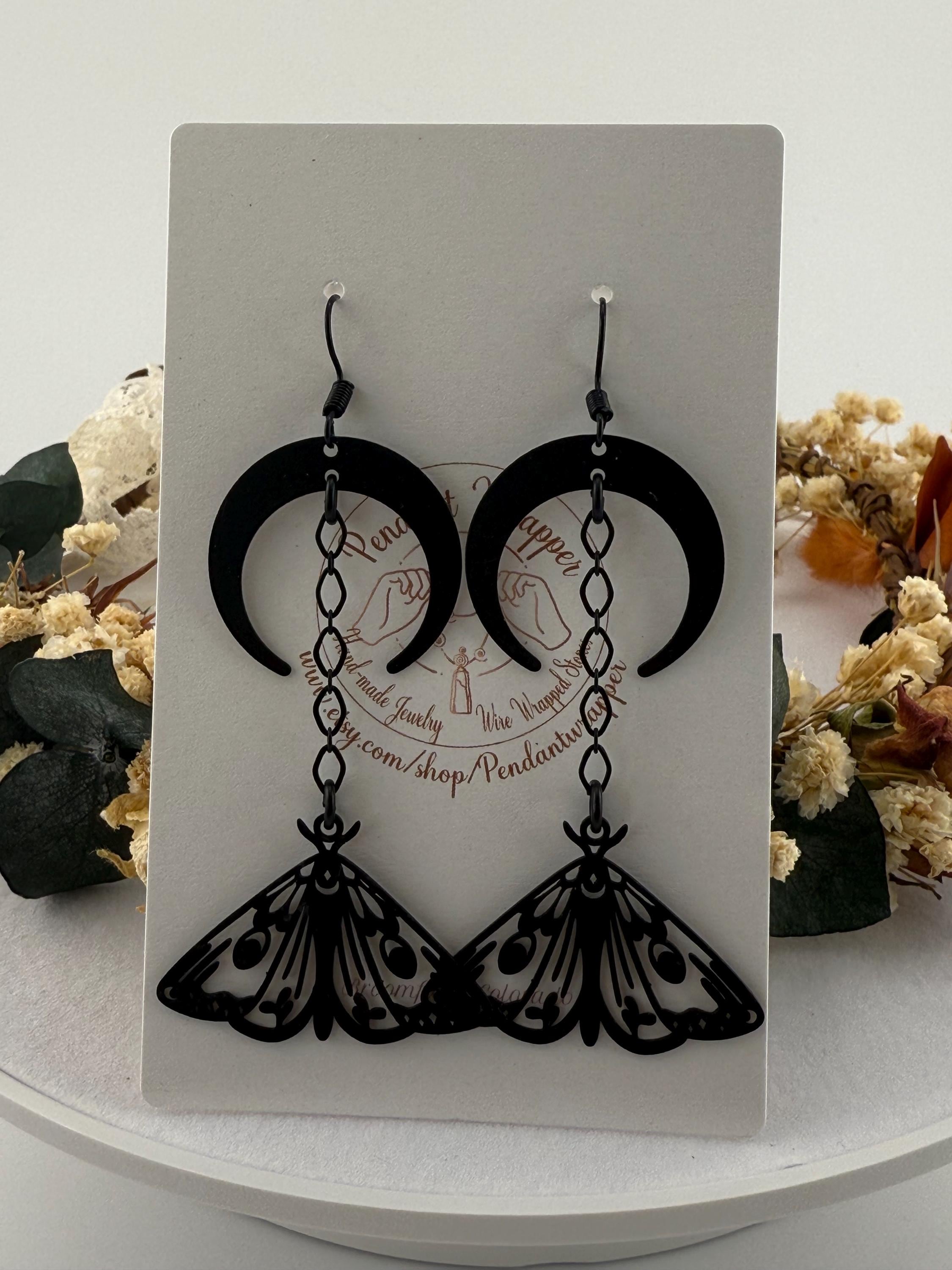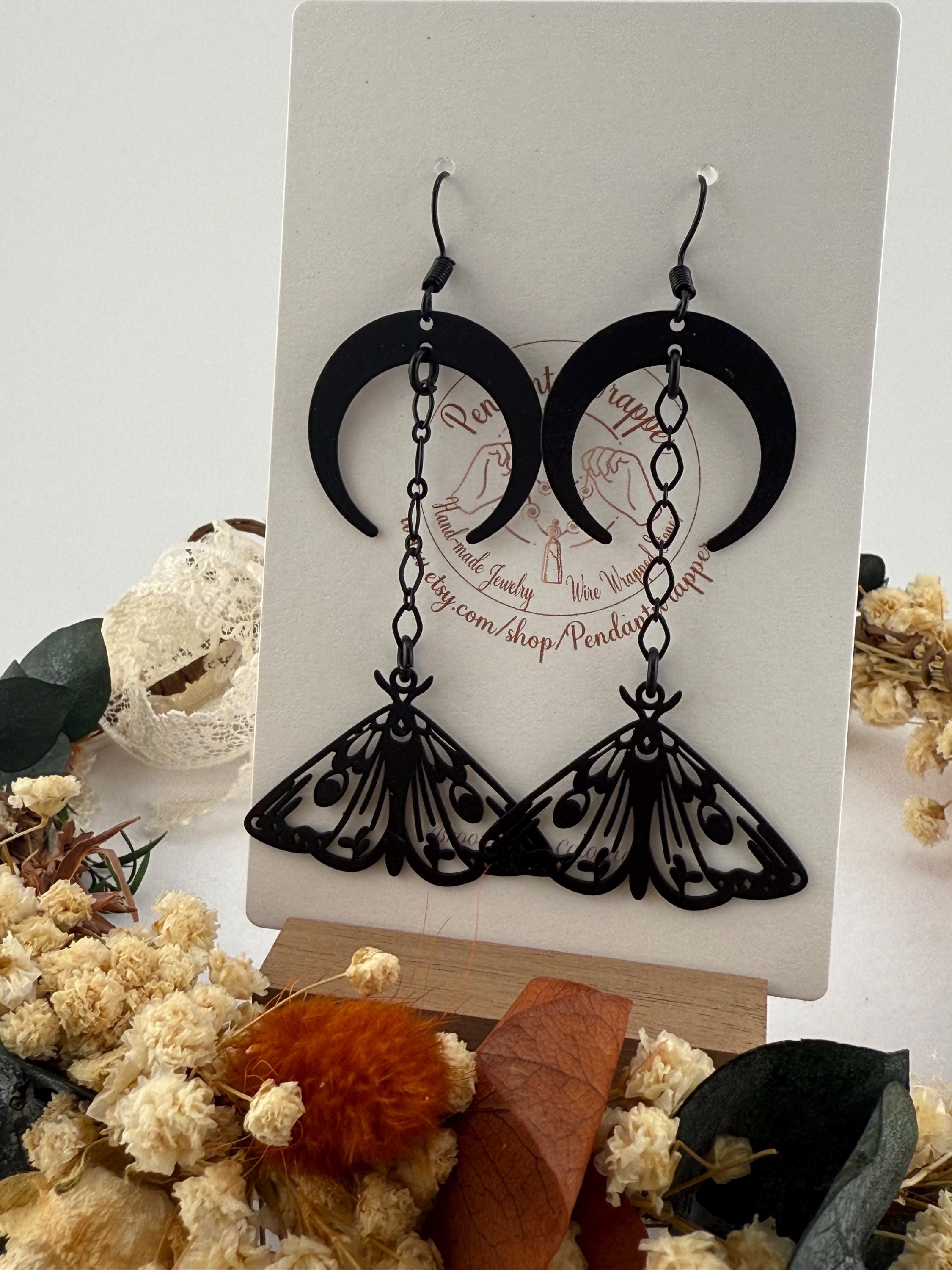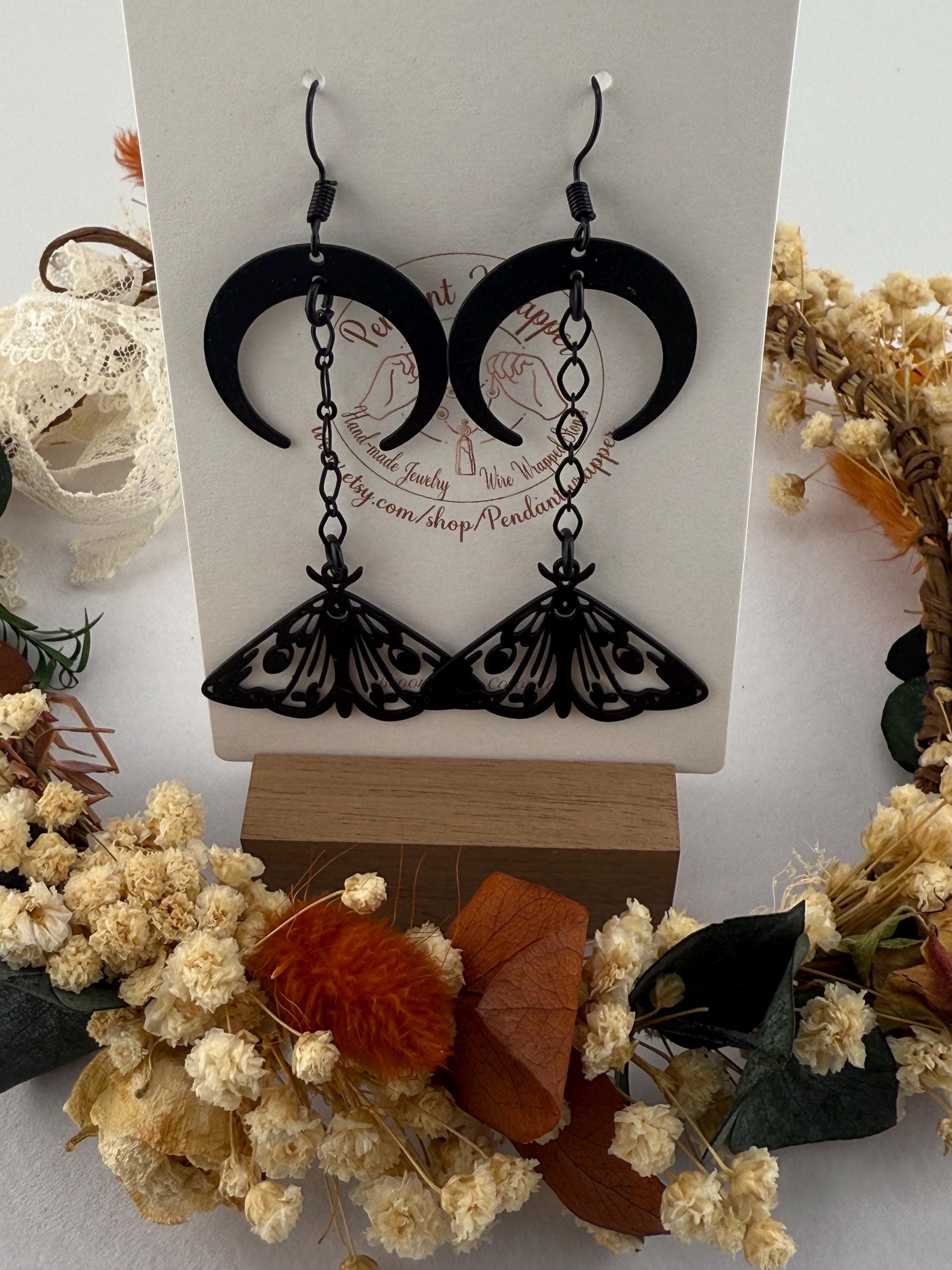 These are the absolute cutest yet also witchiest earrings I make! They include both a crescent moon and lunar moth, connected with a black chain, composed all on a black metal base. These adorable earrings dangle approximately 2.7-3.0 inches in length. These earrings do fit any season but we love them most especially in October!