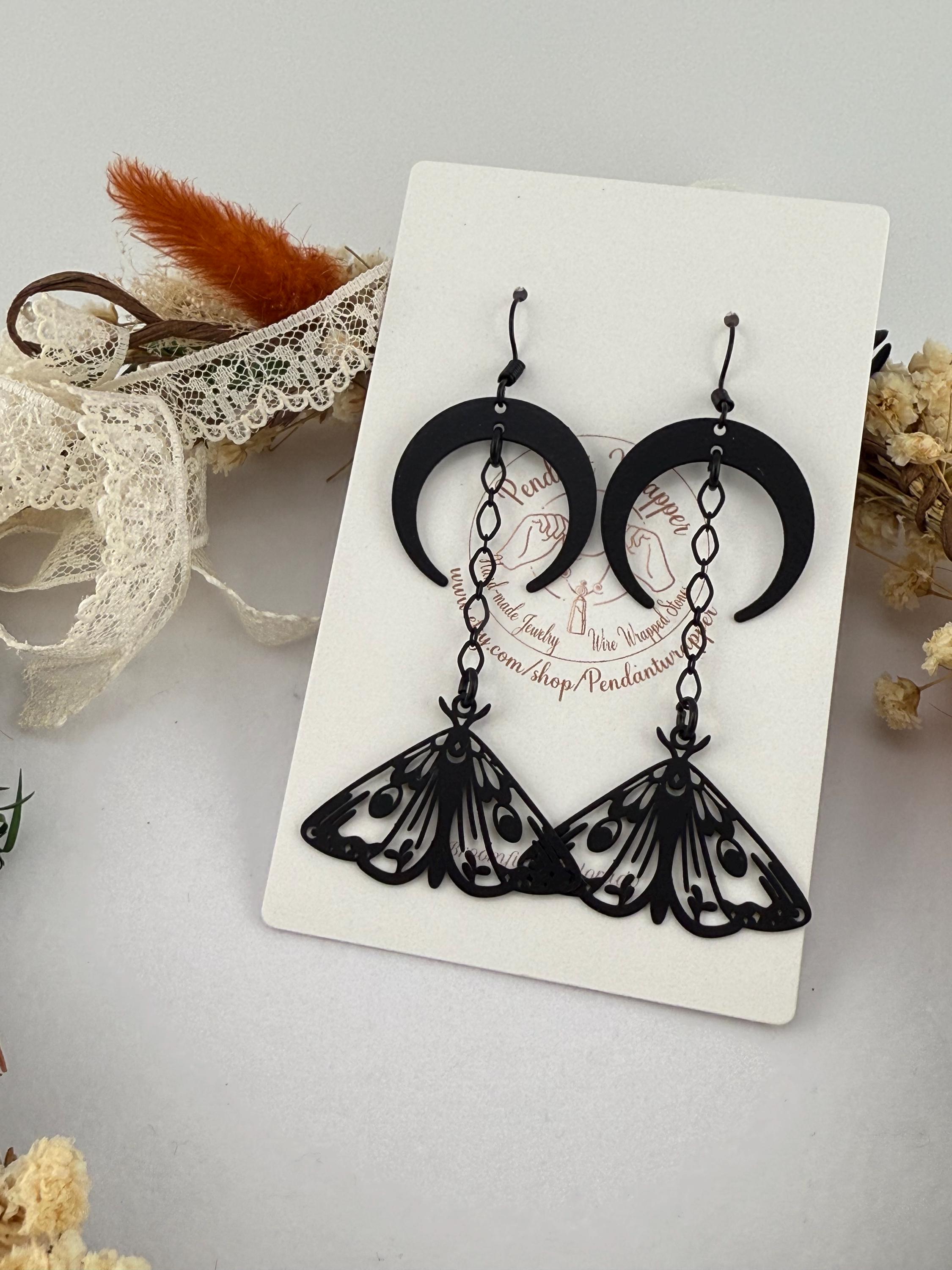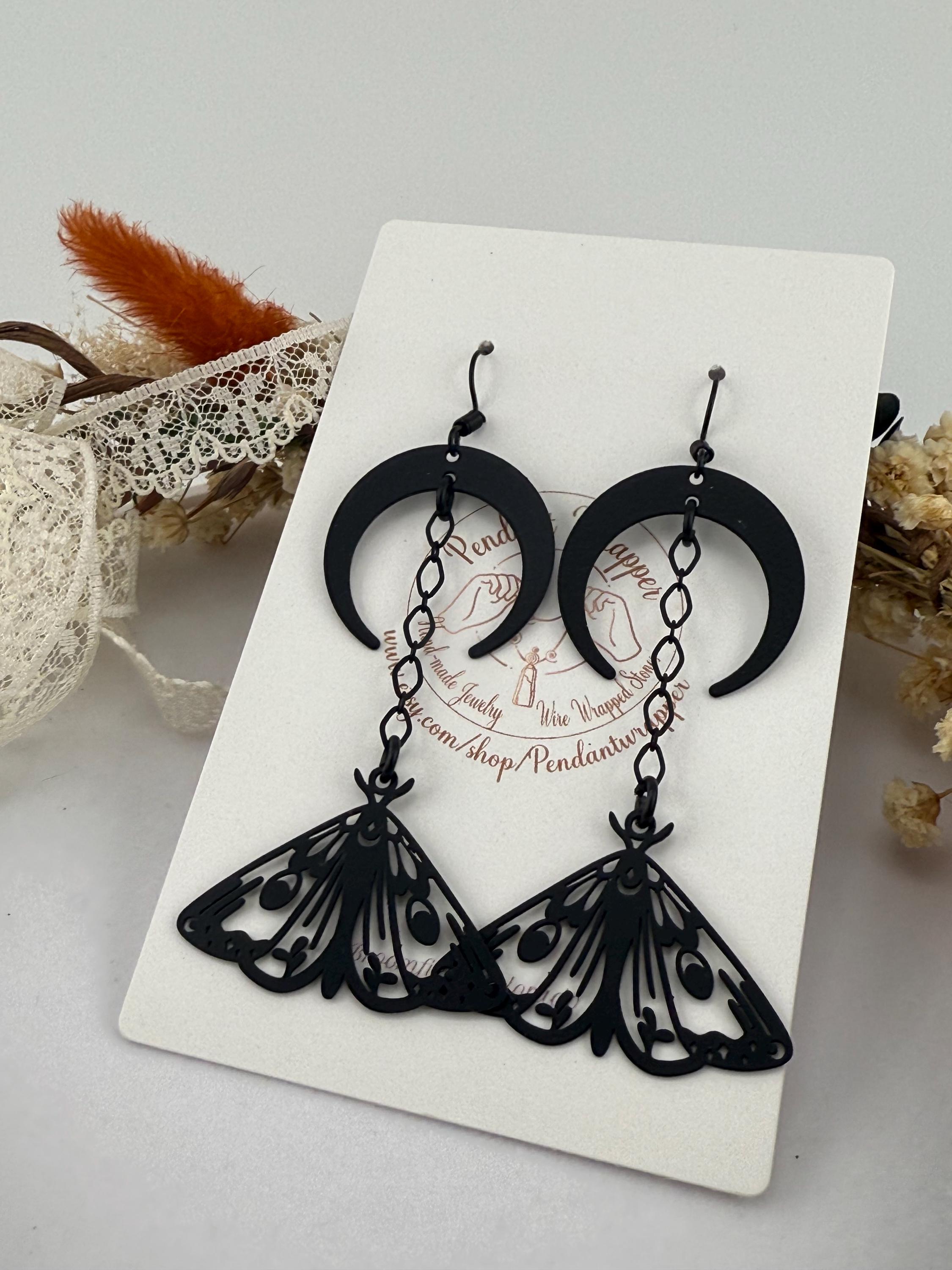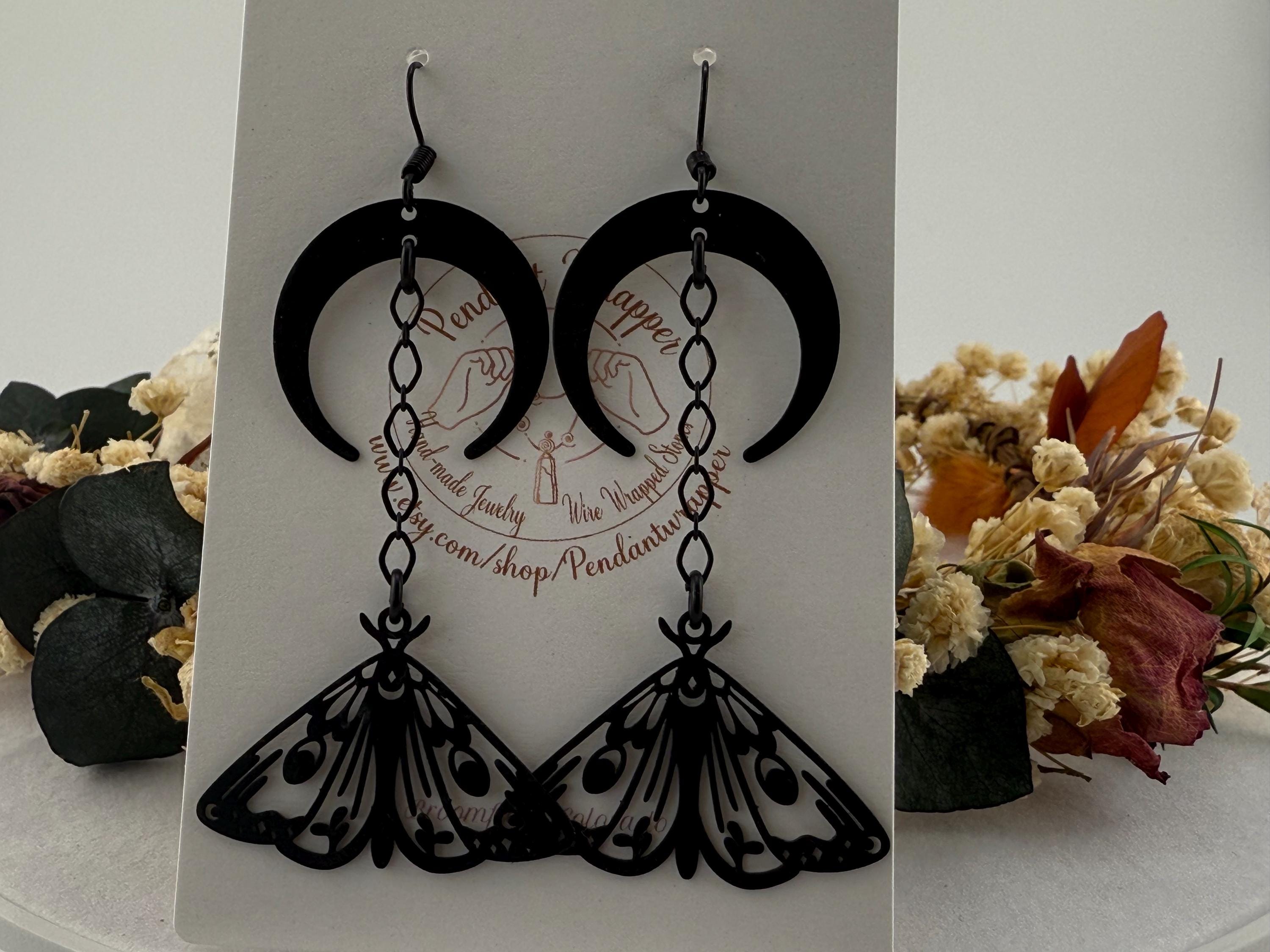 These are the absolute cutest yet also witchiest earrings I make! They include both a crescent moon and lunar moth, connected with a black chain, composed all on a black metal base. These adorable earrings dangle approximately 2.7-3.0 inches in length. These earrings do fit any season but we love them most especially in October!