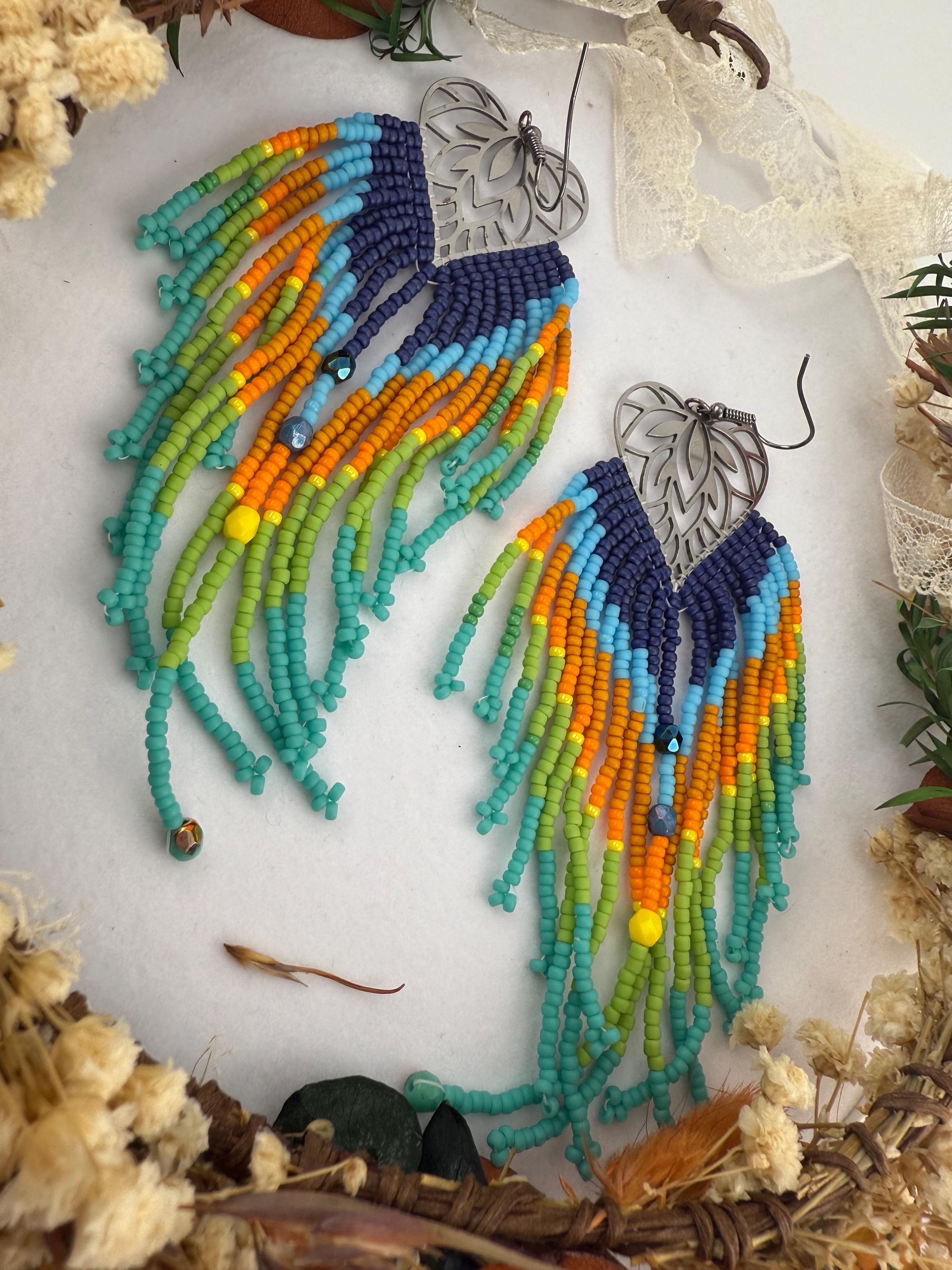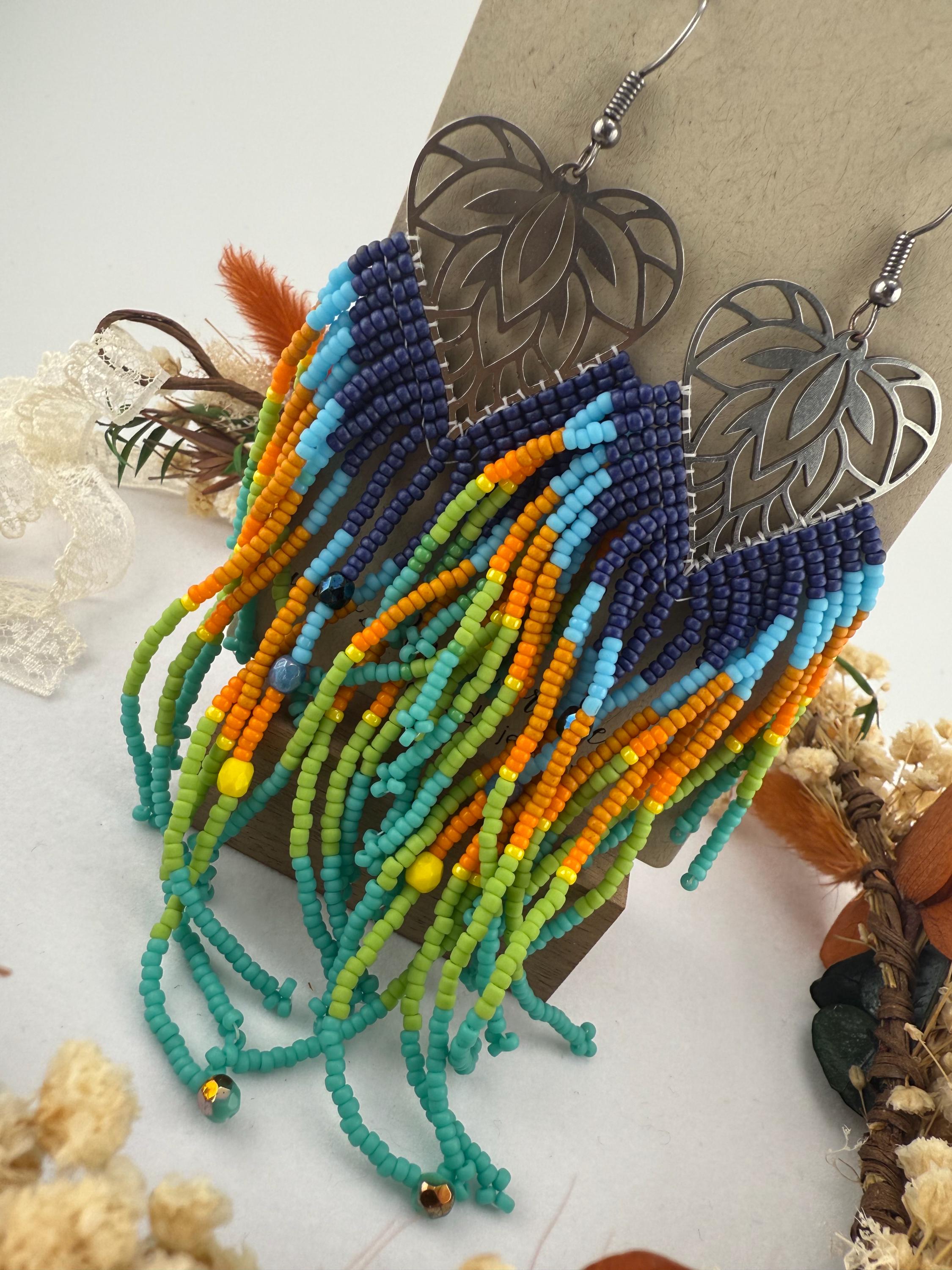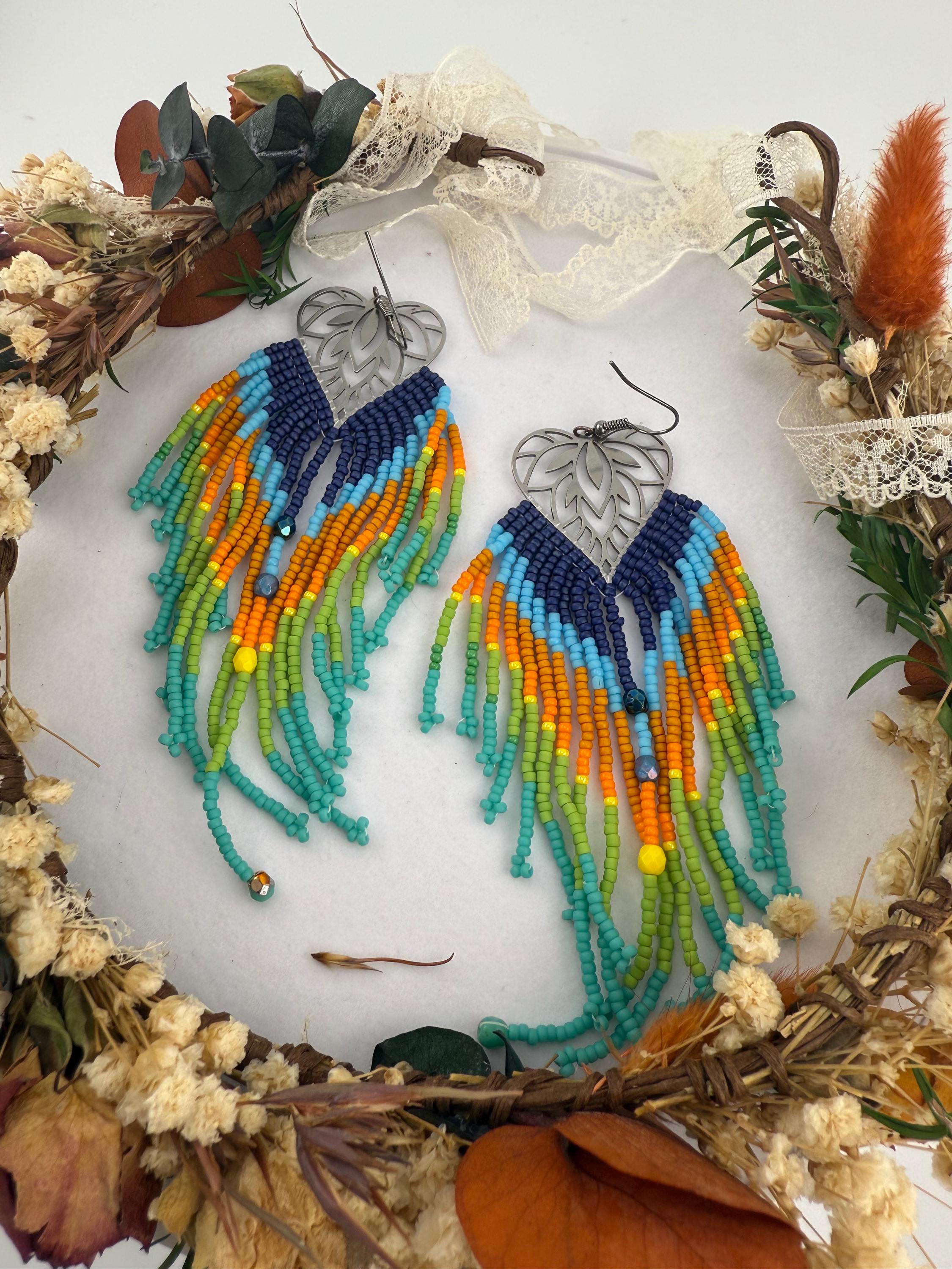 These beaded earrings are not for the weak lobes! These beautifully handmade earrings are made by attaching seed beads in upwards of 4.5 inches to metal frames that look like a leaf. The whole earring finished resembles a leaf or a large feather like finish. The colors of this pair are a Colorado sky blend paired with fire polish beads and look beautiful tied together with the metal framework.
