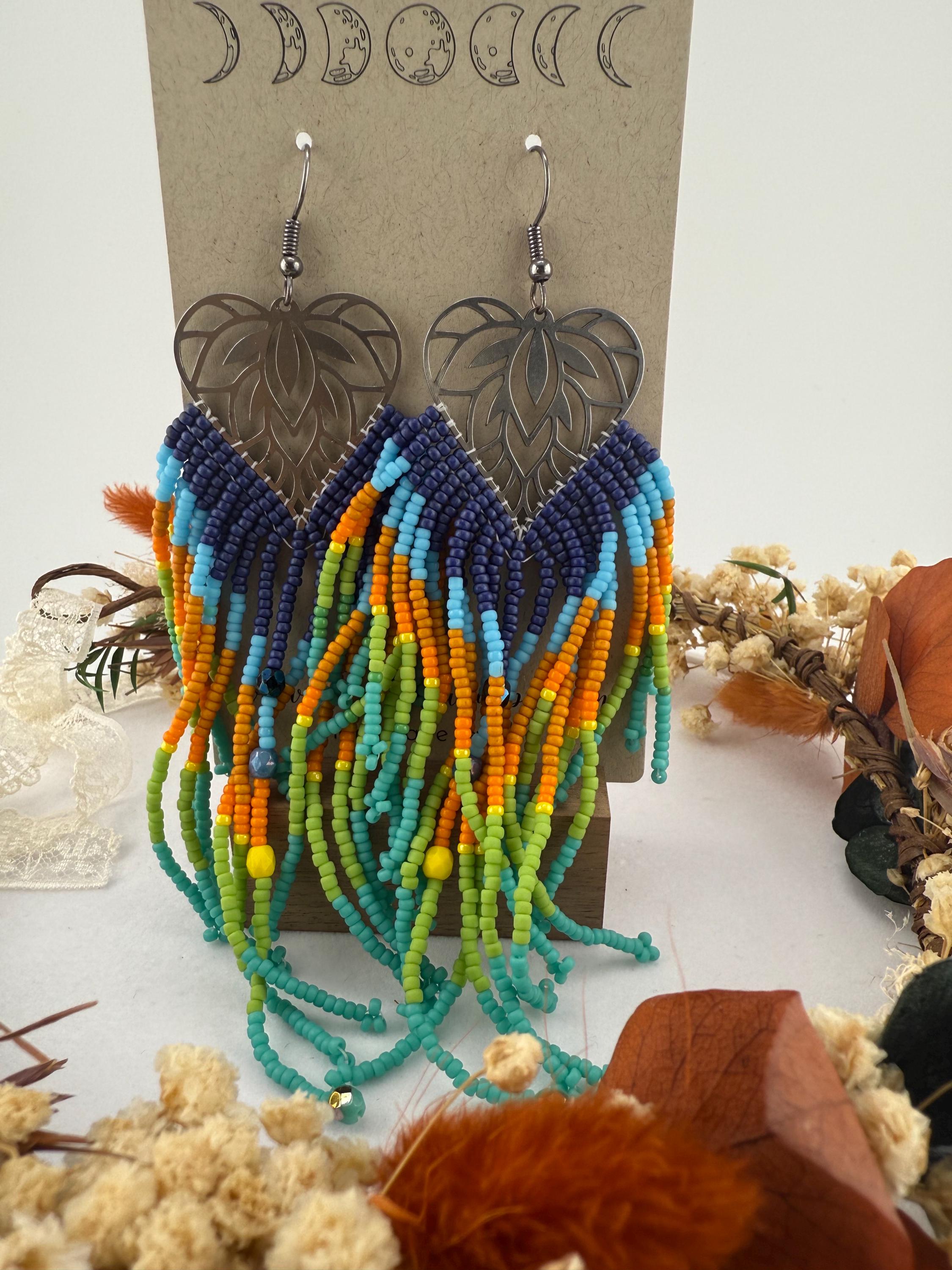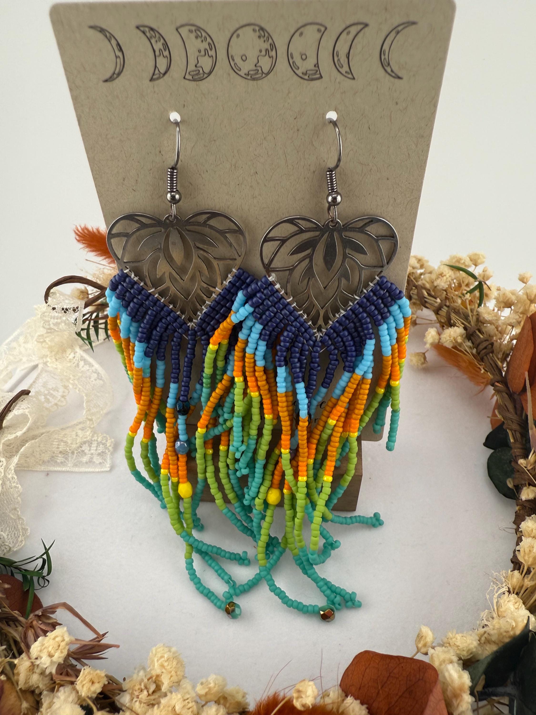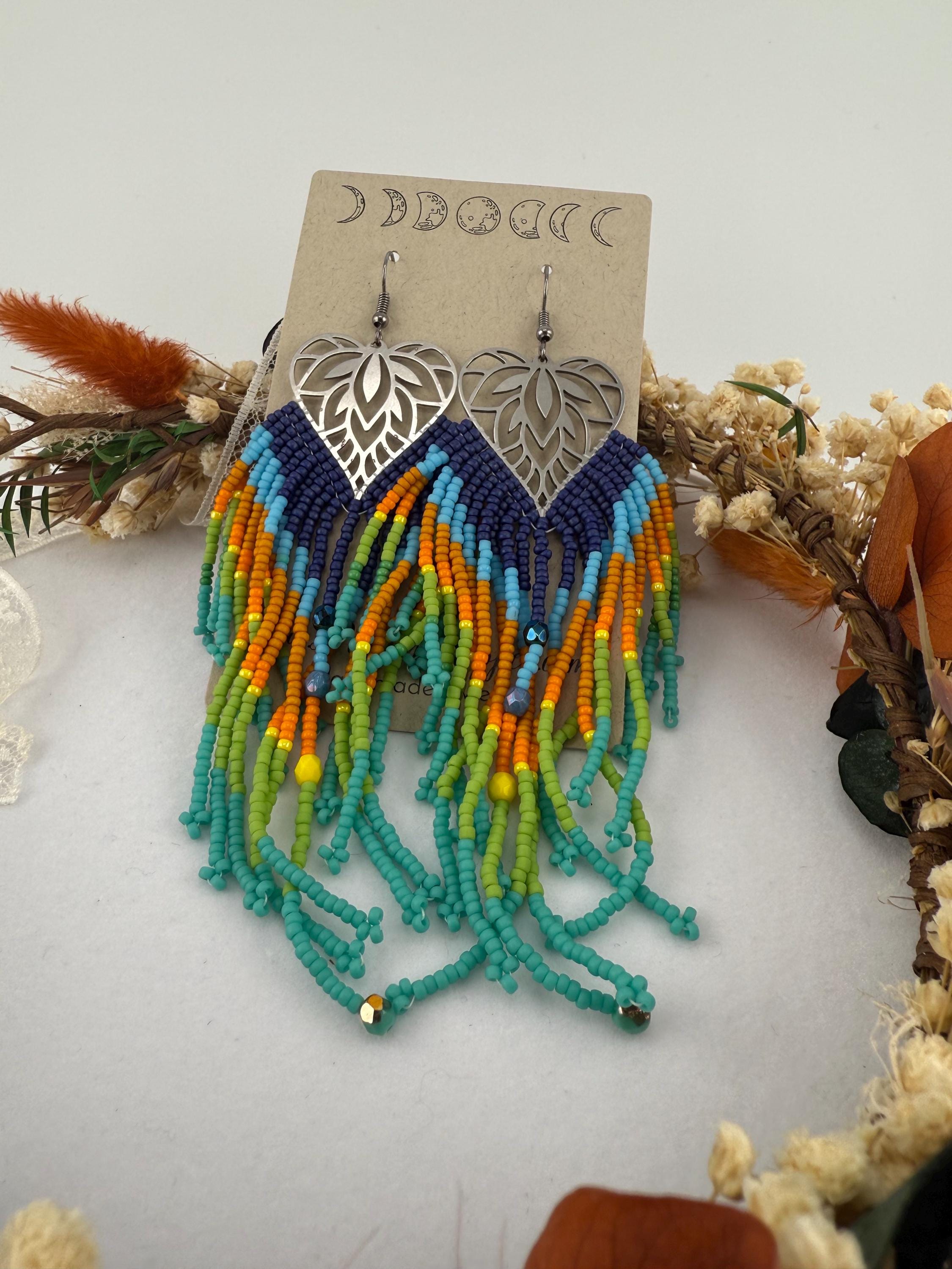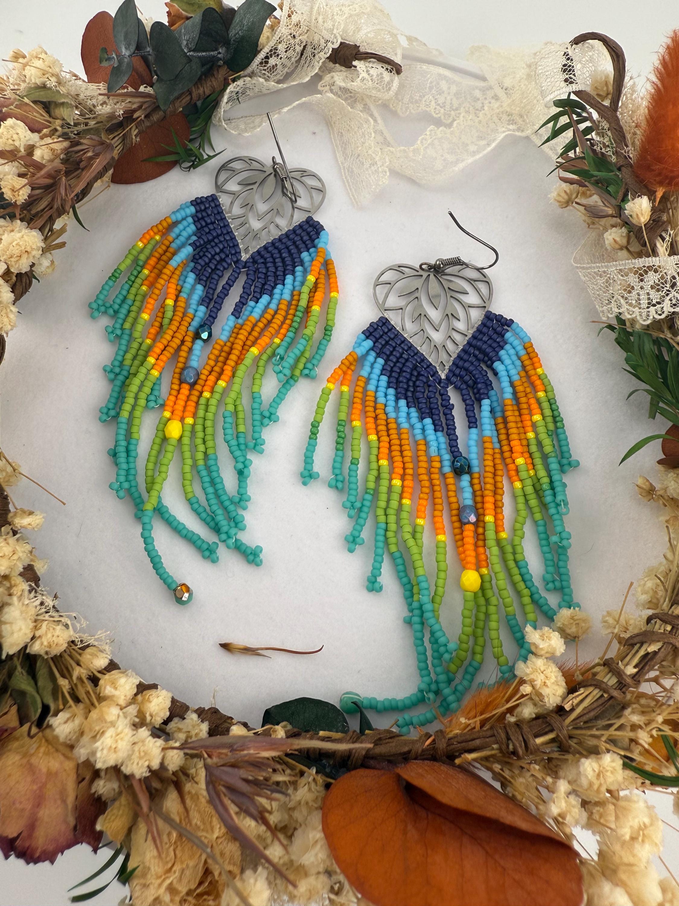 These beaded earrings are not for the weak lobes! These beautifully handmade earrings are made by attaching seed beads in upwards of 4.5 inches to metal frames that look like a leaf. The whole earring finished resembles a leaf or a large feather like finish. The colors of this pair are a Colorado sky blend paired with fire polish beads and look beautiful tied together with the metal framework.