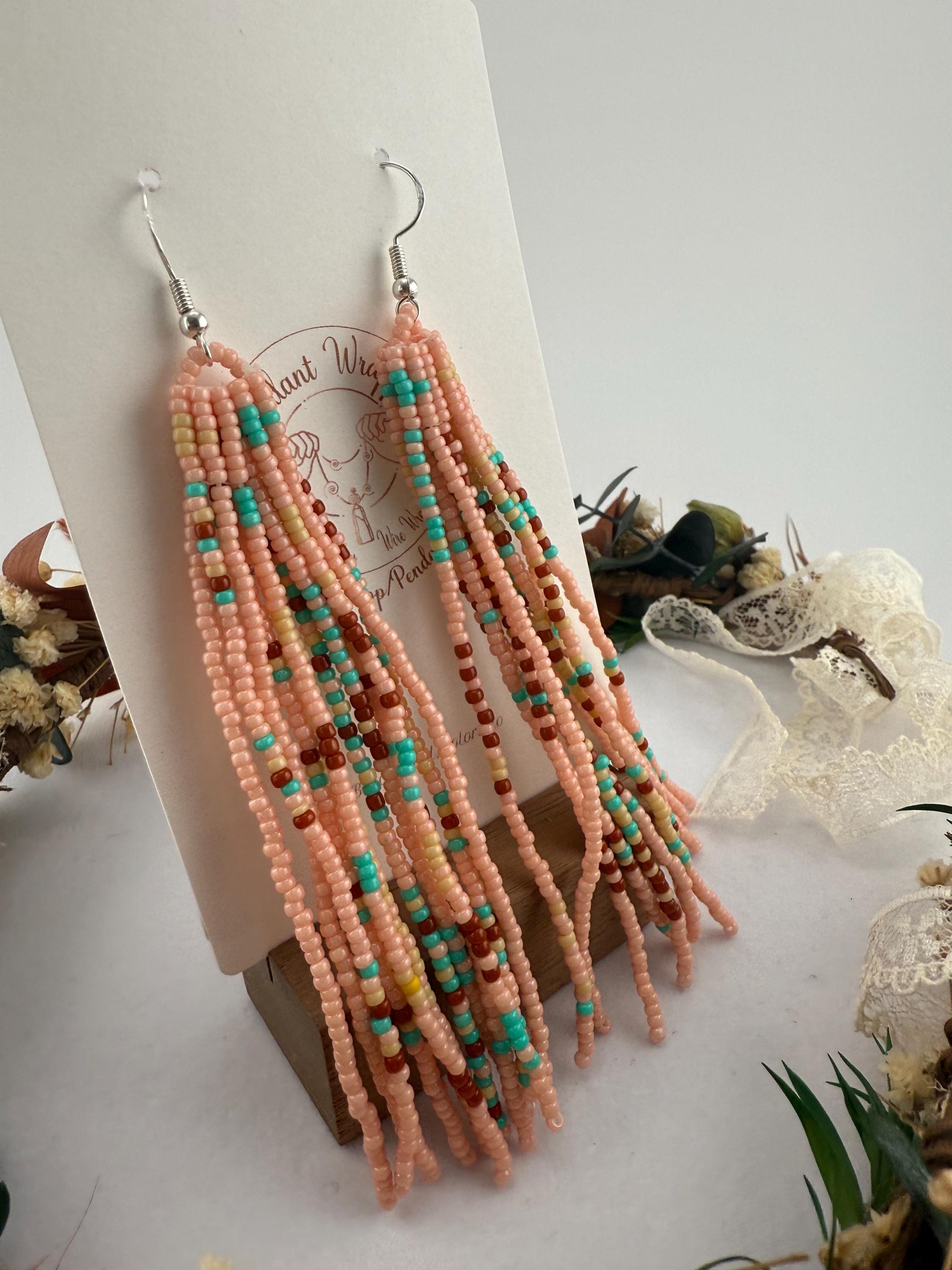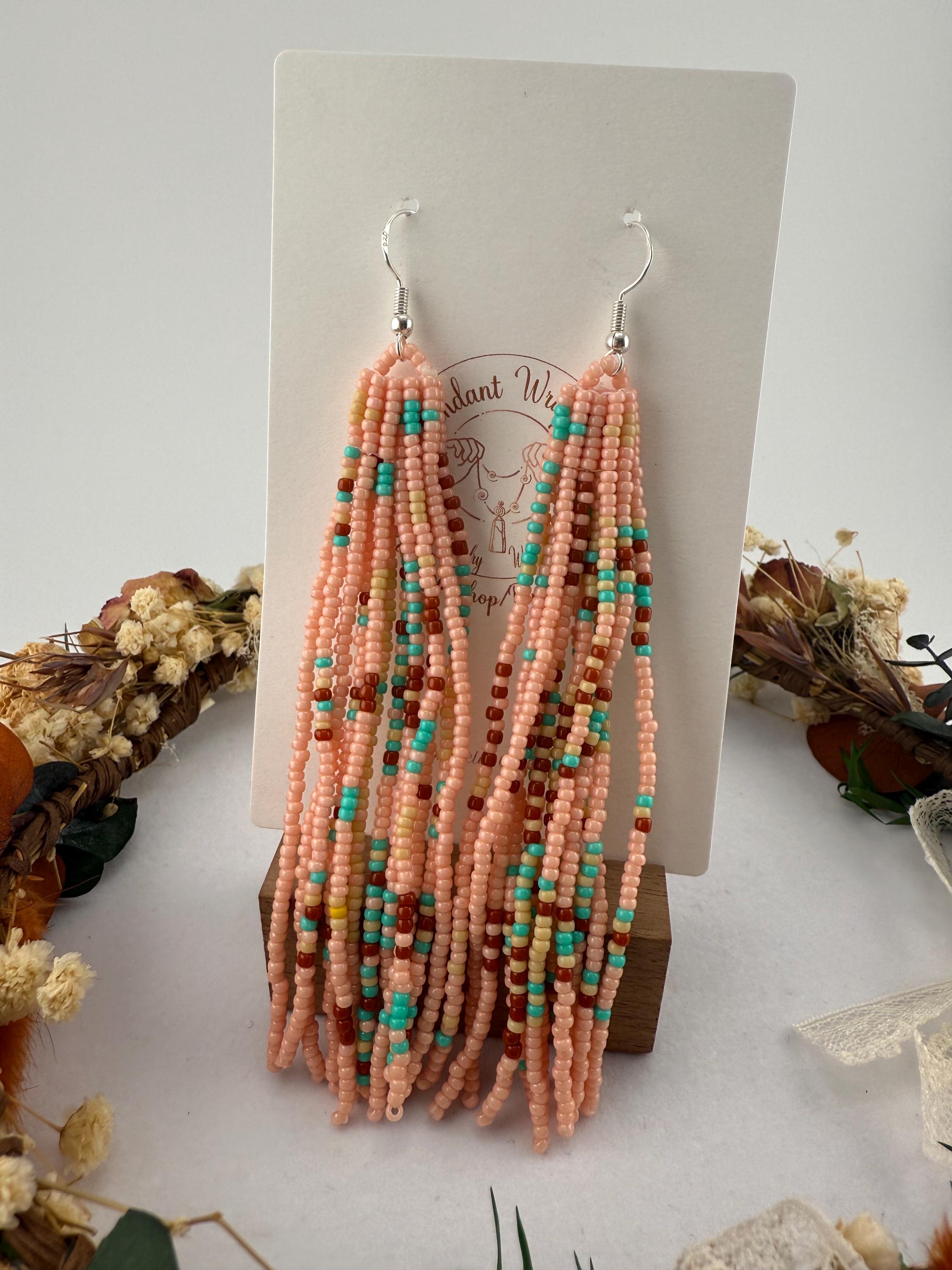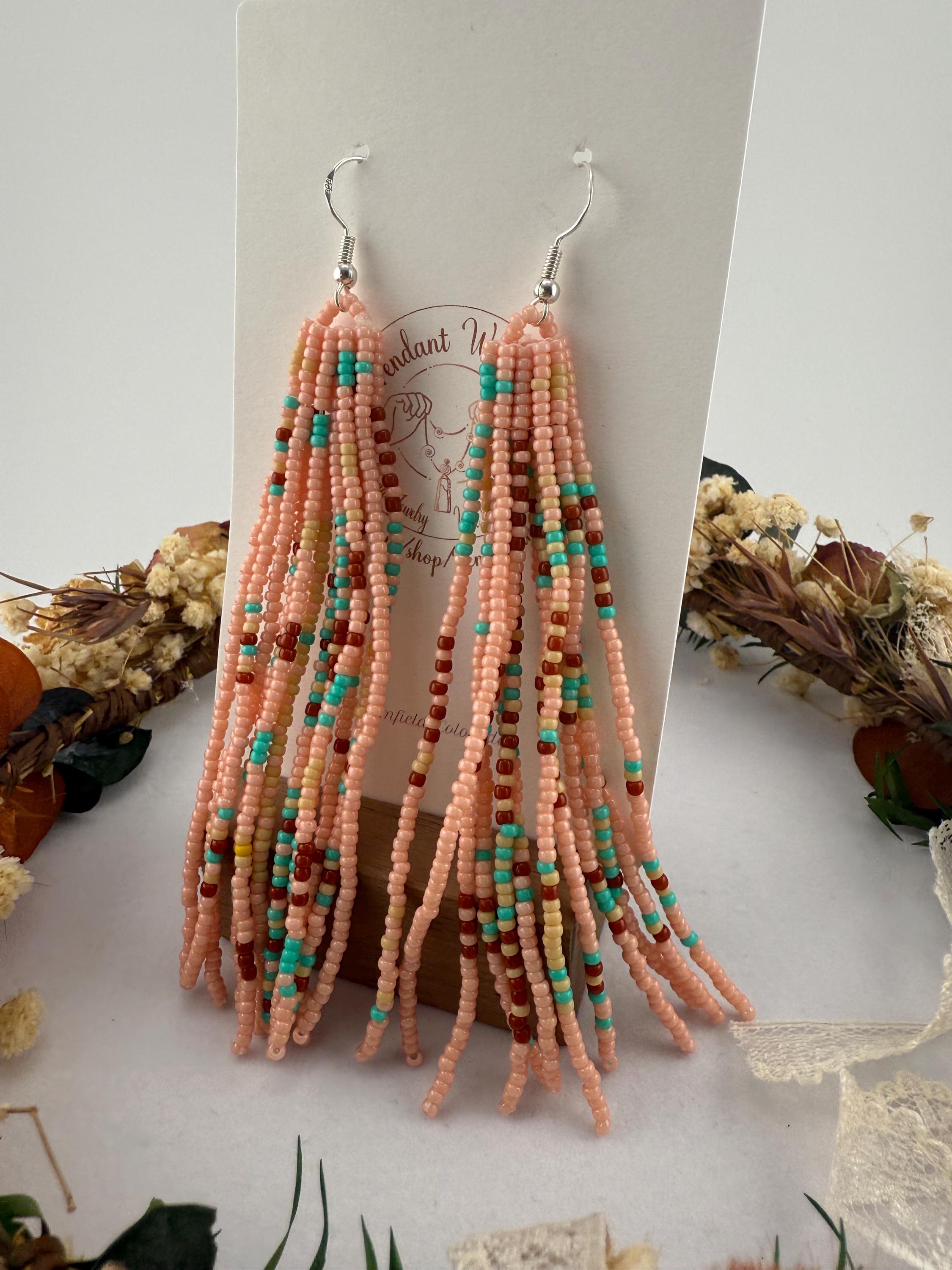These are a pair of hand-made beaded fringe earrings. They are a delightful pattern that is both chic and retro, with an added art flare! Dubbed the deco fringe they are also much lighter then both the classic fringe and the big leaf fringe. They are handmade by me, and come in around 2 hours time to complete. They are not overly heavy, but do hang around 2.5-3.0 inches in length, and are very slim in comparison to other fringe I make. These are perfect for a lighter fringe earring!