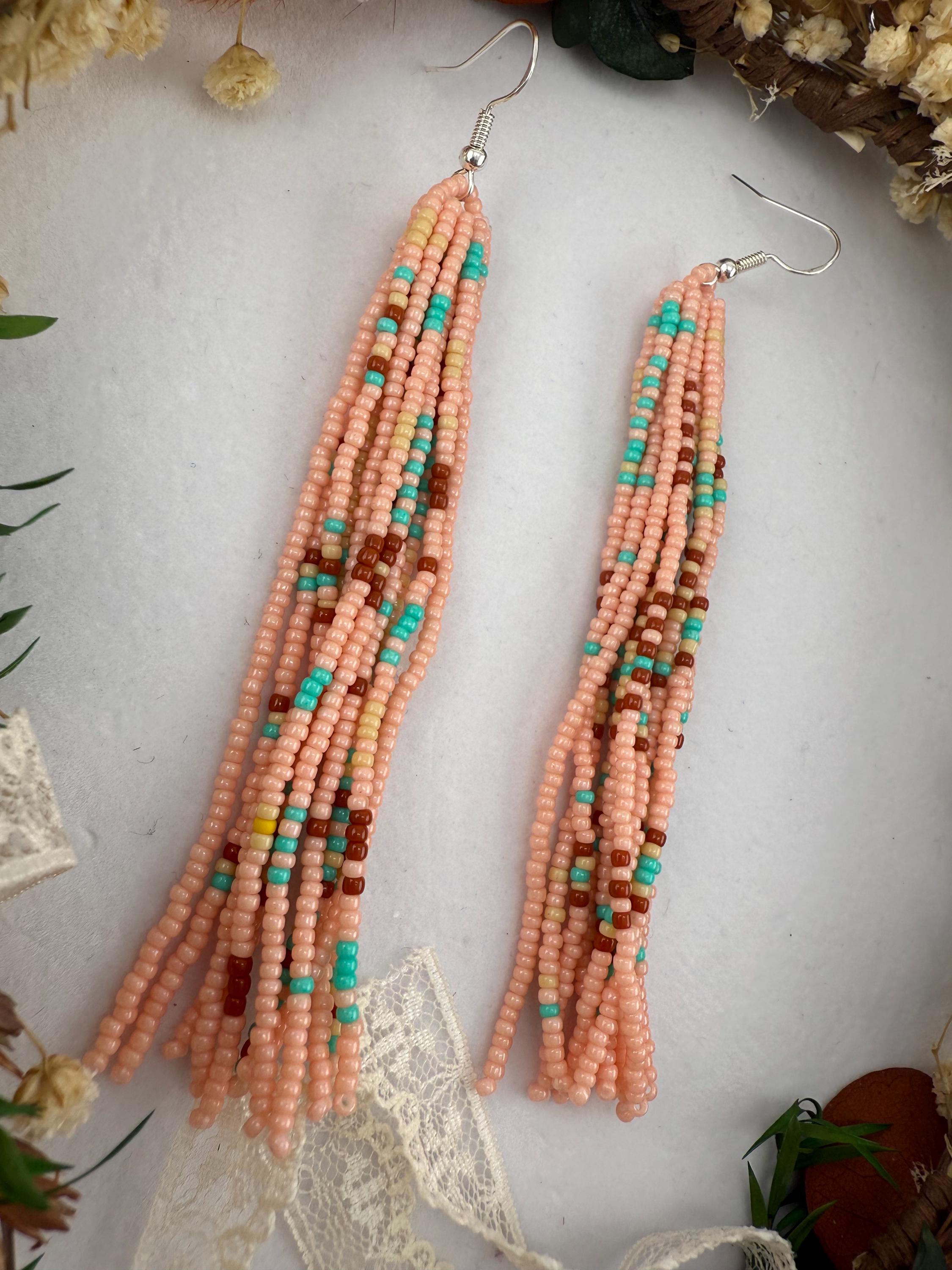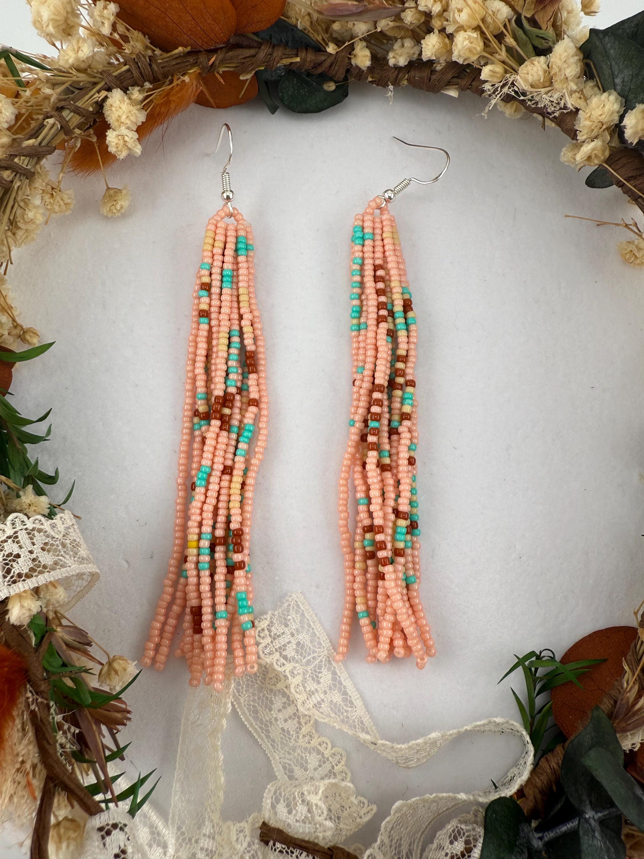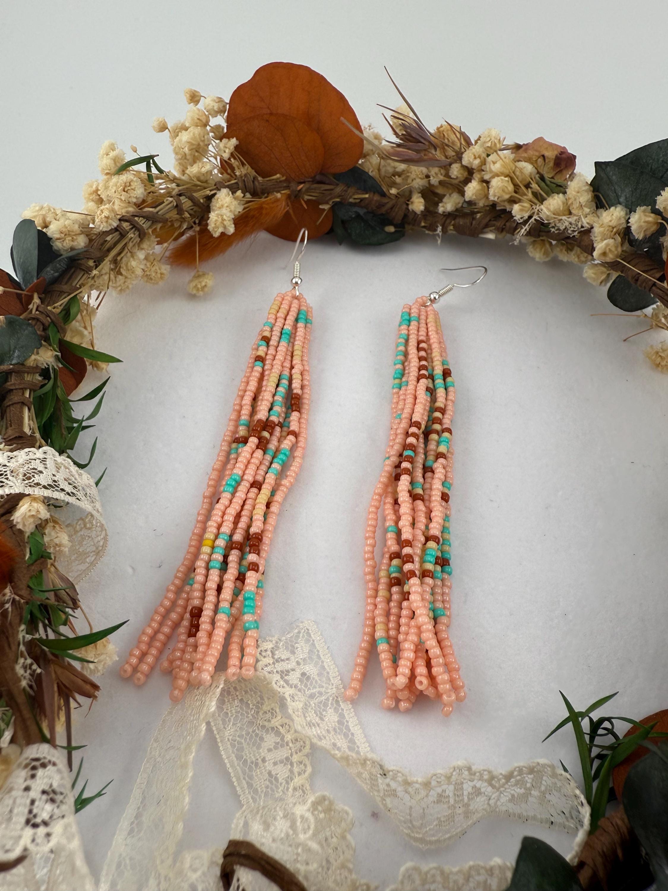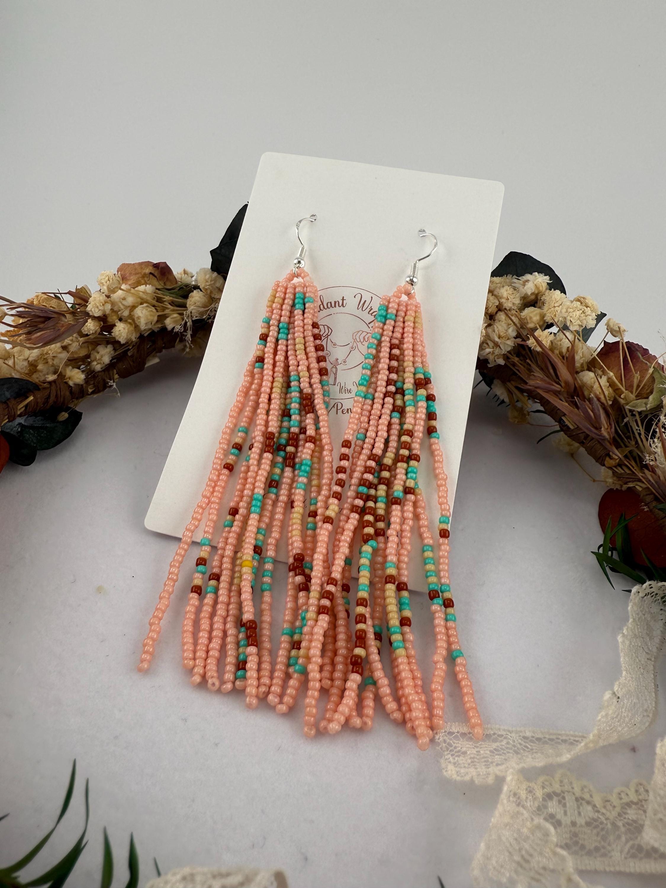 These are a pair of hand-made beaded fringe earrings. They are a delightful pattern that is both chic and retro, with an added art flare! Dubbed the deco fringe they are also much lighter then both the classic fringe and the big leaf fringe. They are handmade by me, and come in around 2 hours time to complete. They are not overly heavy, but do hang around 2.5-3.0 inches in length, and are very slim in comparison to other fringe I make. These are perfect for a lighter fringe earring!