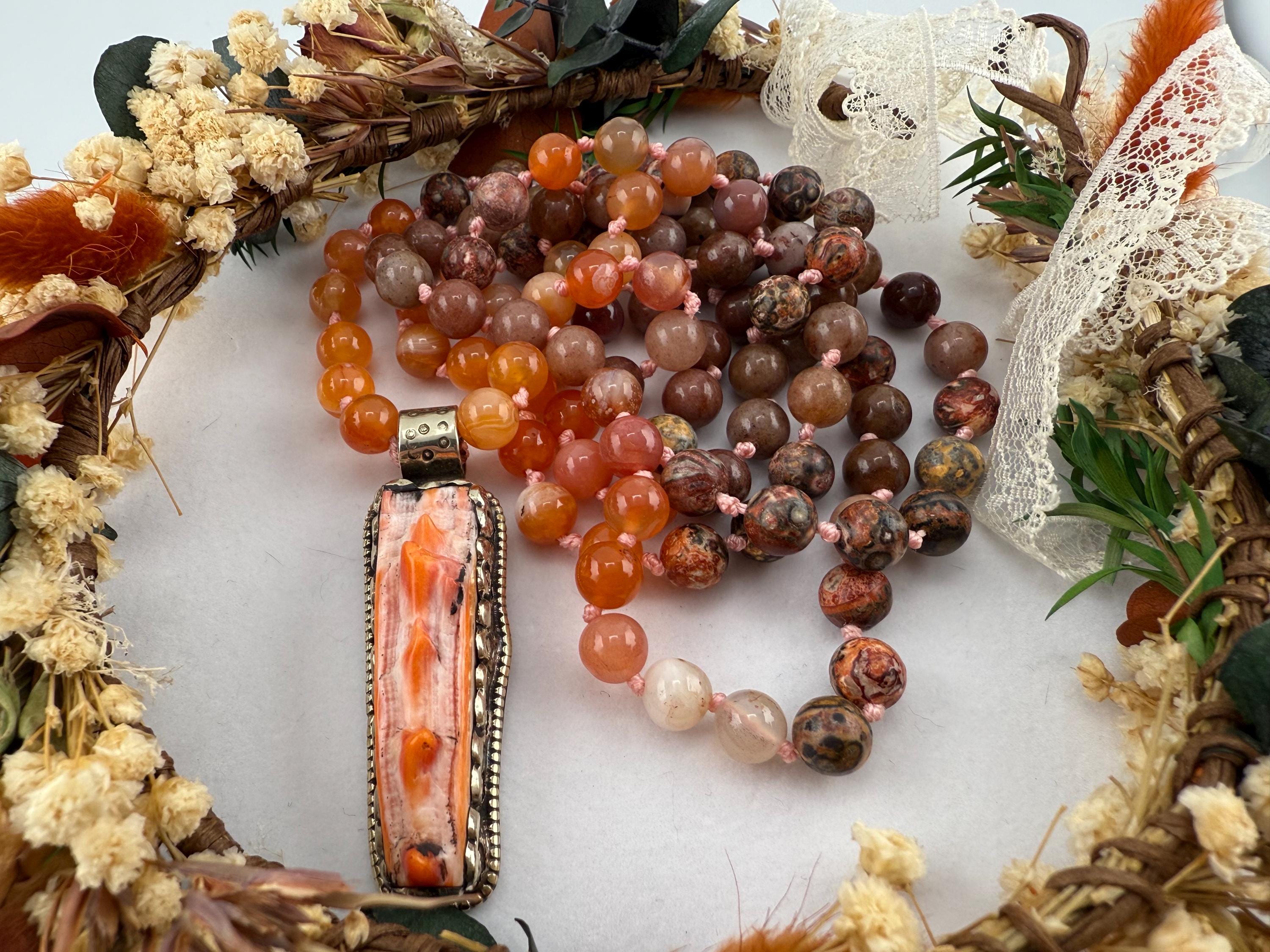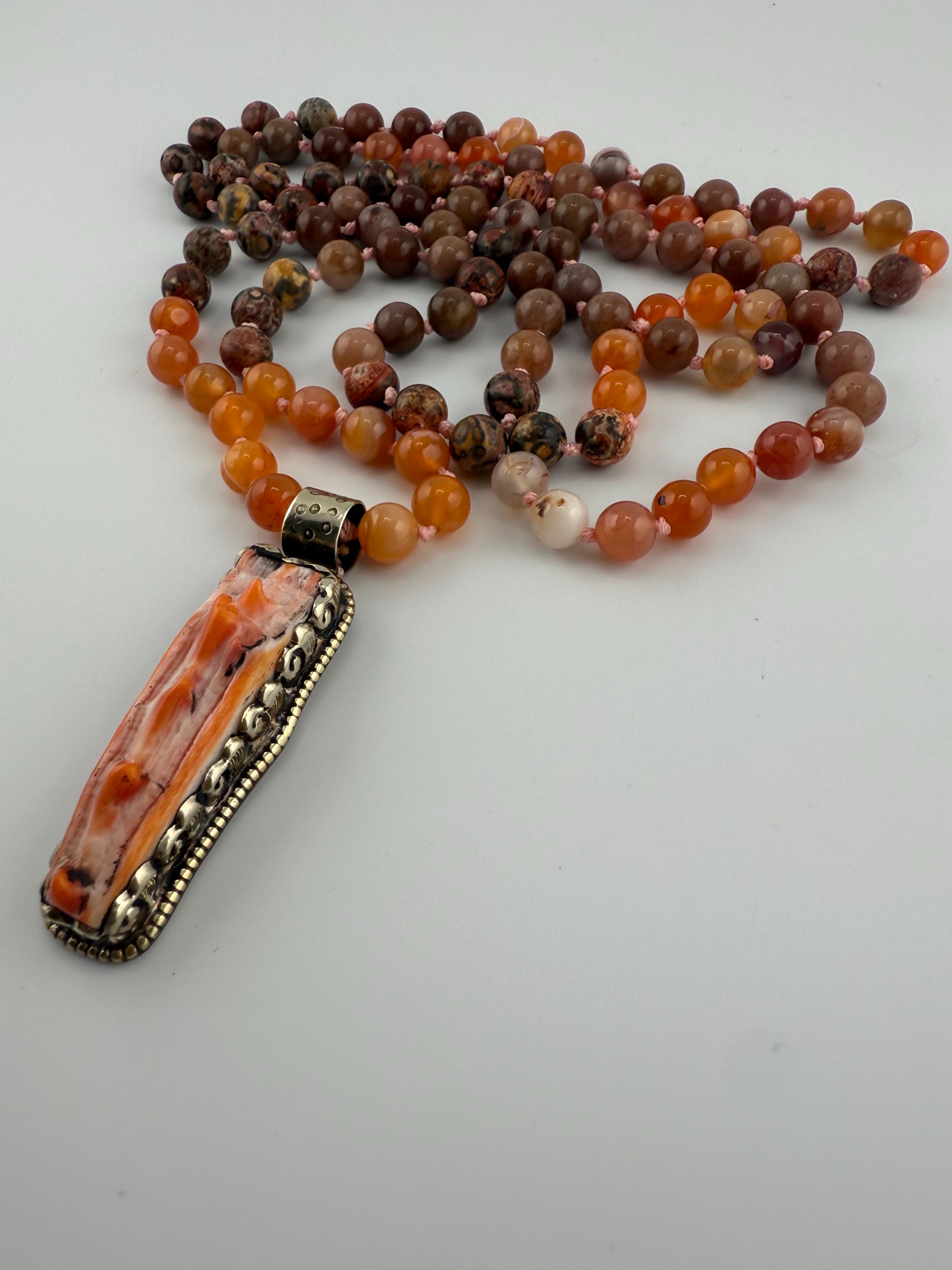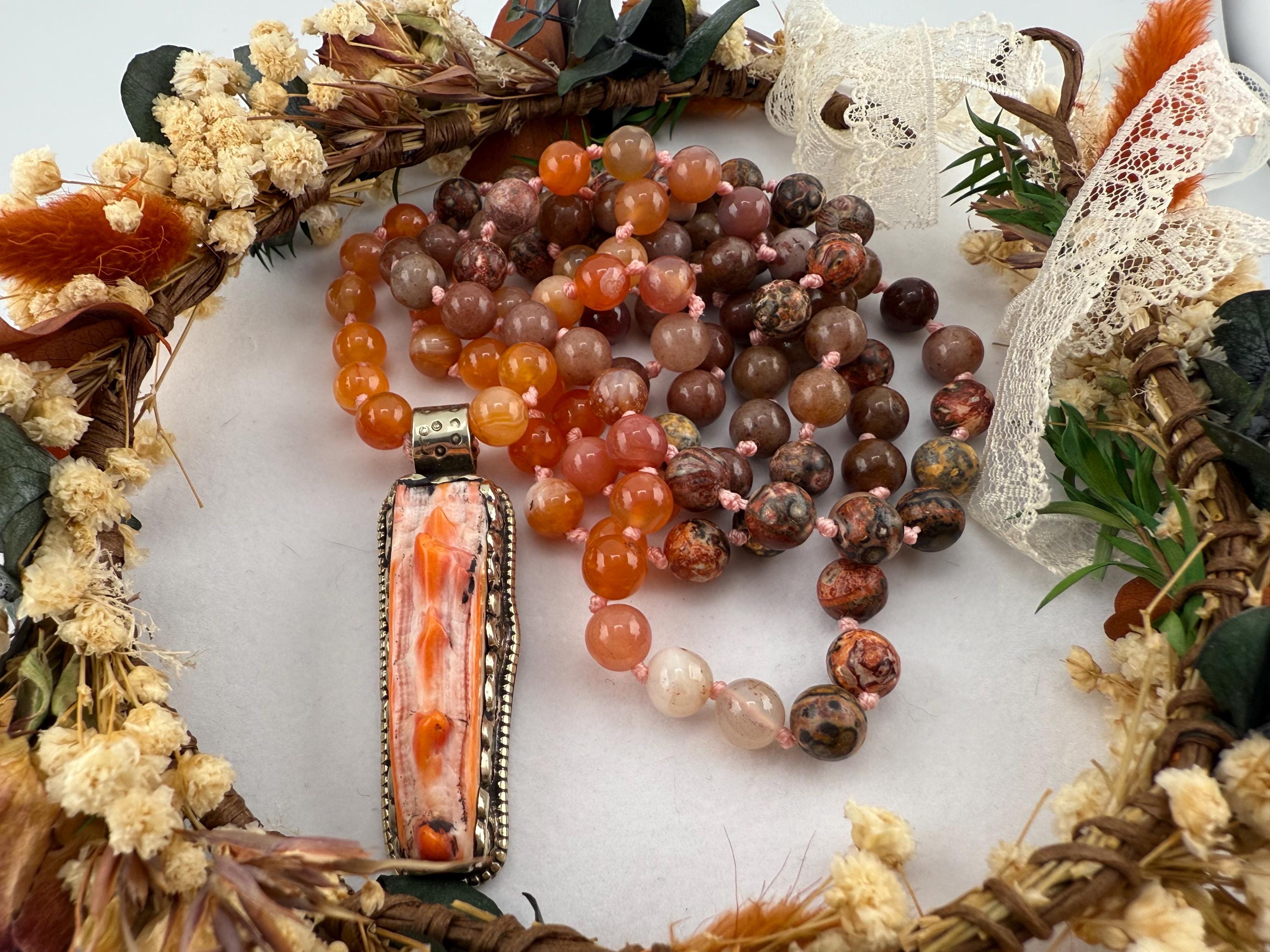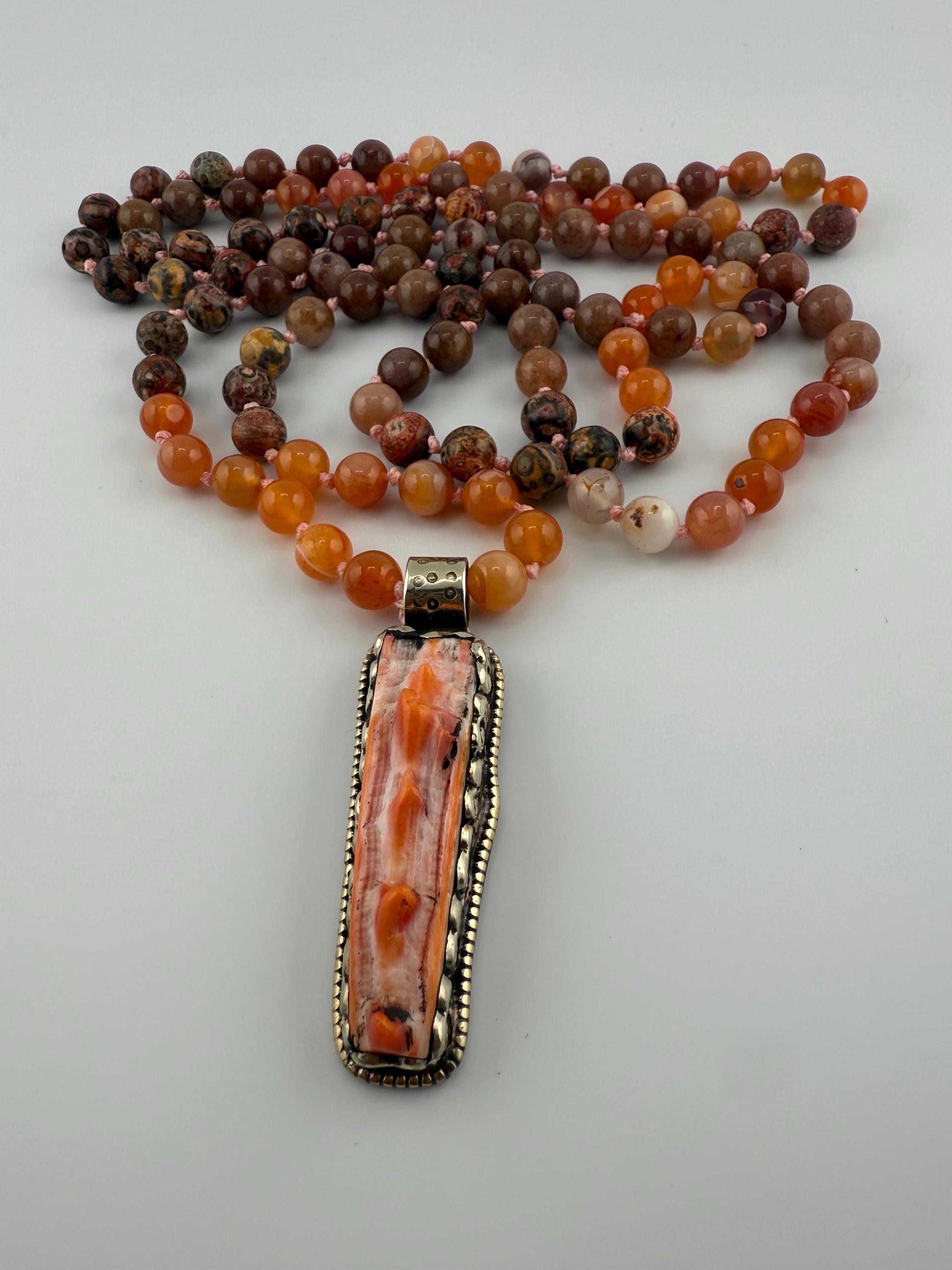 This mala is handled by hand knotting 108 beads onto a thread of string. Combined with vibrant colors of adventurine, coral and rhyolite, this mala is vibrant and beautiful and brings all of the right flavors of good energy. Finished off with a spiny oyster pendant, this piece would surely please anyone.
