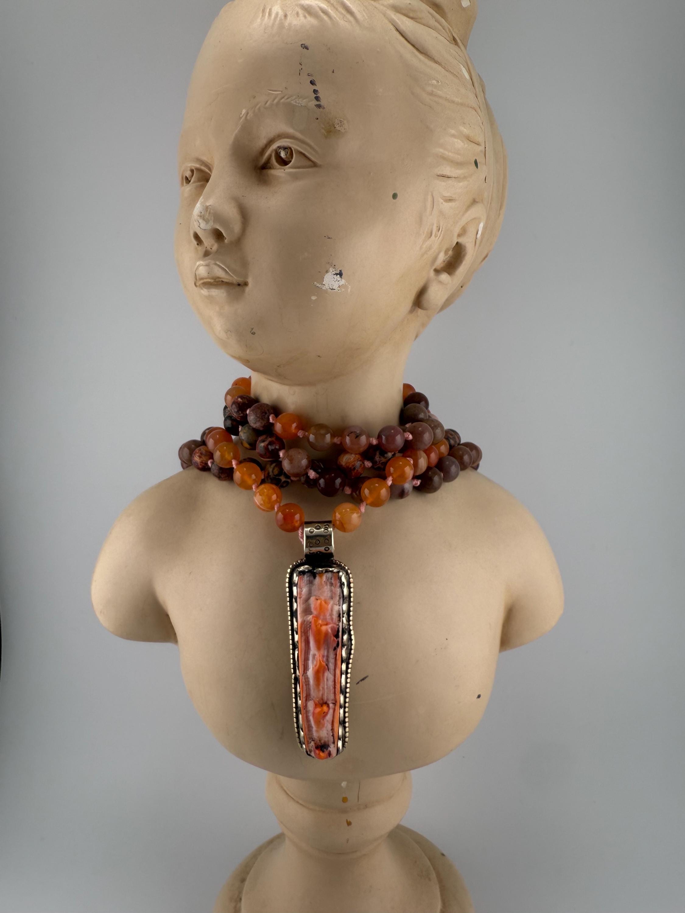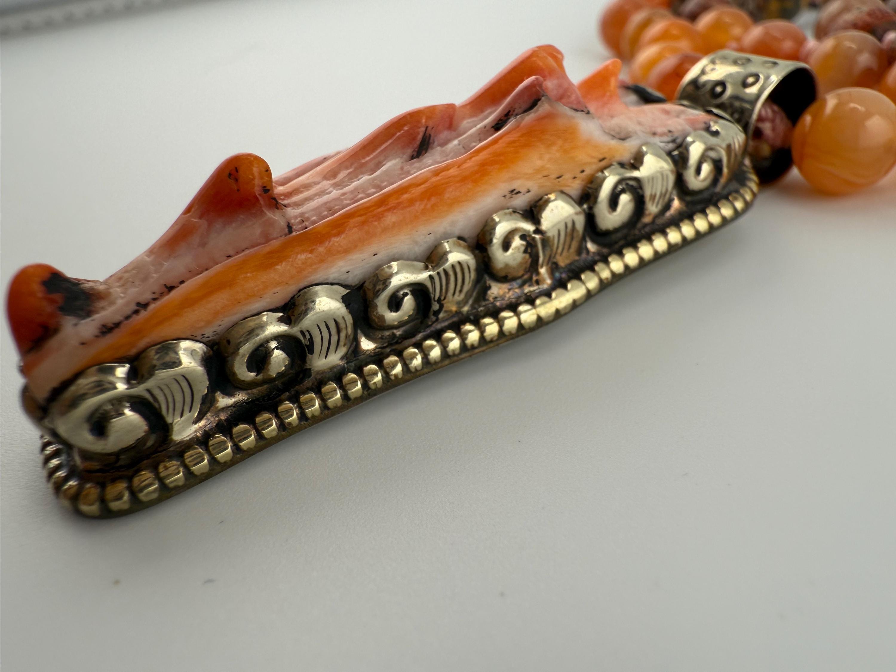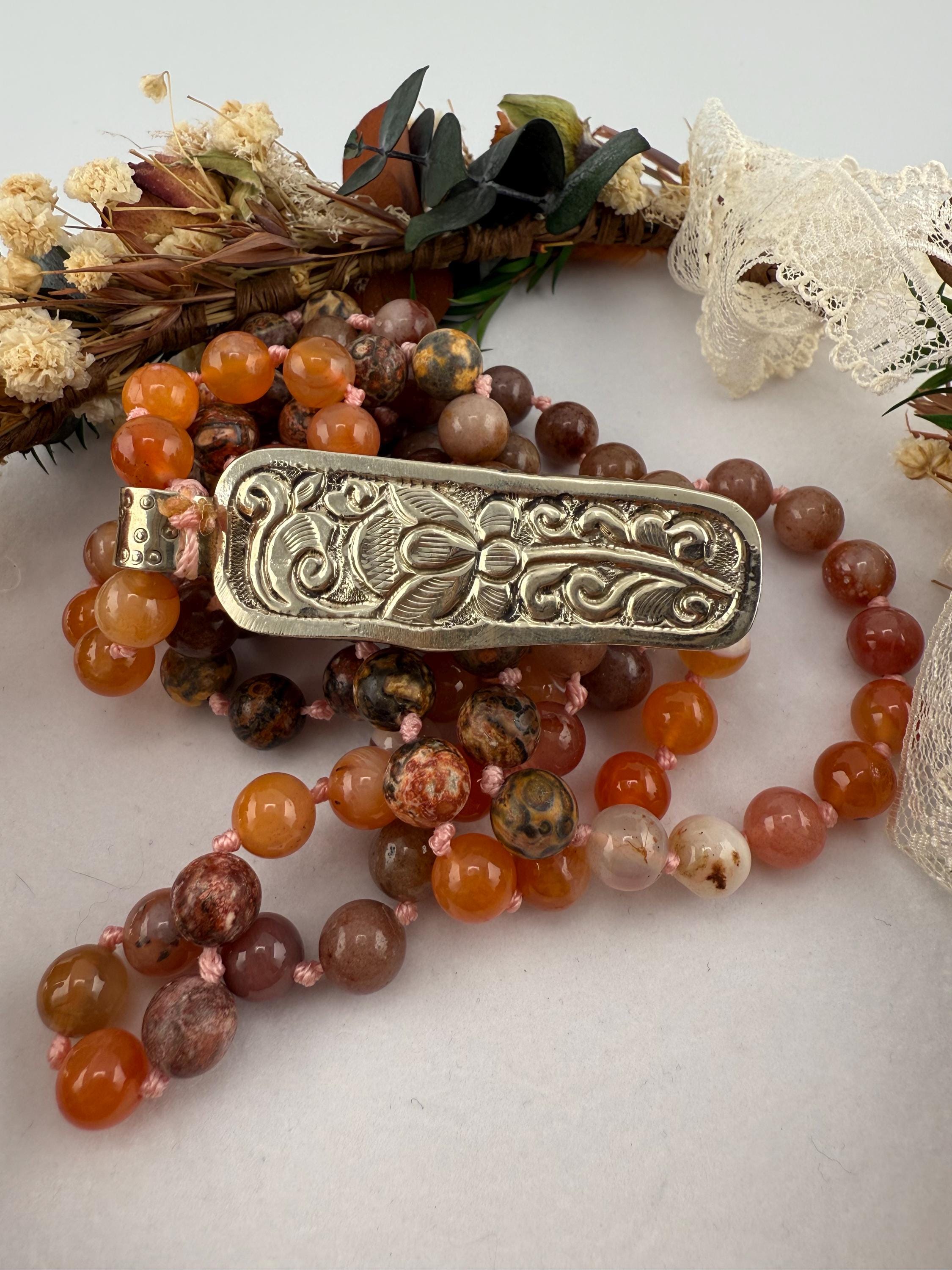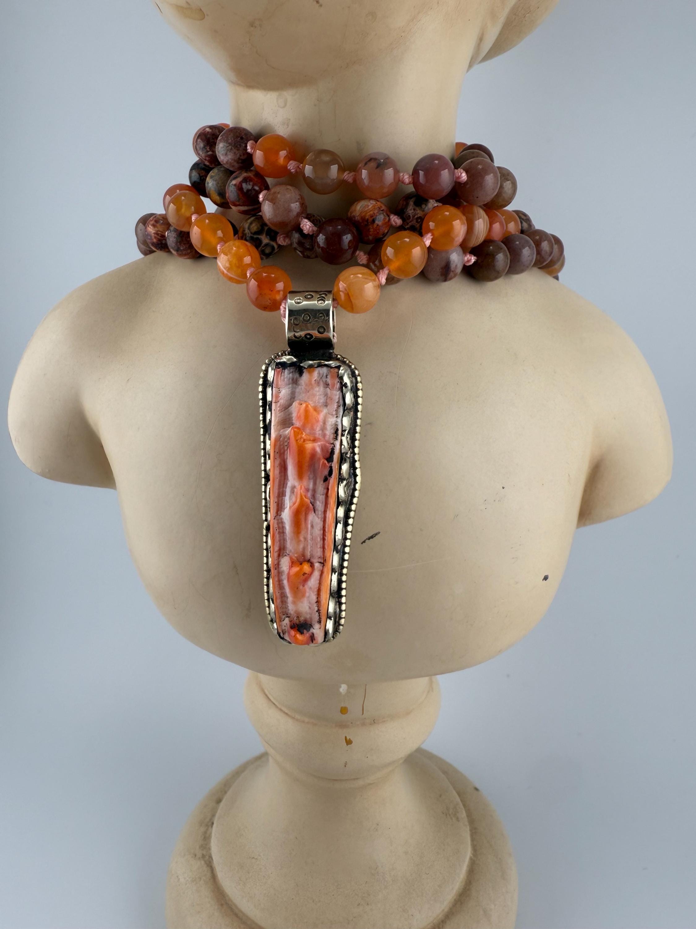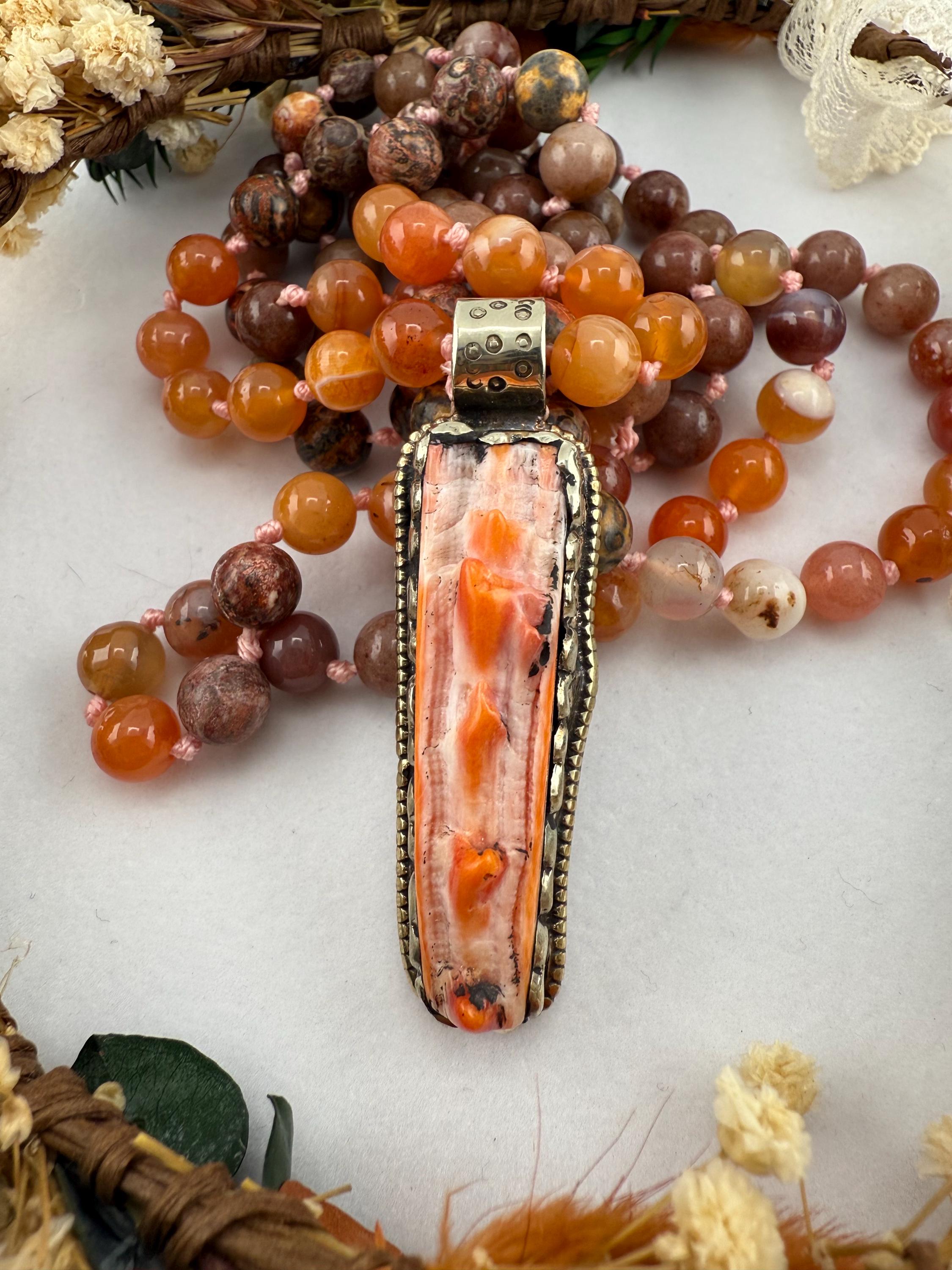 This mala is handled by hand knotting 108 beads onto a thread of string. Combined with vibrant colors of adventurine, coral and rhyolite, this mala is vibrant and beautiful and brings all of the right flavors of good energy. Finished off with a spiny oyster pendant, this piece would surely please anyone.
