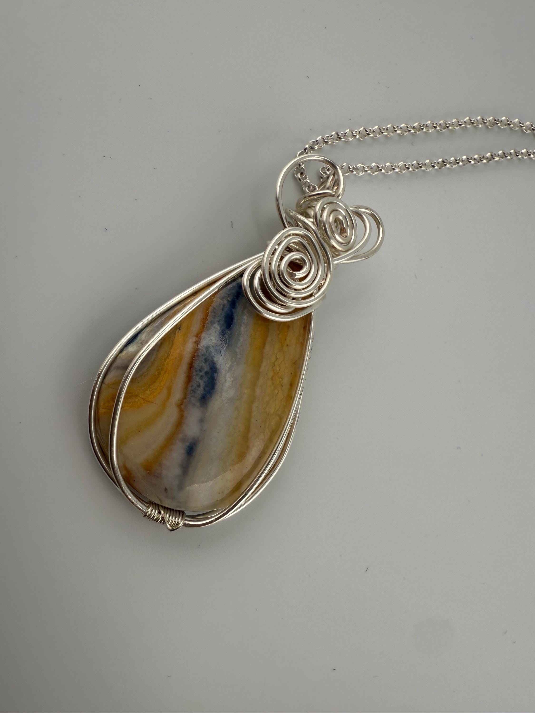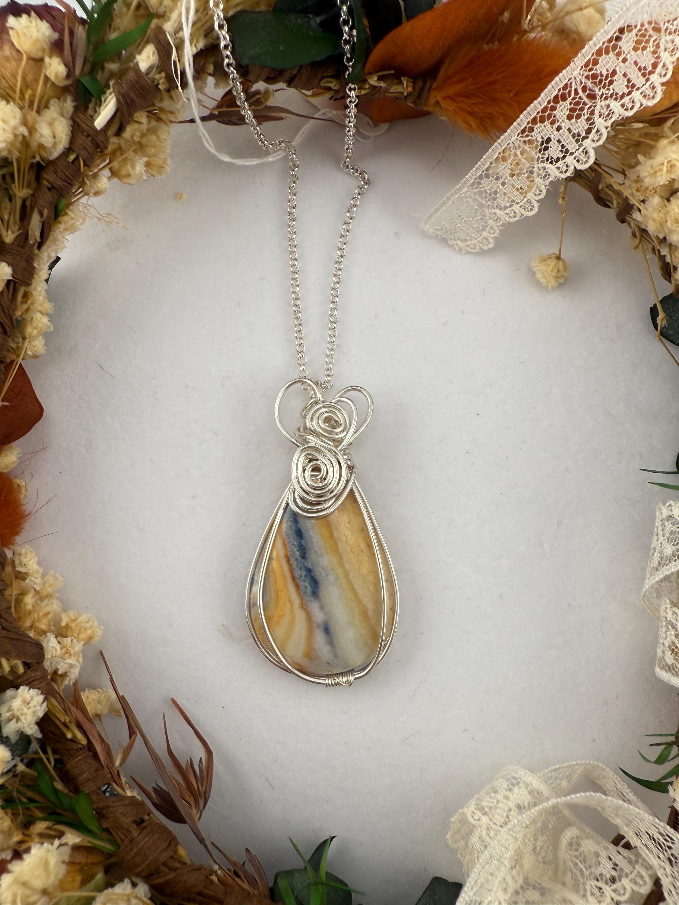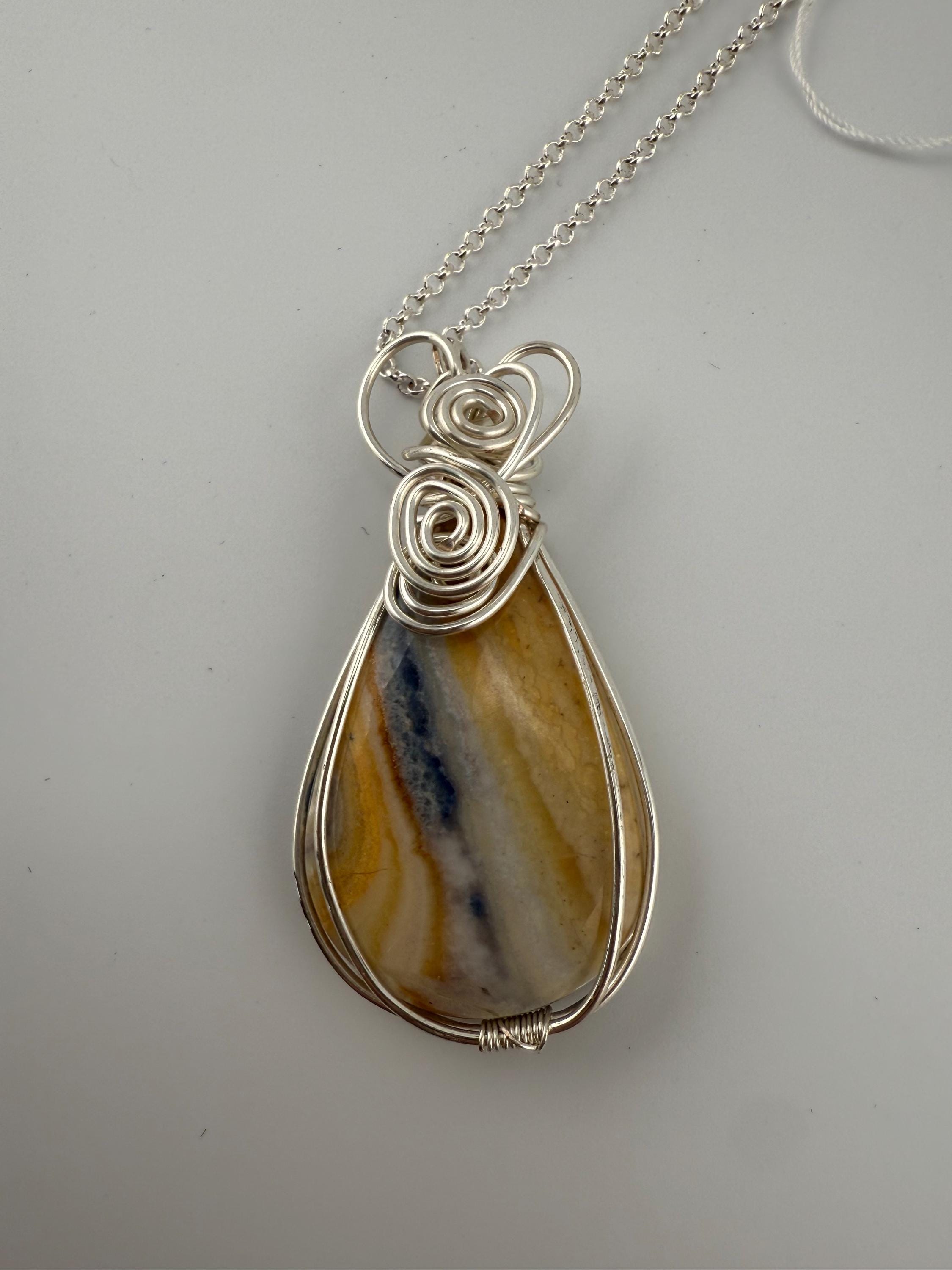 This is a beautiful and large Scheelite pendant wrapped in a silver non tarnish wire and then adorned to a plated silver chain. Piece is quite lovely, and larger then some other pendants I sell. Pendant is vibrantly colorful with shades of blue and orange and white whimsically intertwined. Similar to many of my handmade wire wrapped pieces, she is finished with a beautiful heart at the top.