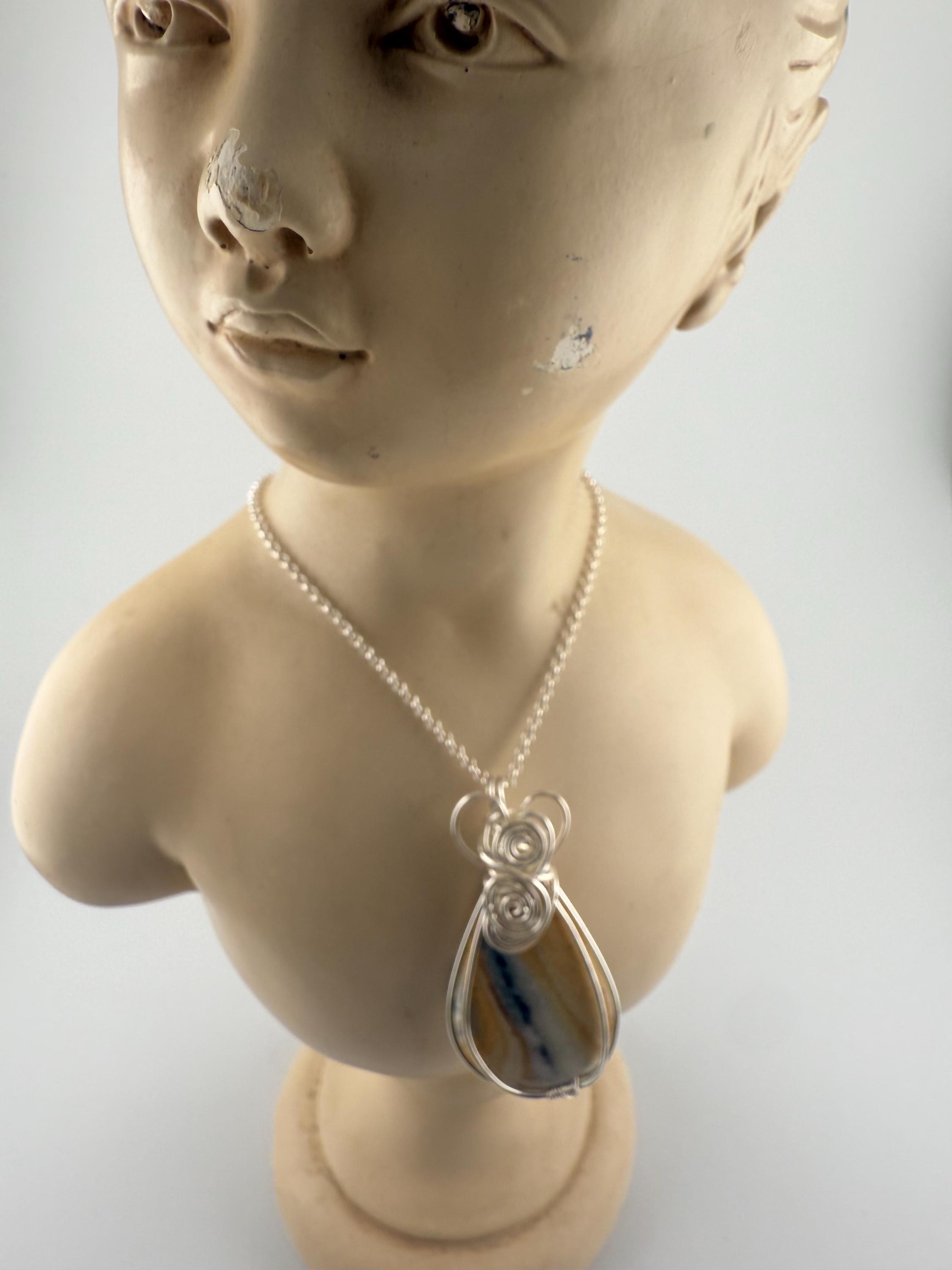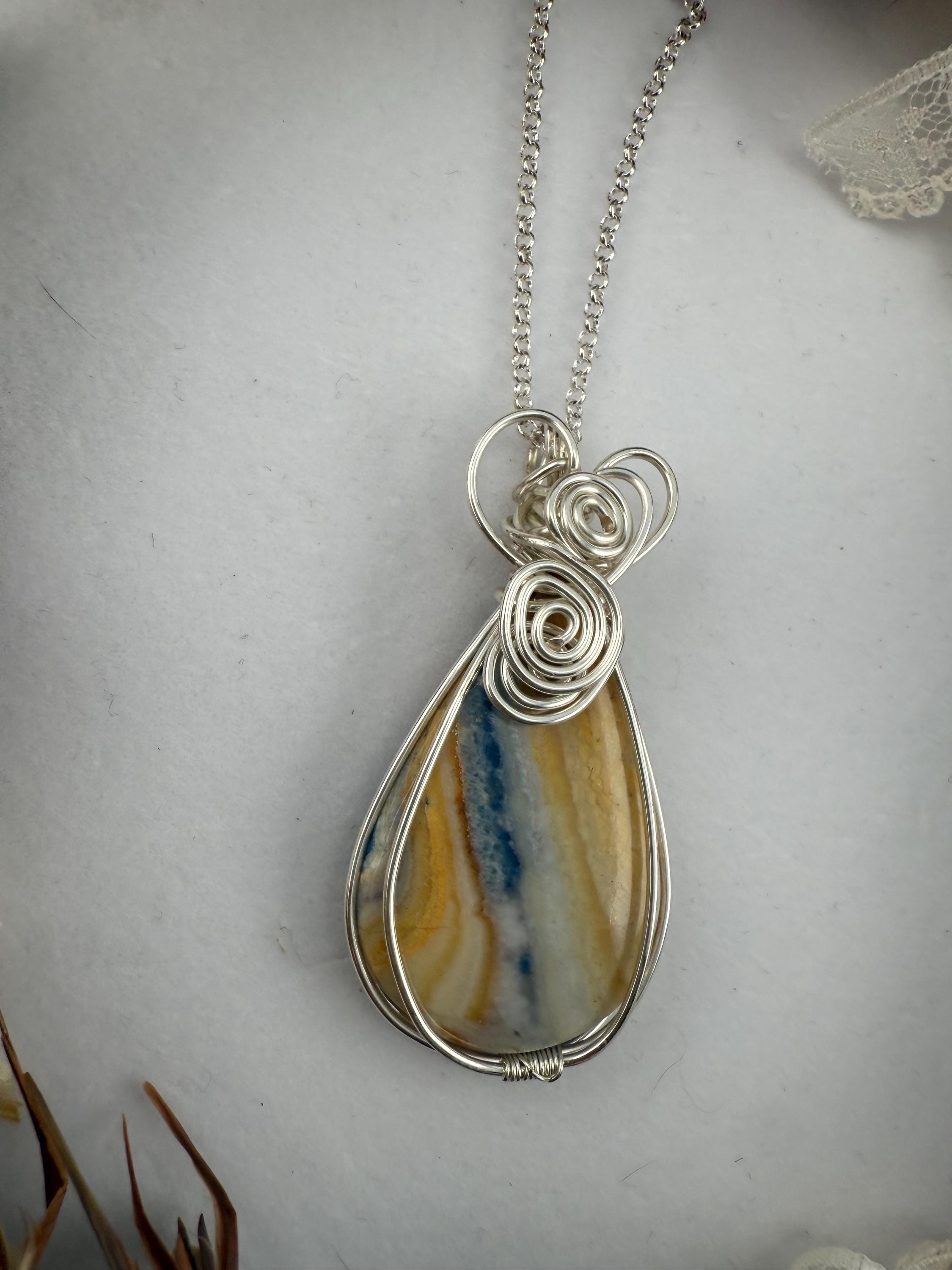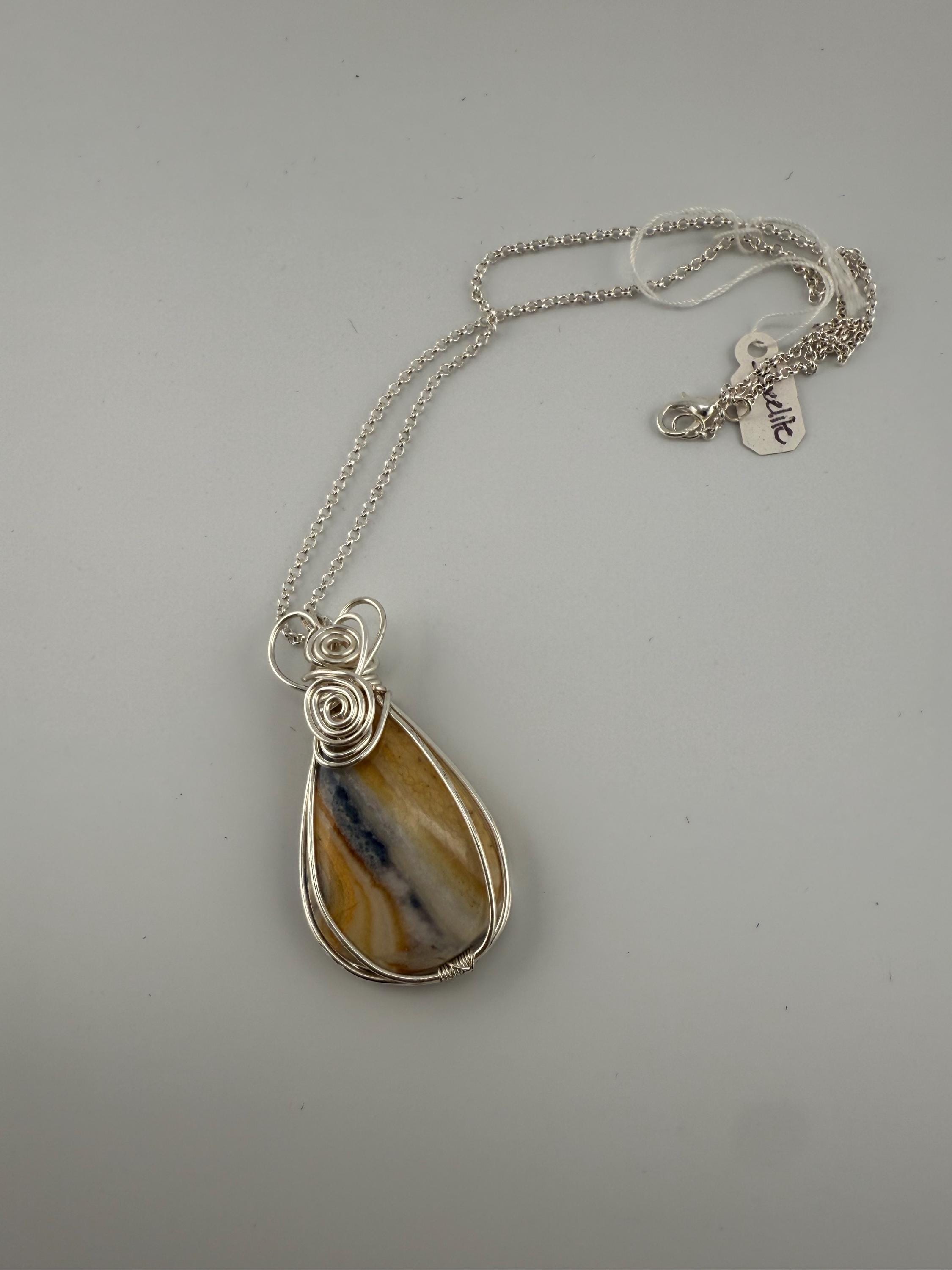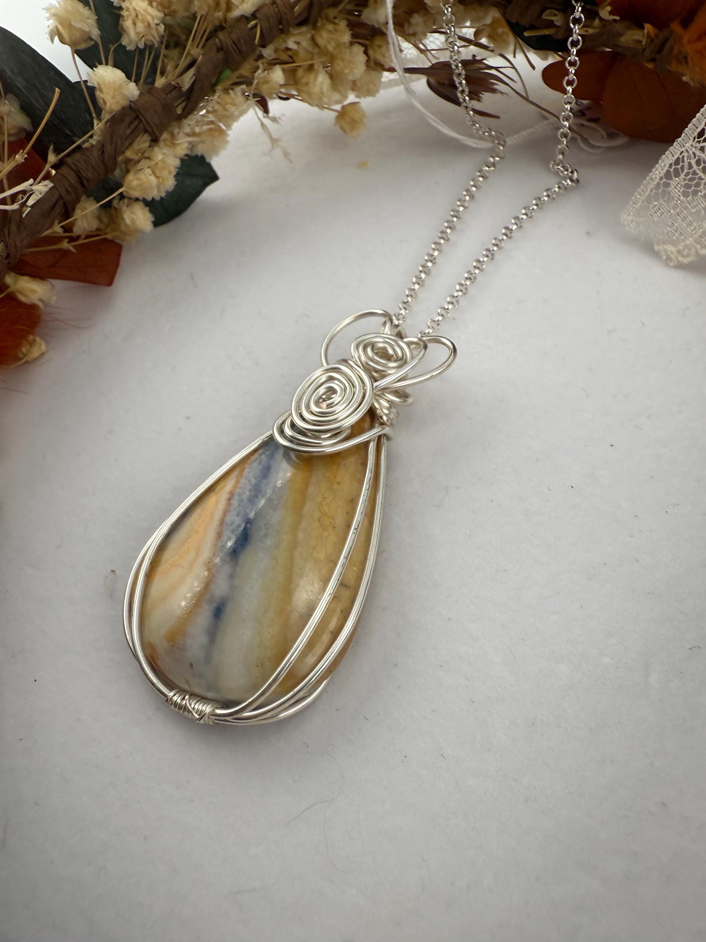 This is a beautiful and large Scheelite pendant wrapped in a silver non tarnish wire and then adorned to a plated silver chain. Piece is quite lovely, and larger then some other pendants I sell. Pendant is vibrantly colorful with shades of blue and orange and white whimsically intertwined. Similar to many of my handmade wire wrapped pieces, she is finished with a beautiful heart at the top.