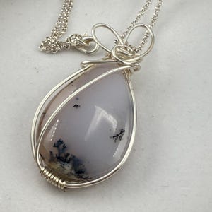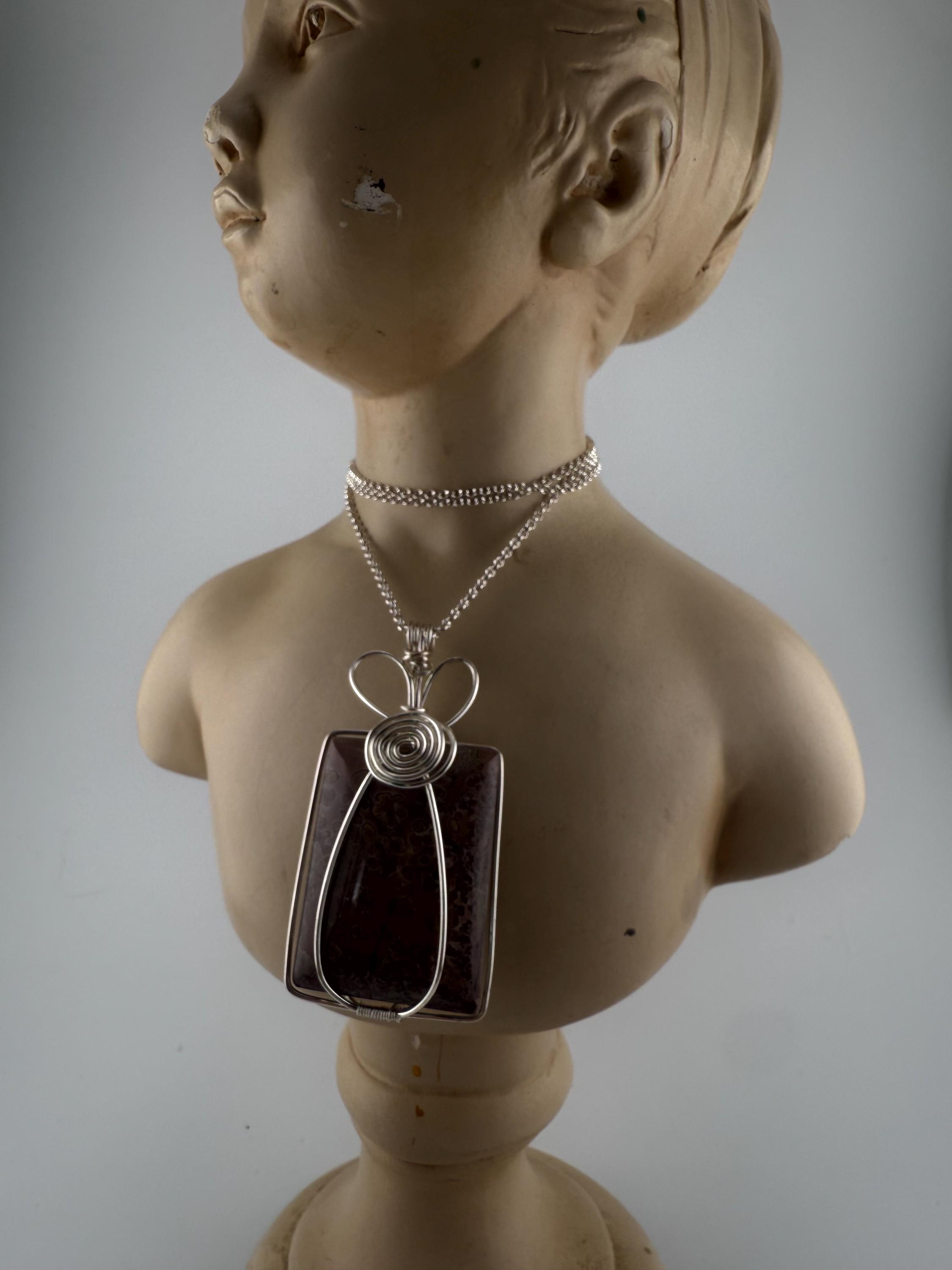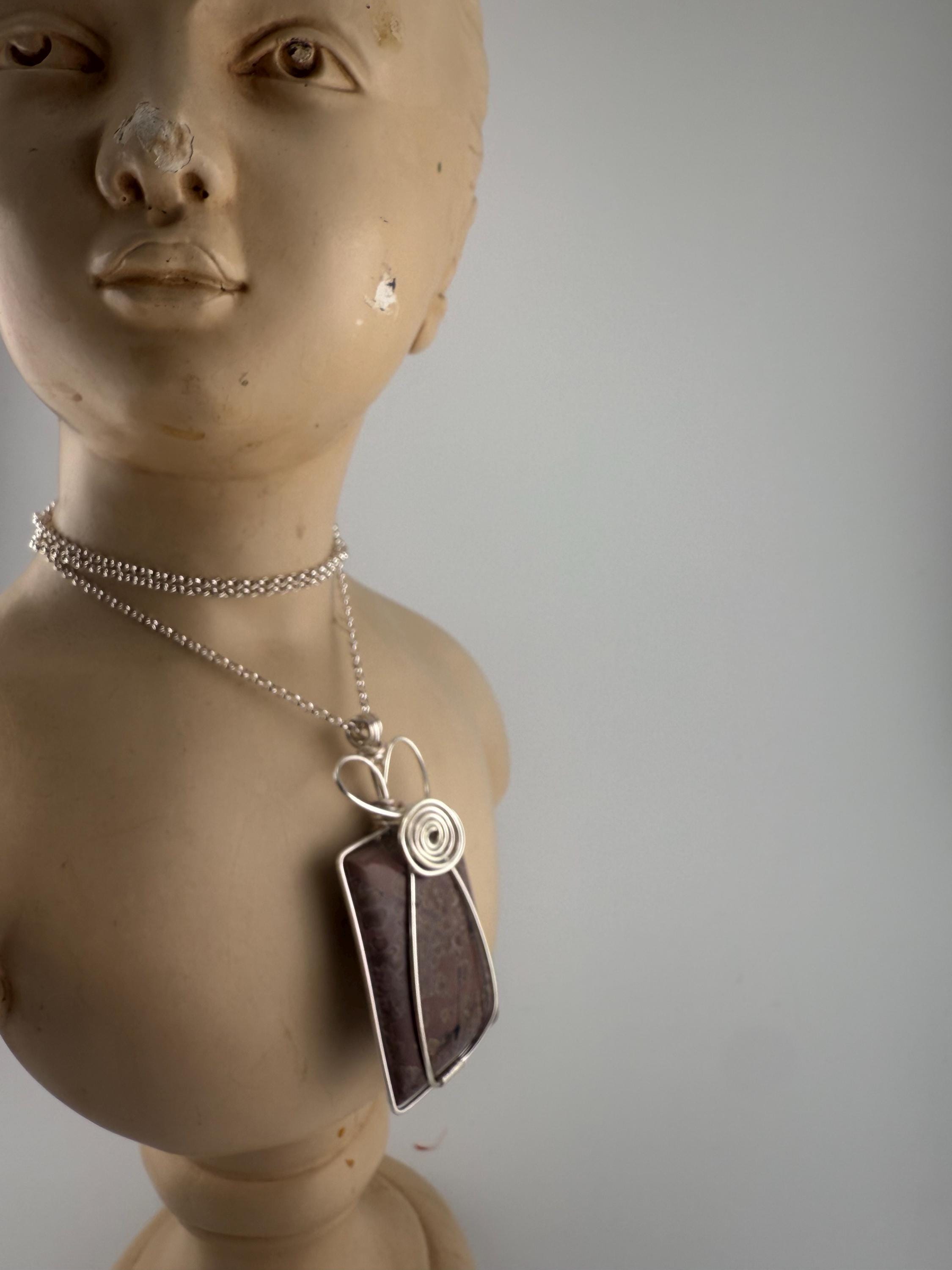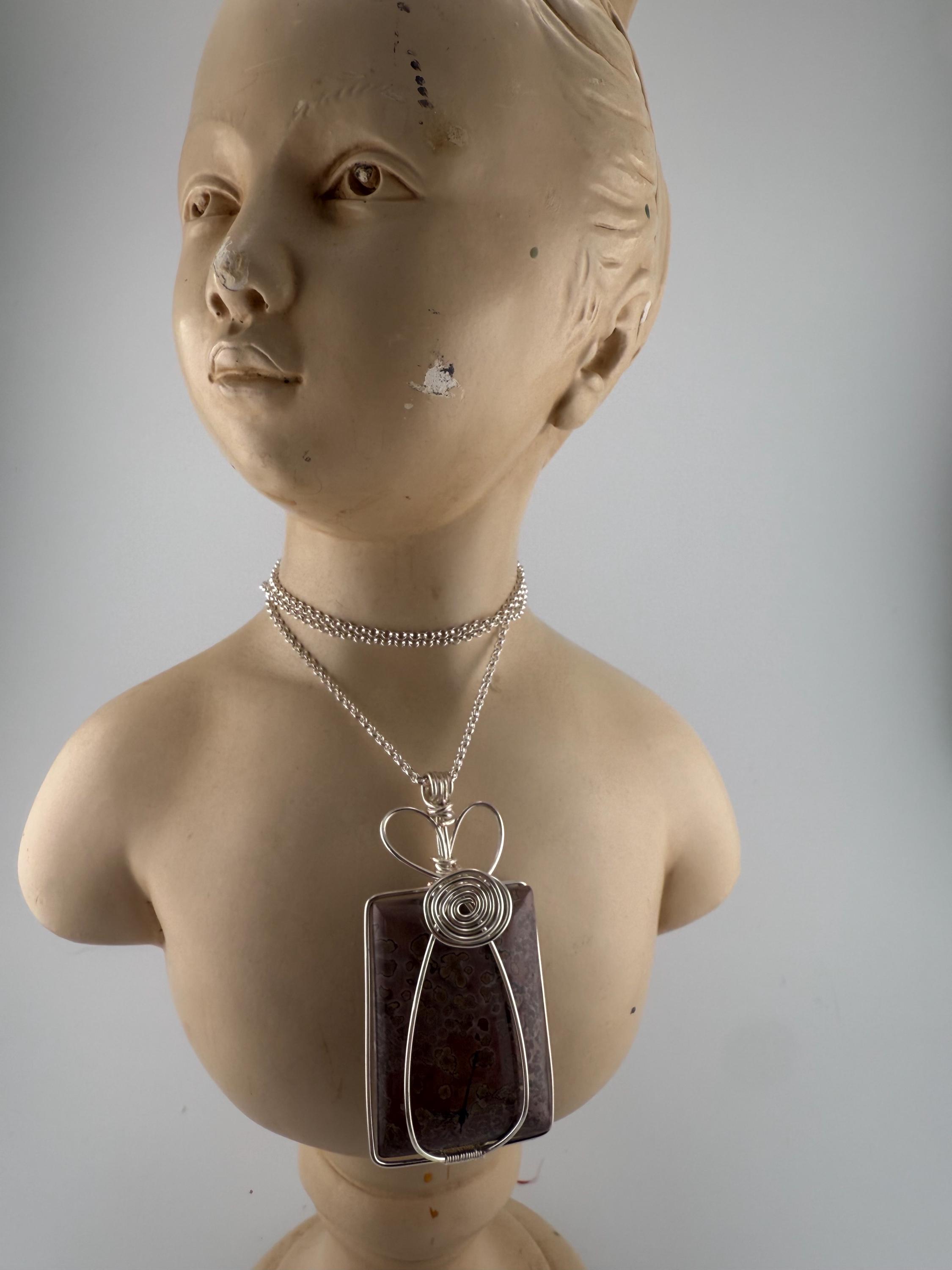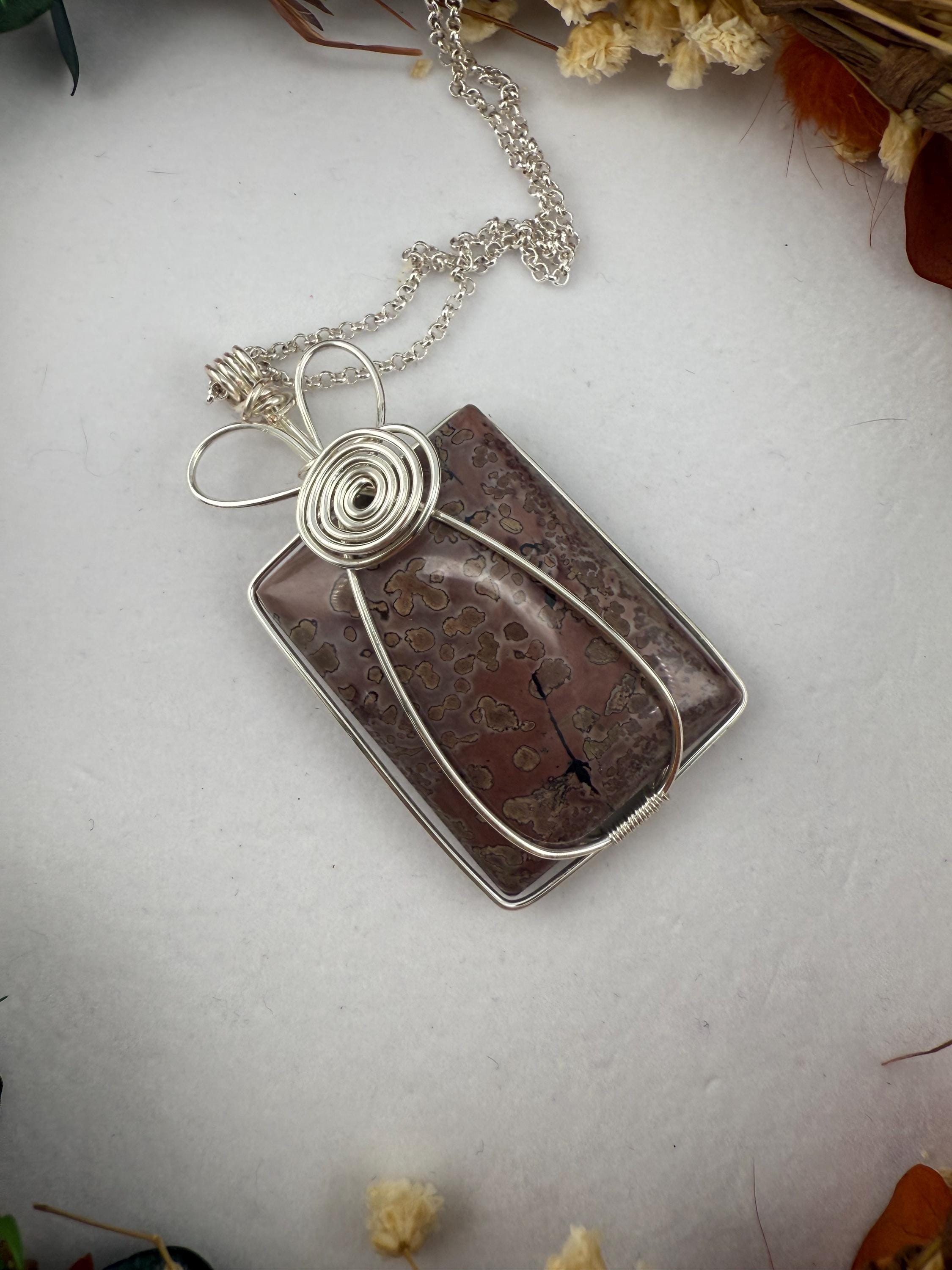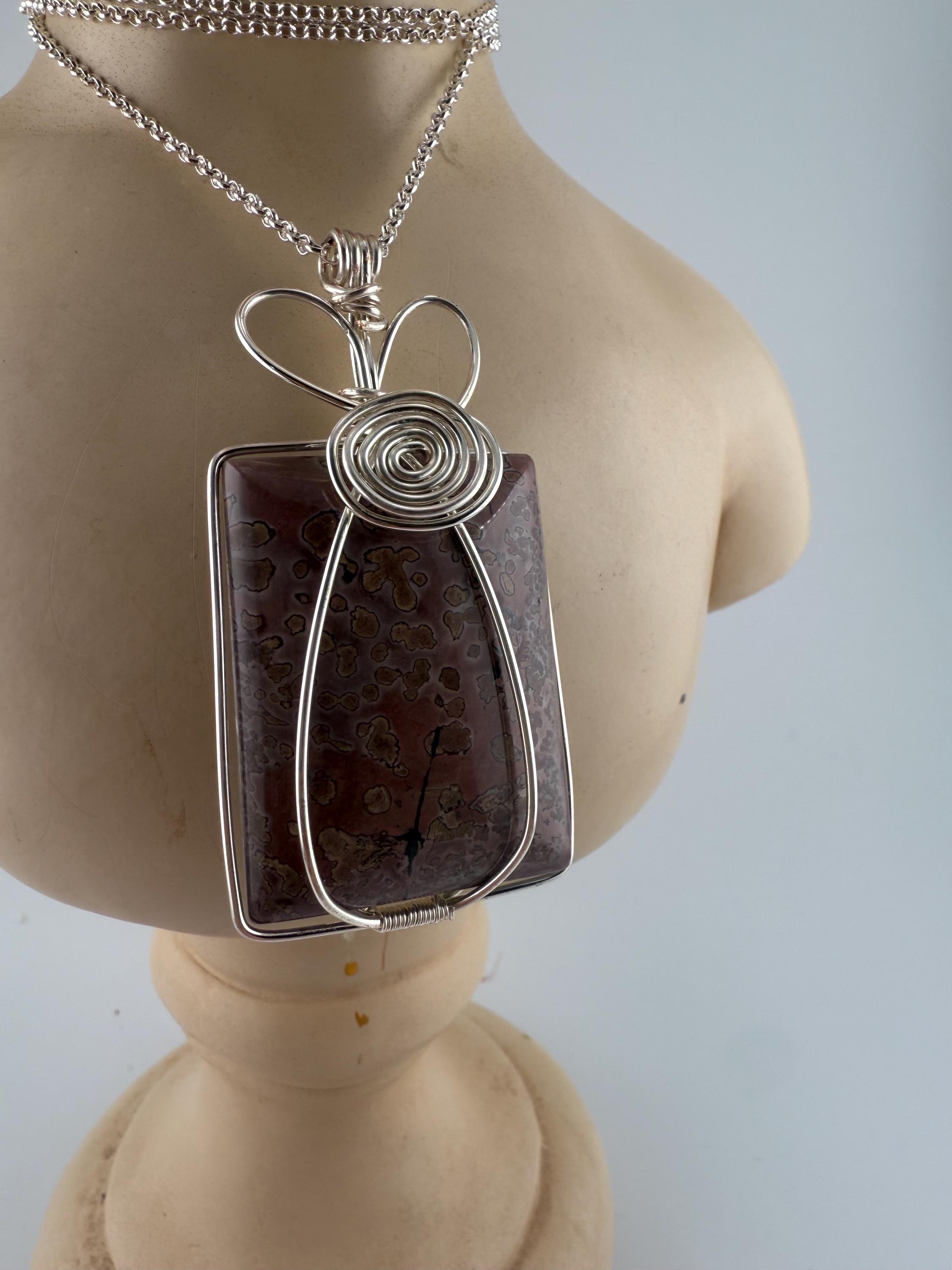 This beautiful Jasper pendant is one of the largest currently available. Wrapped in a non tarnish silver wire, this piece almost mimics a flower vase wrap. The stone is square, reasonably sized and pairs with the chain lovingly. Finished off with a heart like a majority of my wife wrapped pieces.
