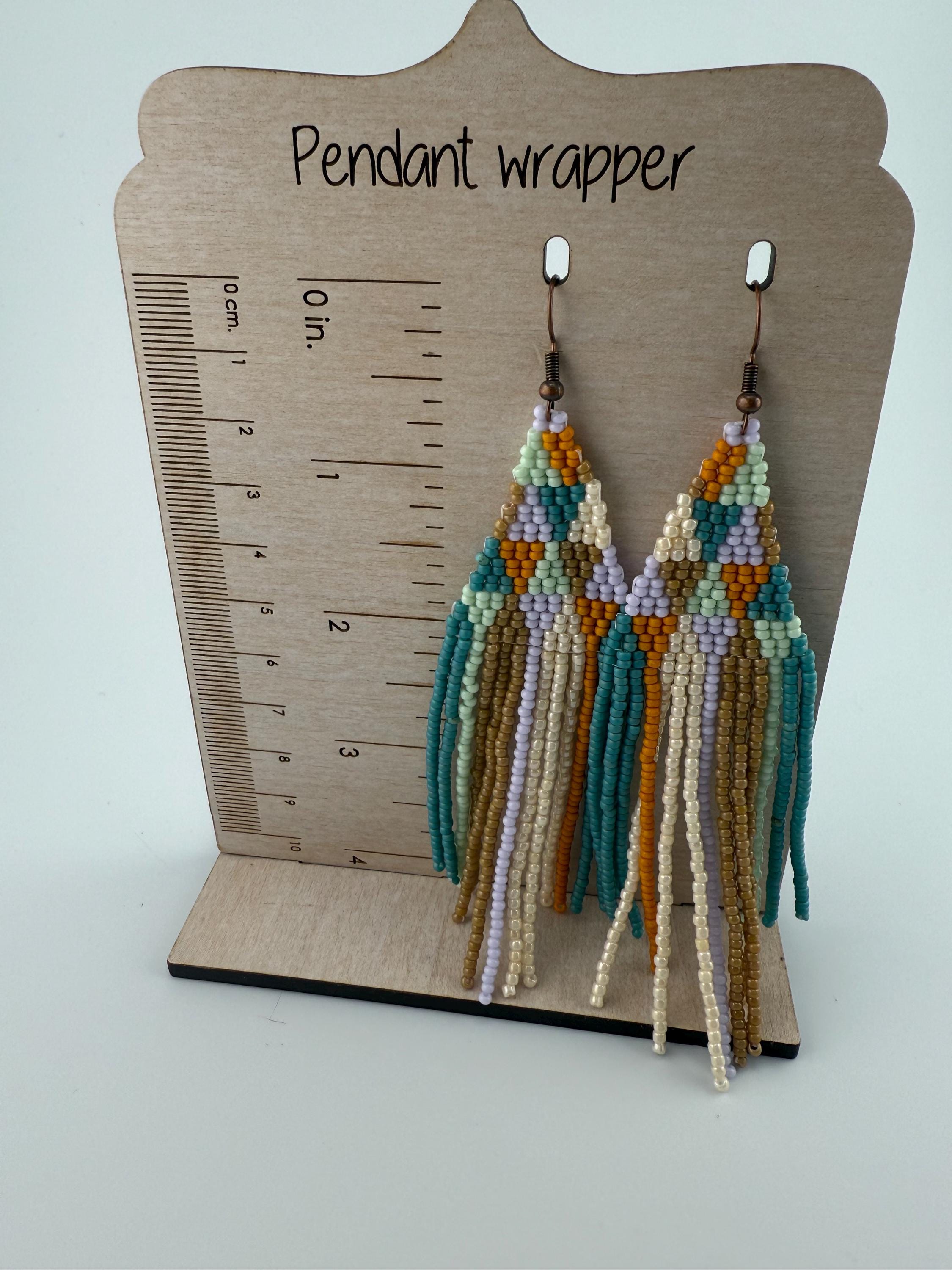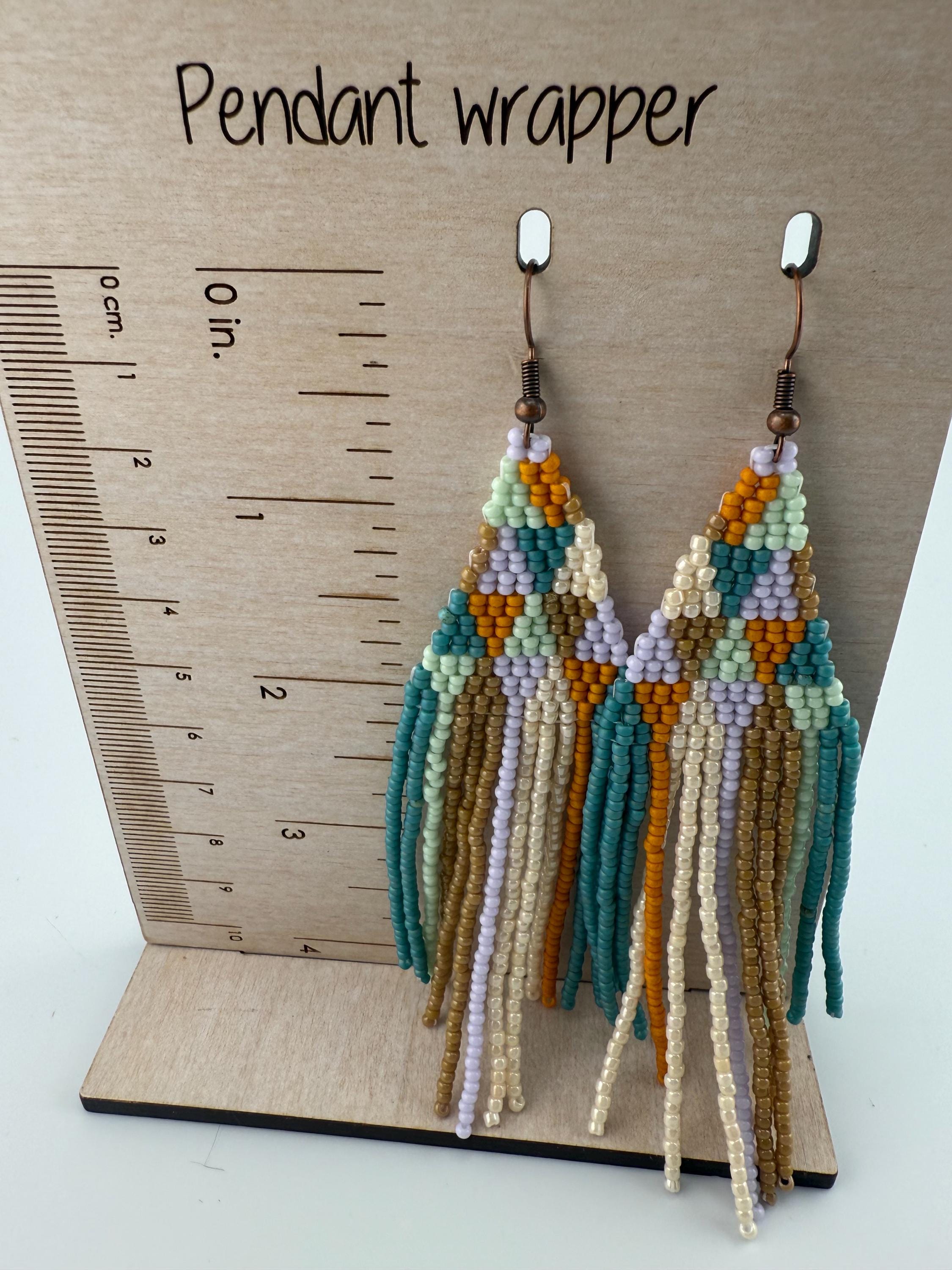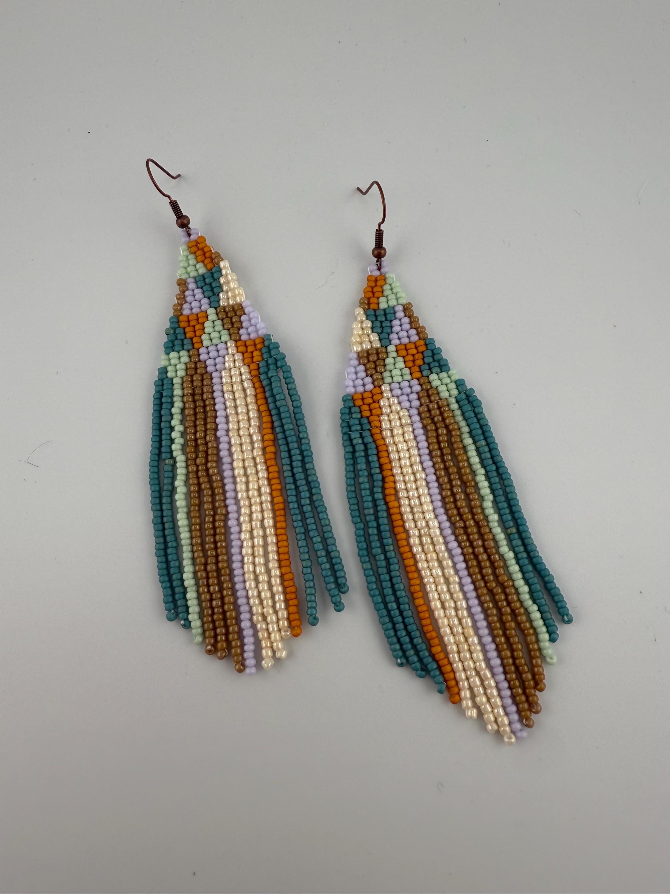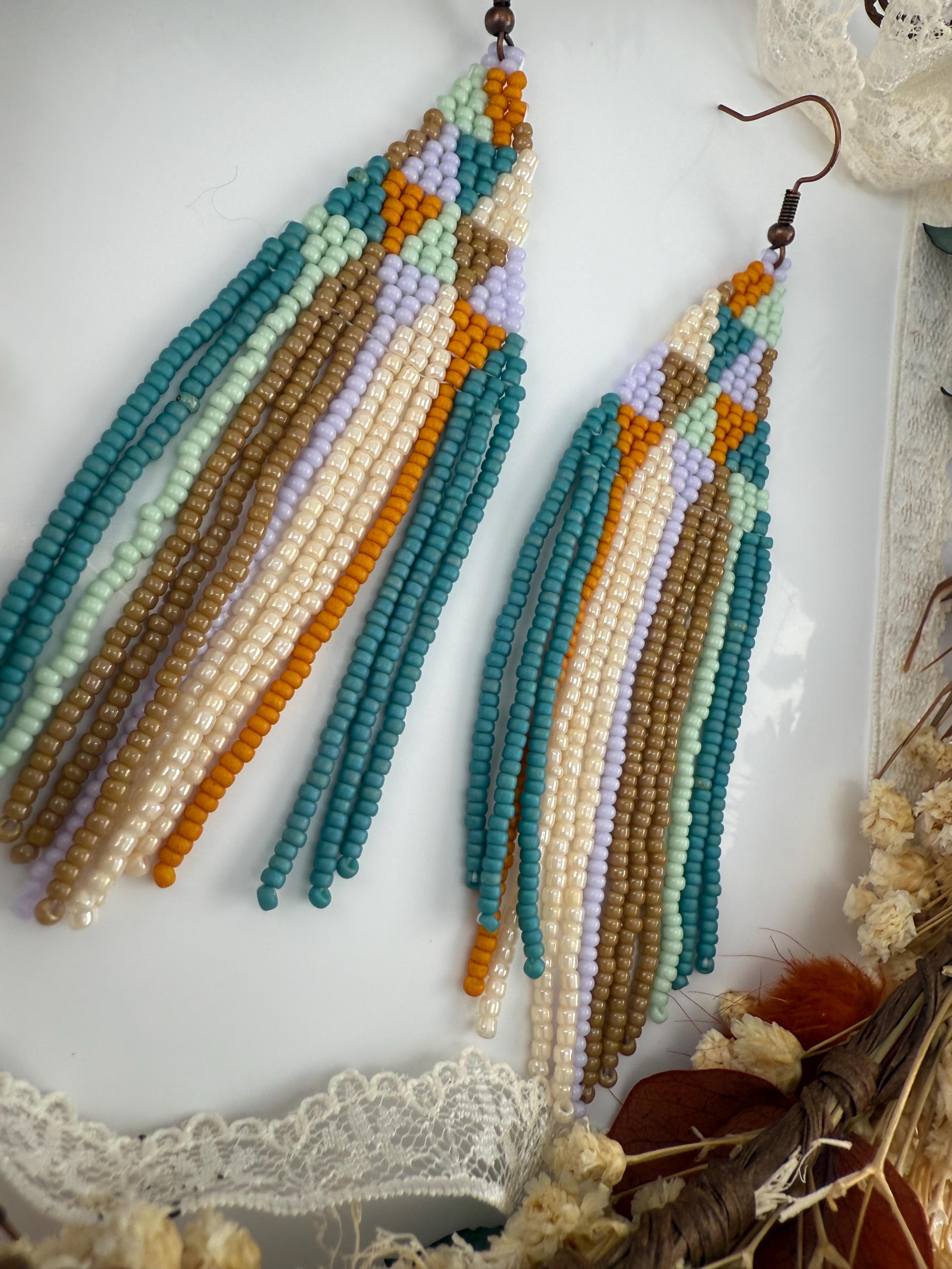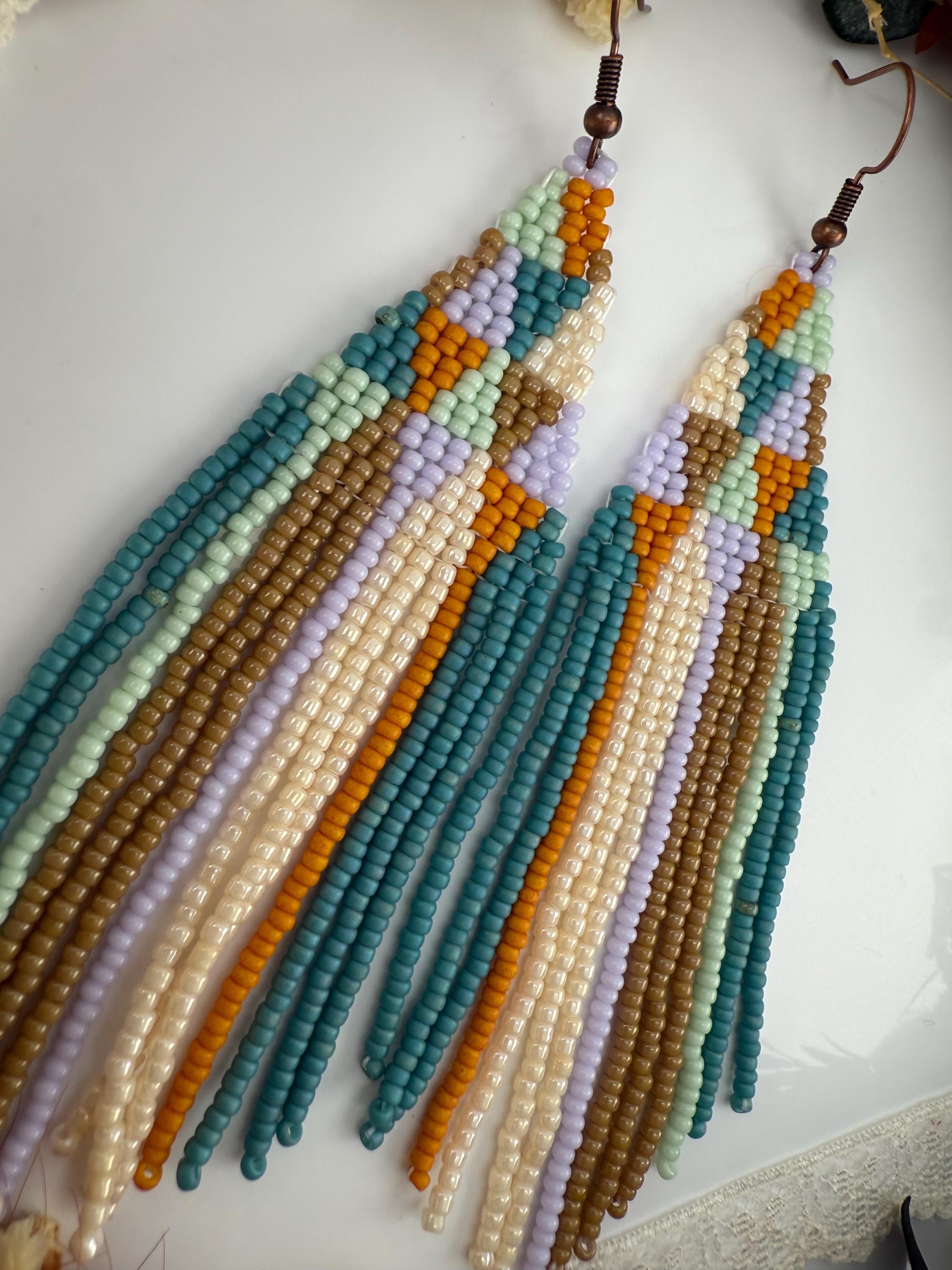 These are a pair of hand-made beaded fringe earrings. They are a delightful pattern that is both chic and beautiful , with an added spring color flare! They are handmade by me, and come in around 4 hours time to complete. They are not overly heavy, but do hang around 4.25-4.5 inches in length.
