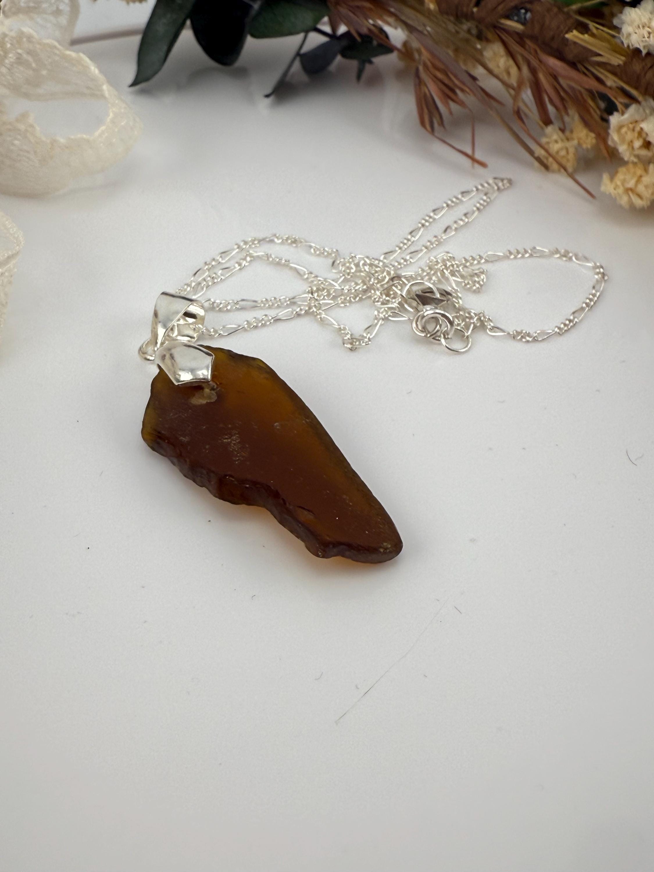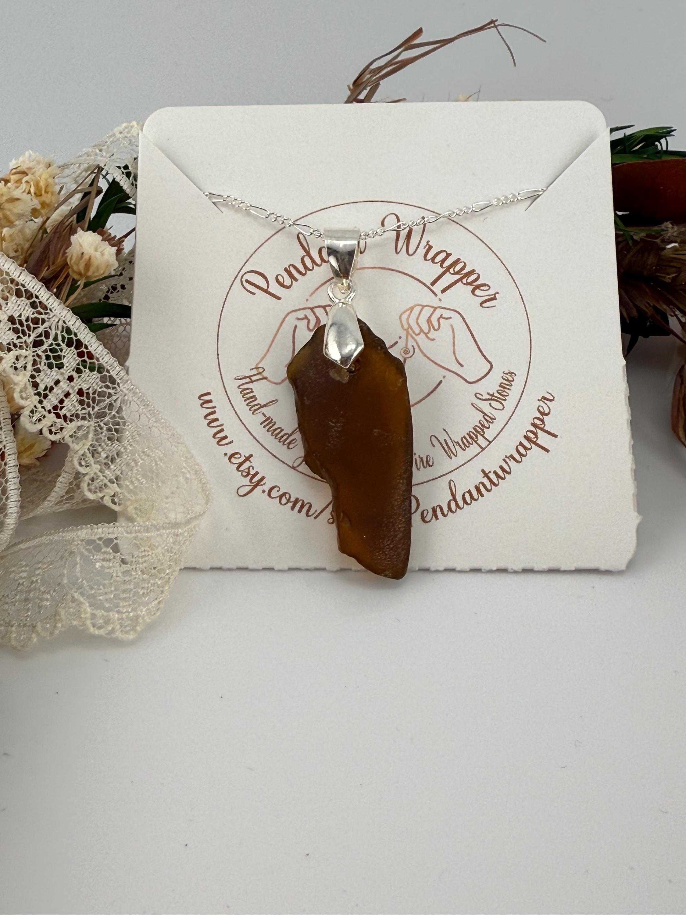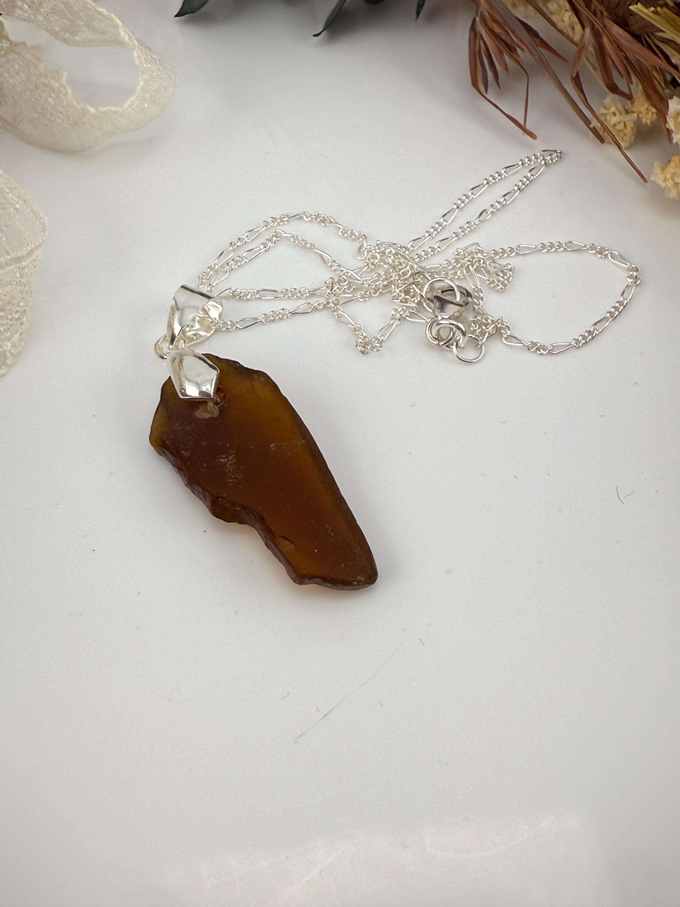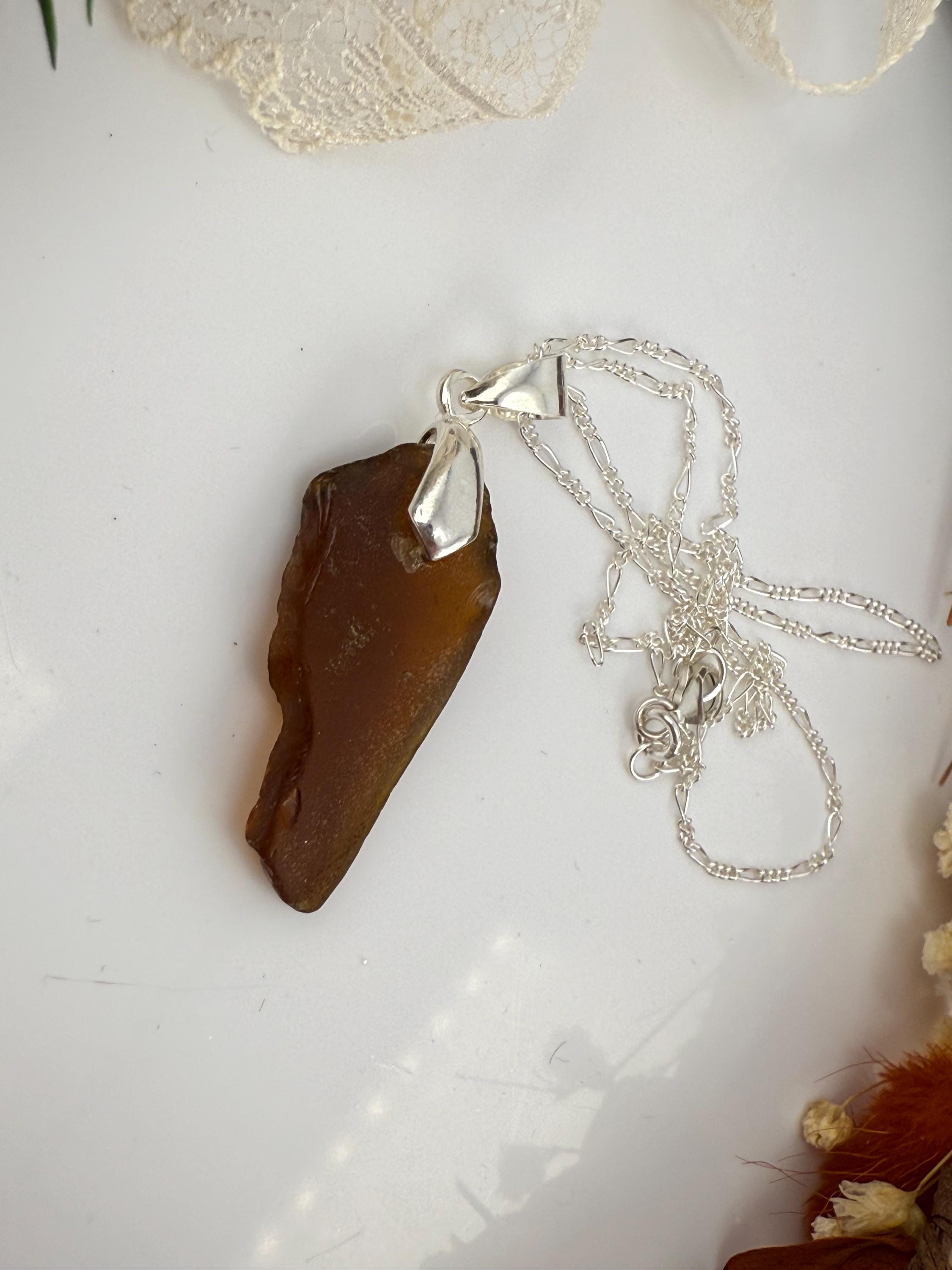 This piece is designed using a brown colored piece of sea glass, finished with a silver bail and hung from a 1.6mm Figaro Curb silver chain. Rough, not tumbled again, made from its original shape and designed by Mother Nature herself. Piece is smaller then some others but packs a beautiful earth color!