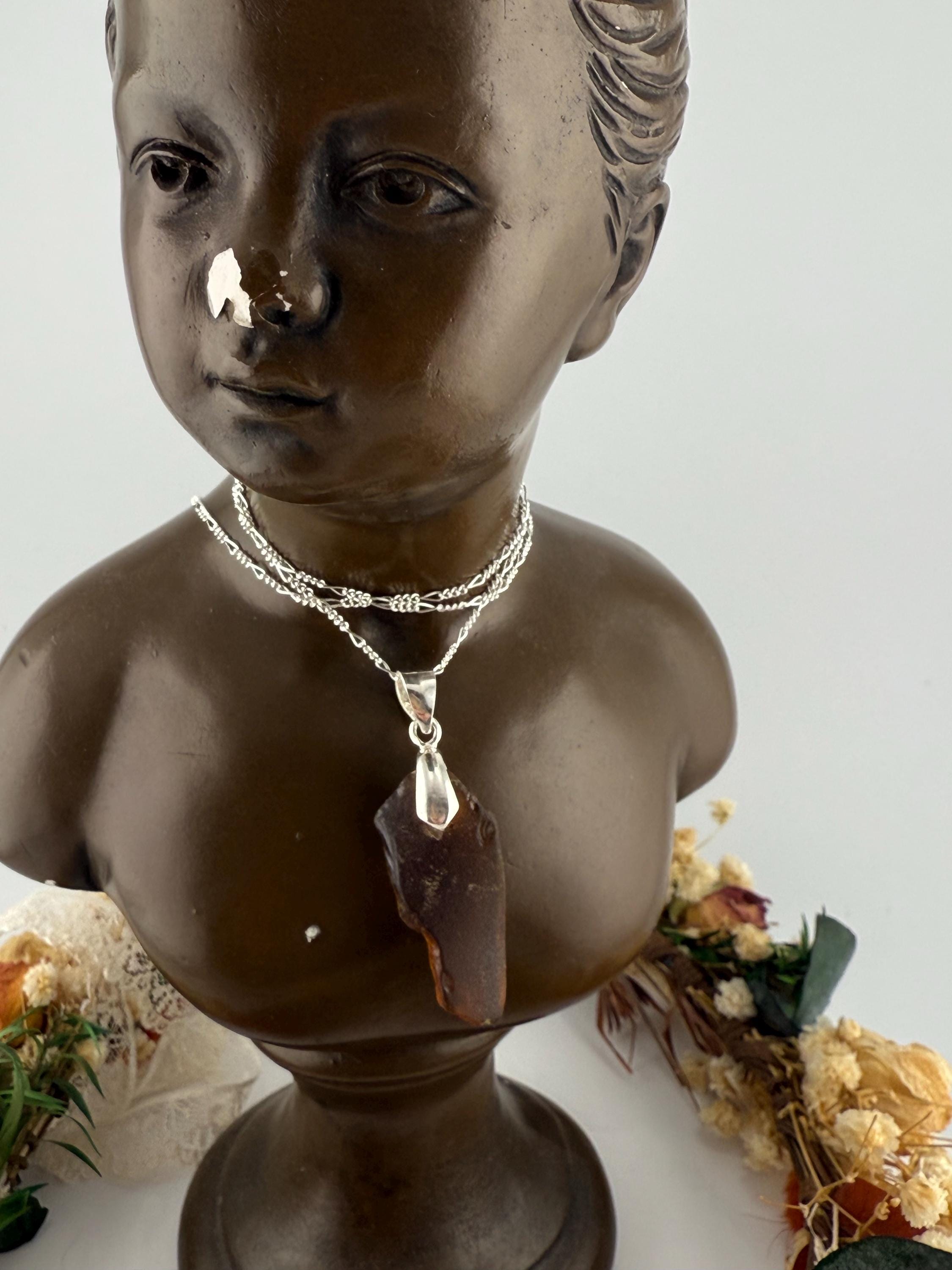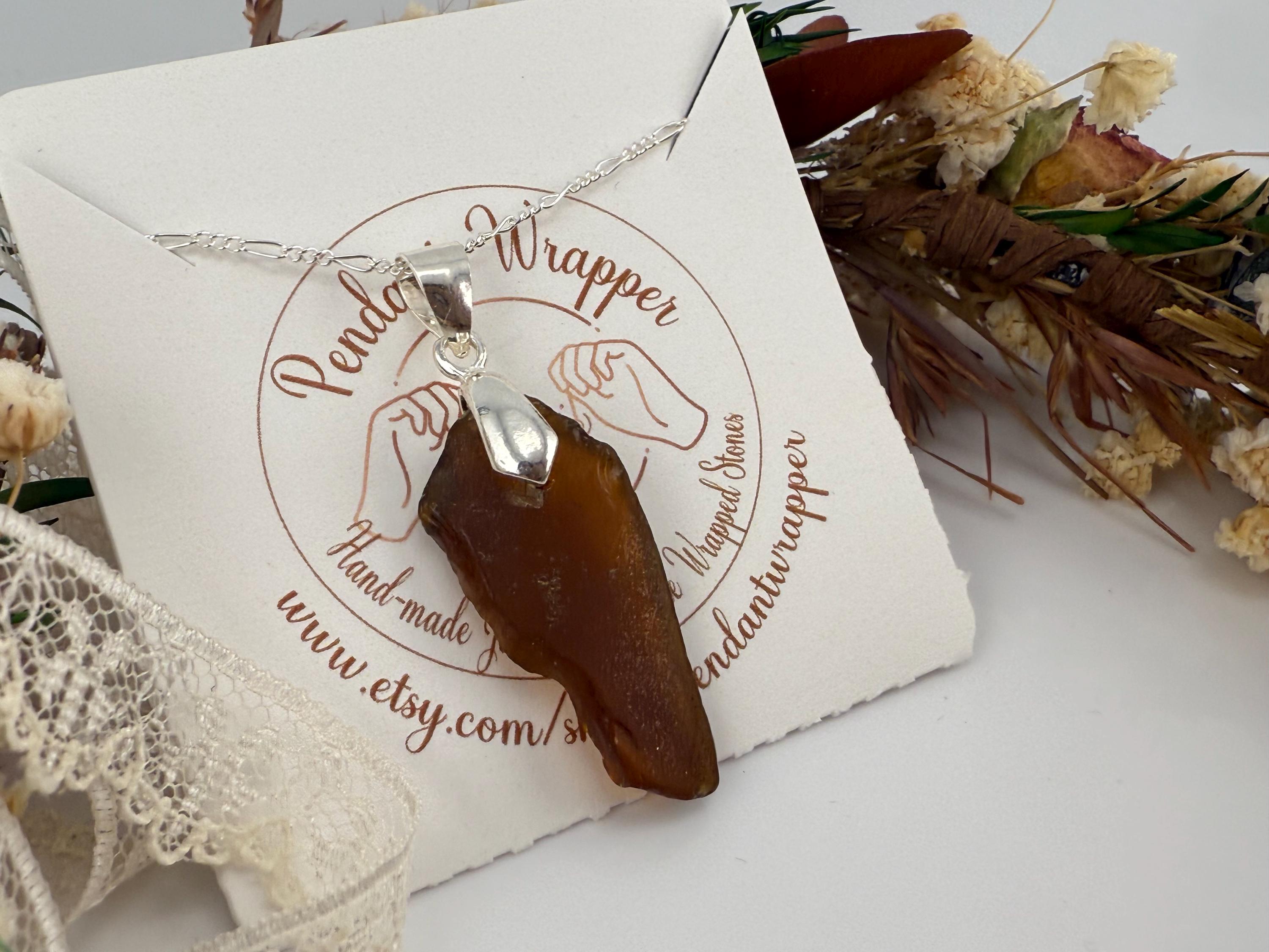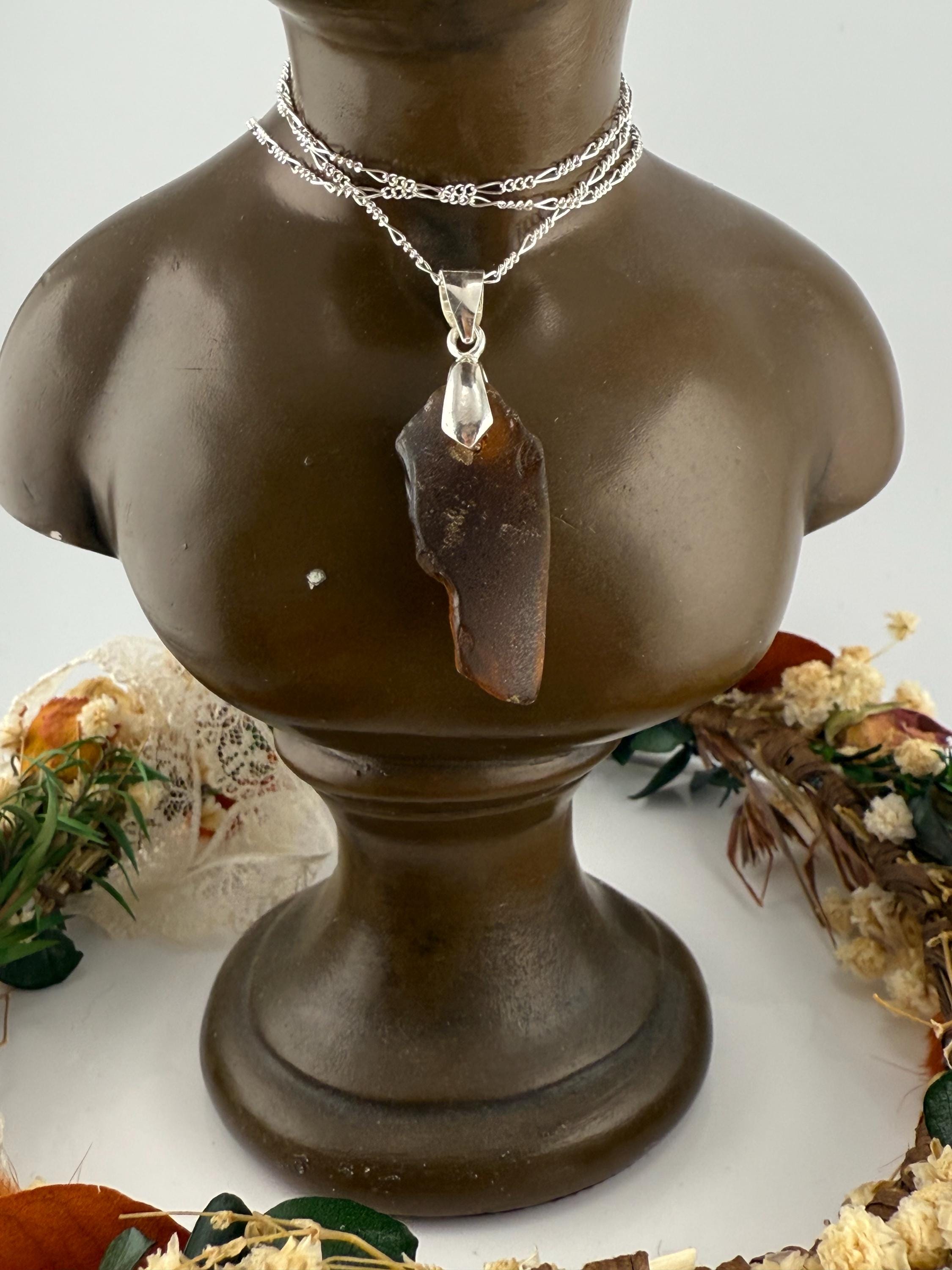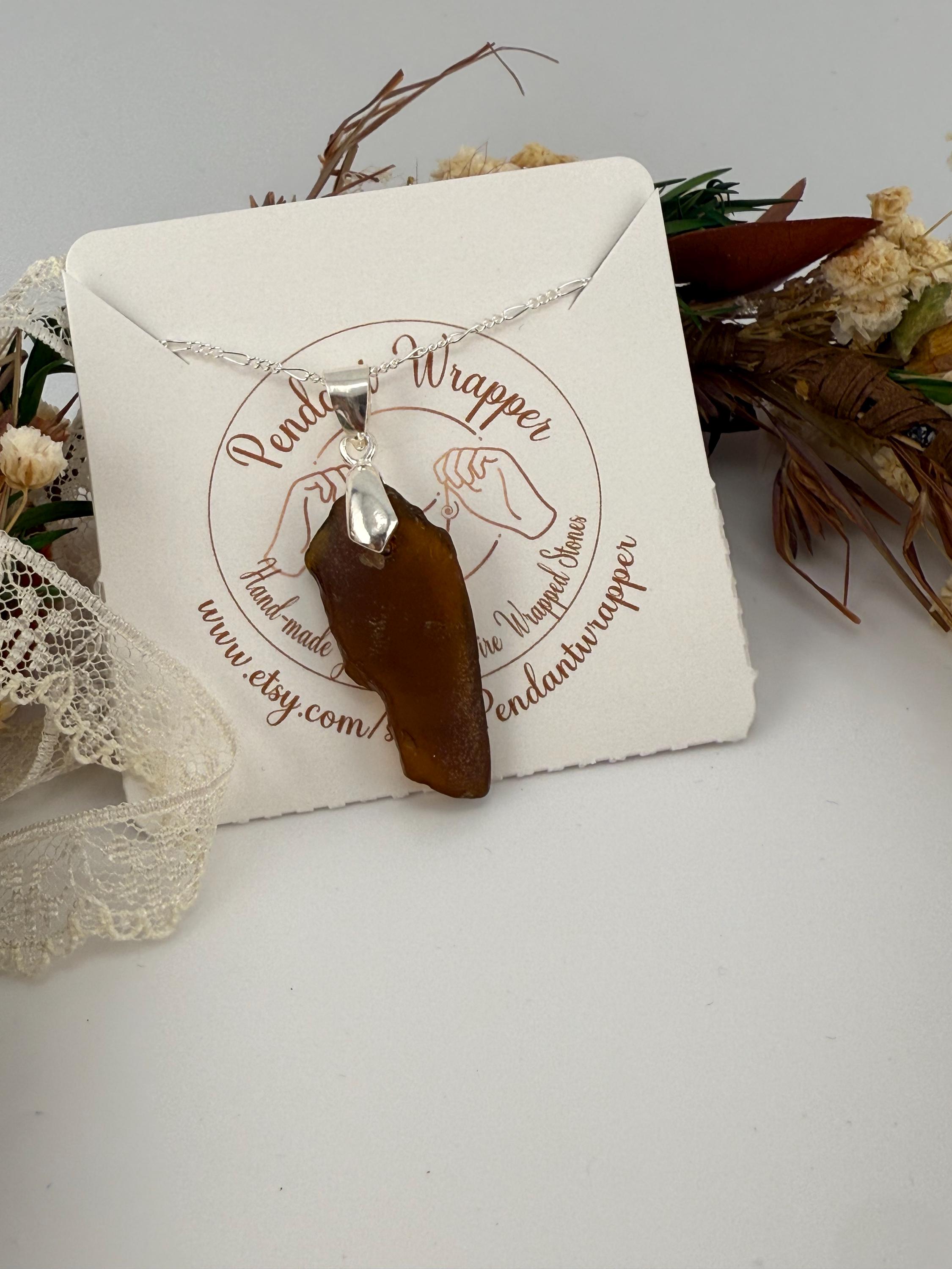This piece is designed using a brown colored piece of sea glass, finished with a silver bail and hung from a 1.6mm Figaro Curb silver chain. Rough, not tumbled again, made from its original shape and designed by Mother Nature herself. Piece is smaller then some others but packs a beautiful earth color!