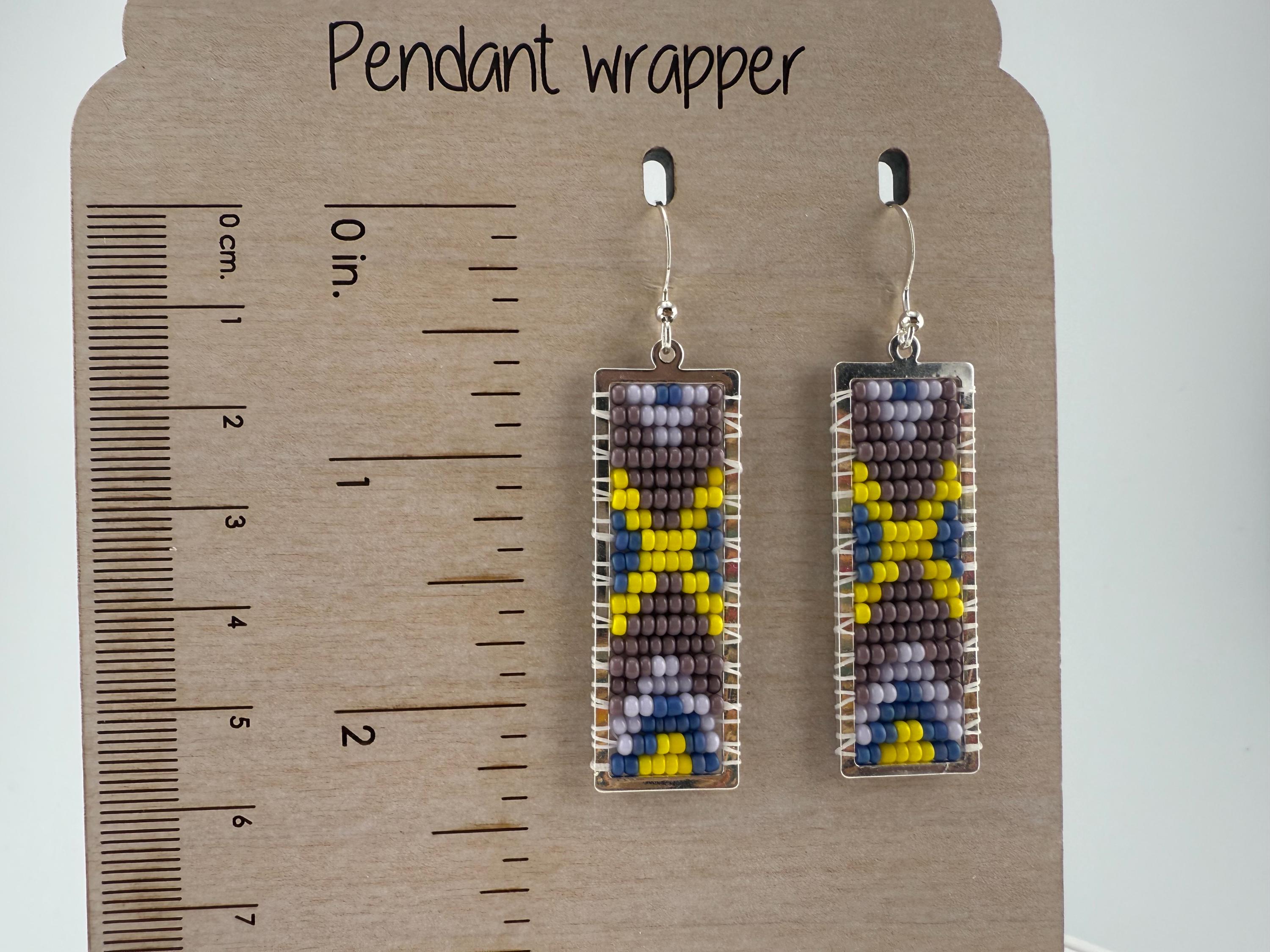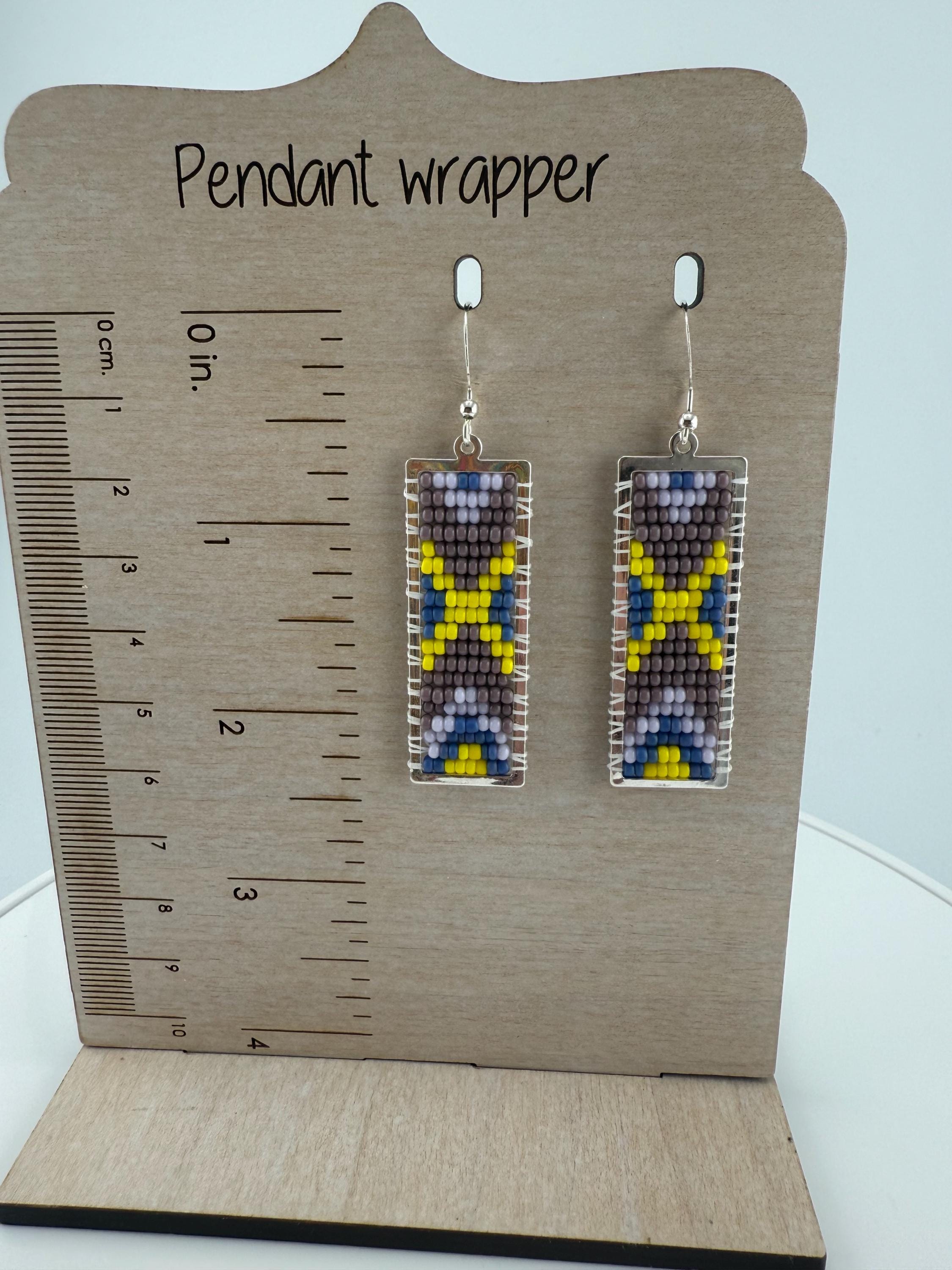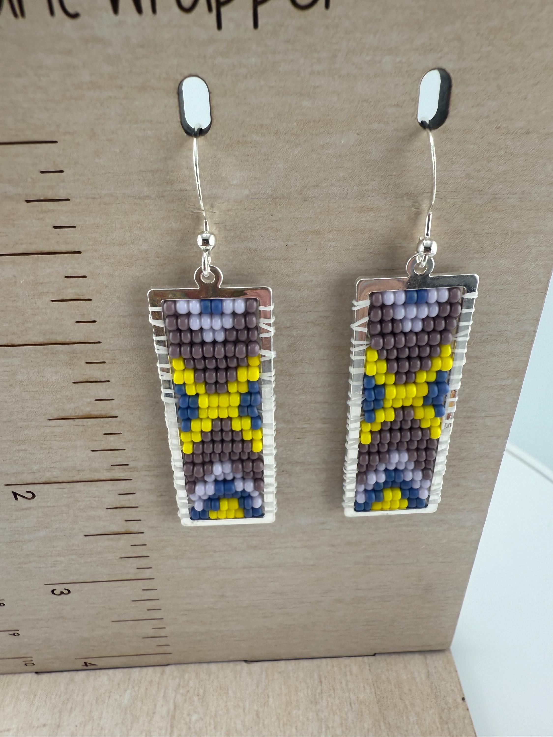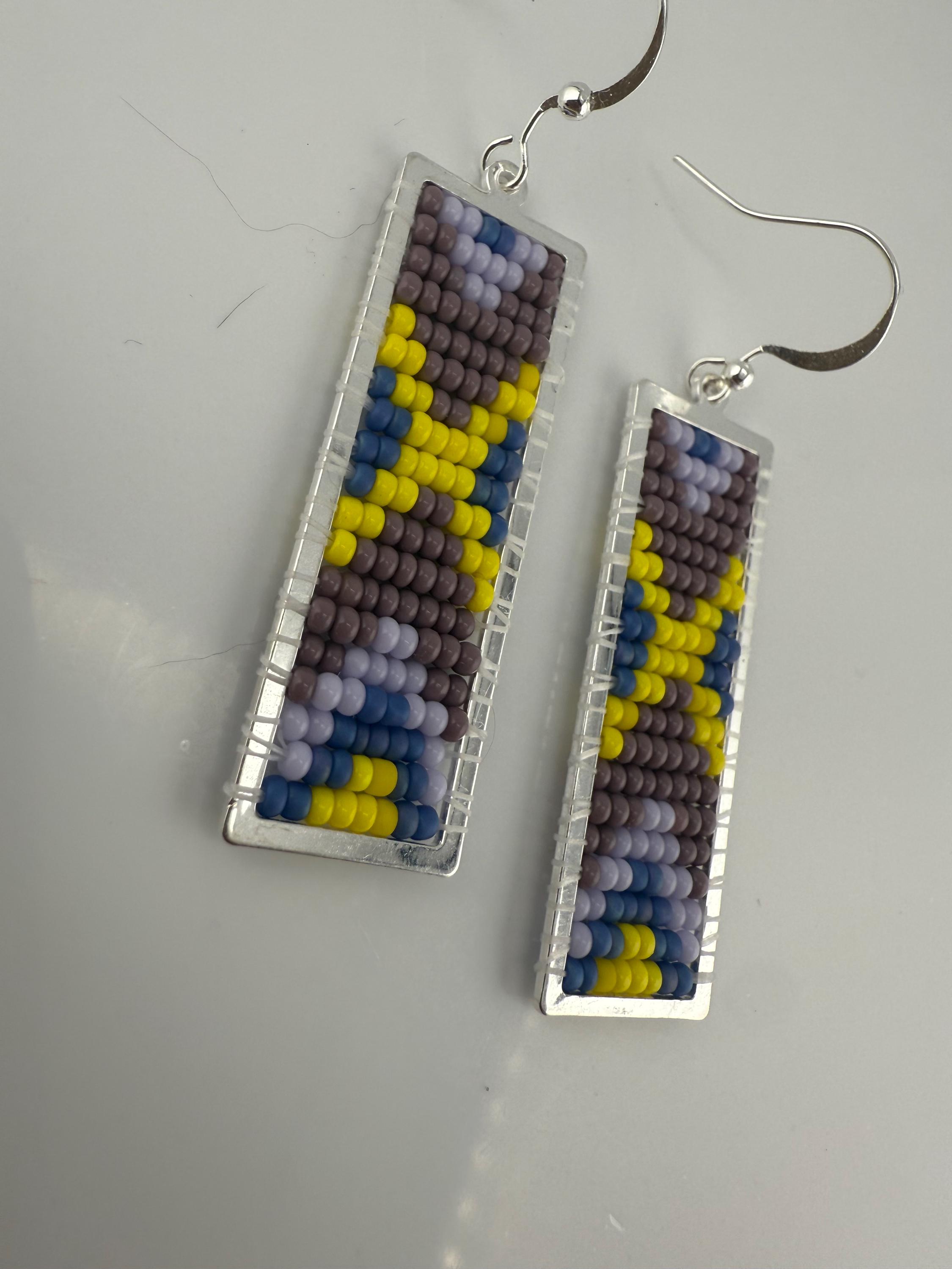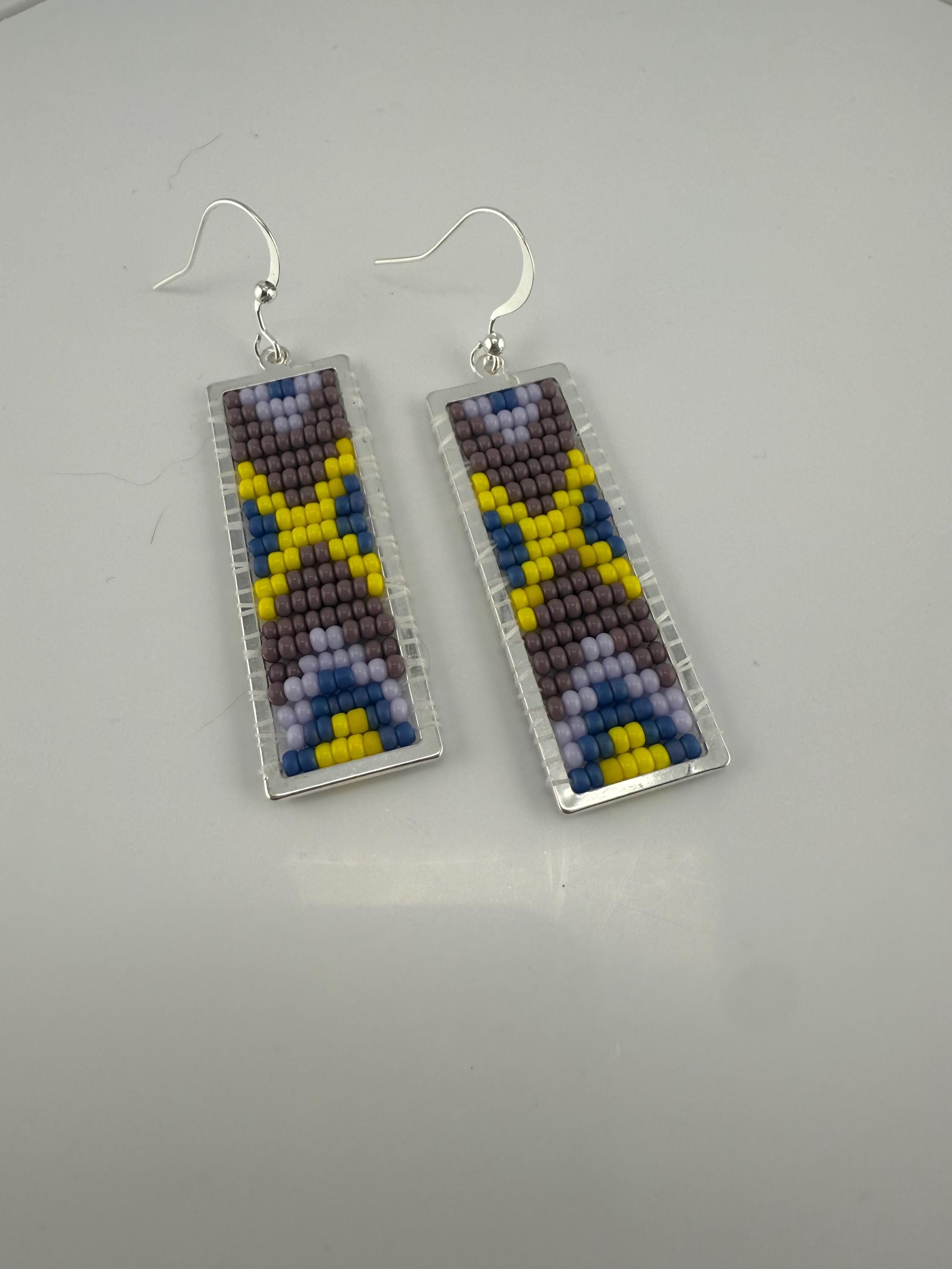 These earrings are a handmade pattern of vibrant spring colors. Sewn into a rectangular frame, these are the perfect dress up or down, go to earrings for all around town, or girls night out. They are fun earrings and the colors are perfect. They hang approximately 2.5 inches in length.