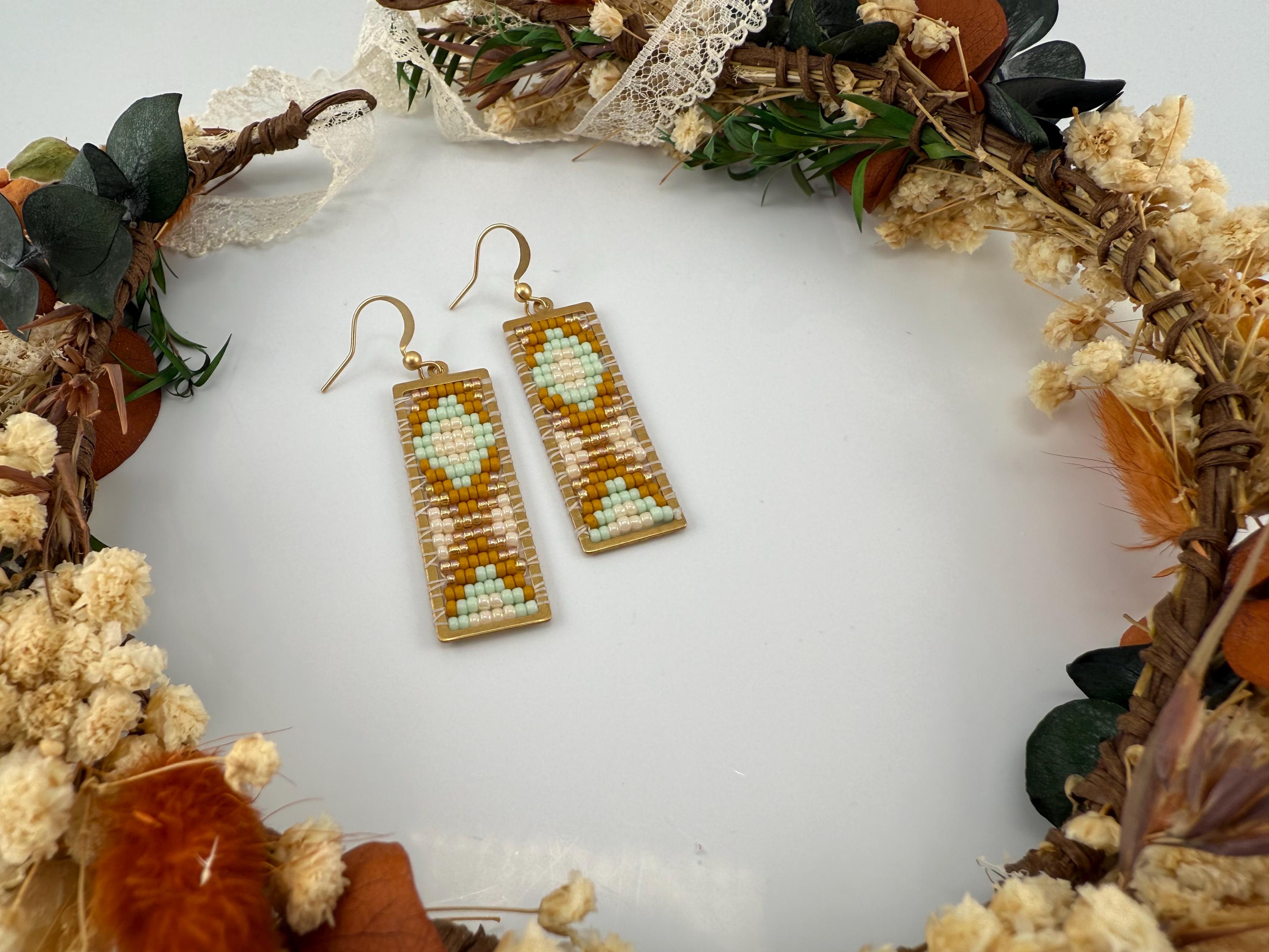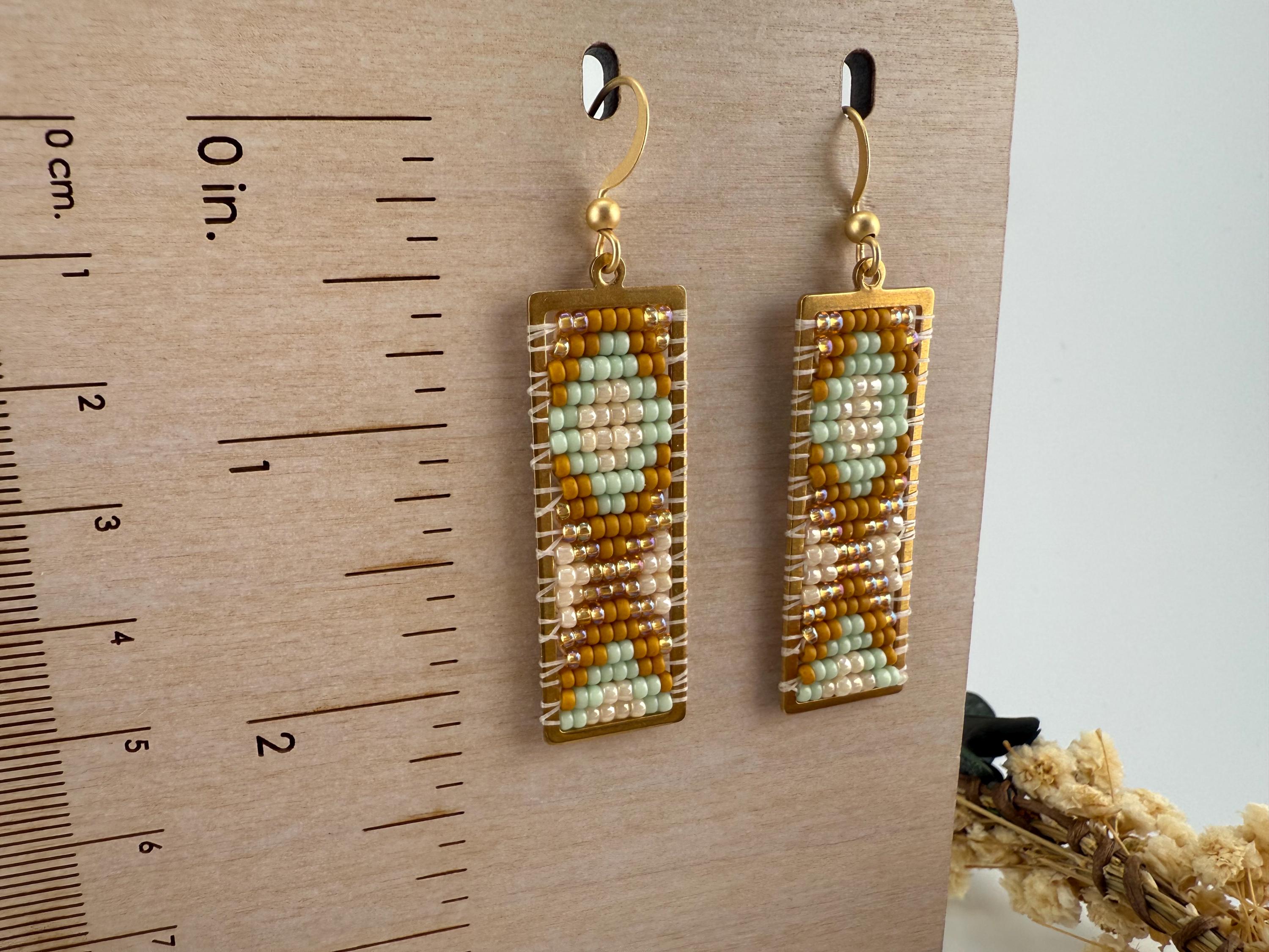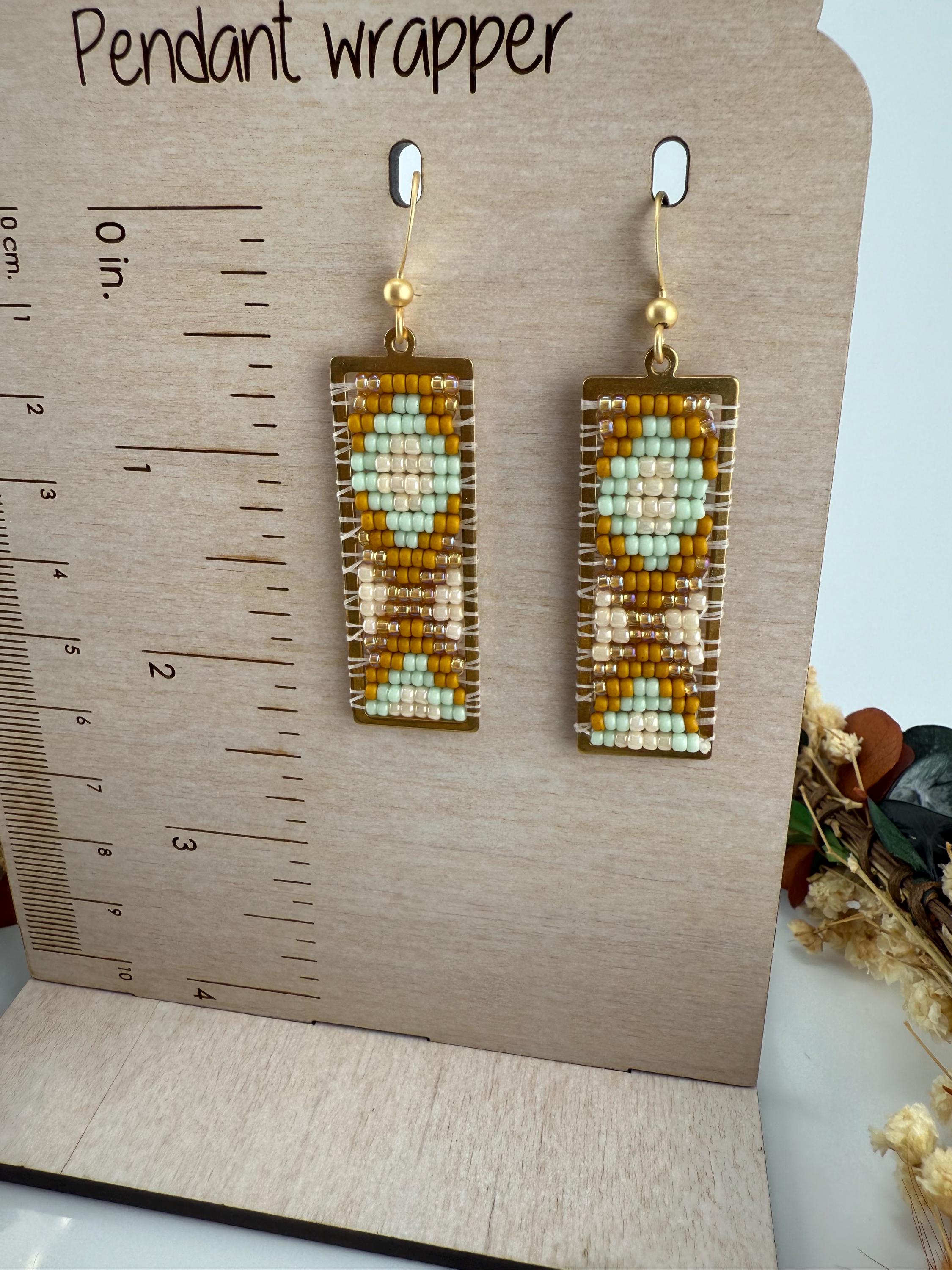 These earrings are a handmade pattern of light pastel colors. Sewn into a rectangular frame, these are the perfect dress up or down, go to earrings for all around town, or girls night out. They are fun earrings and the colors are perfect. They hang approximately 2.5 inches in length.