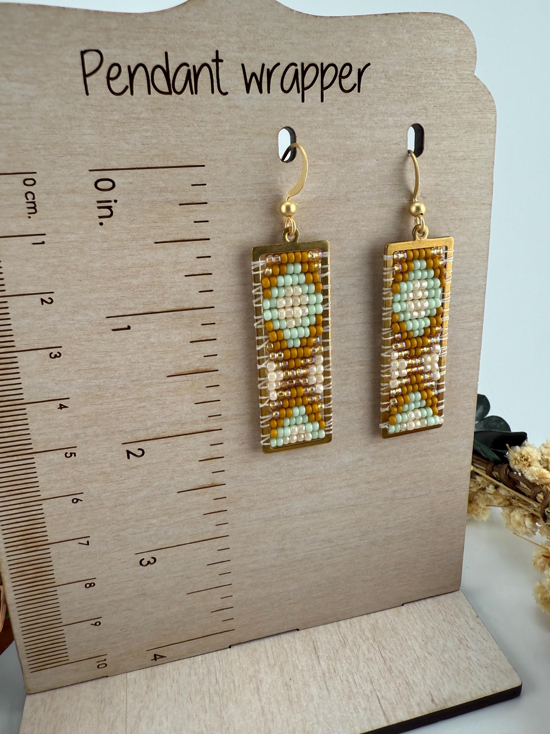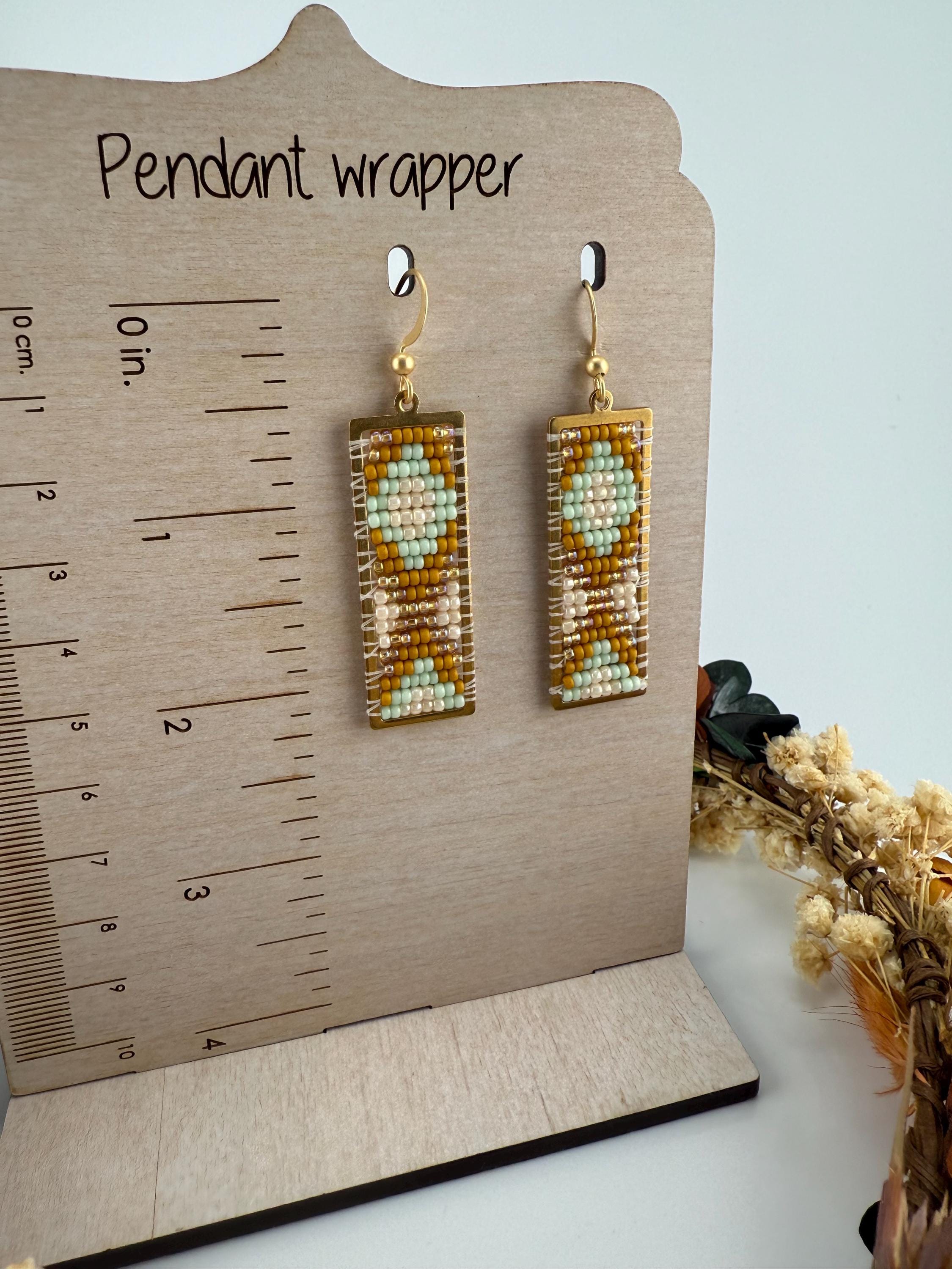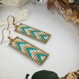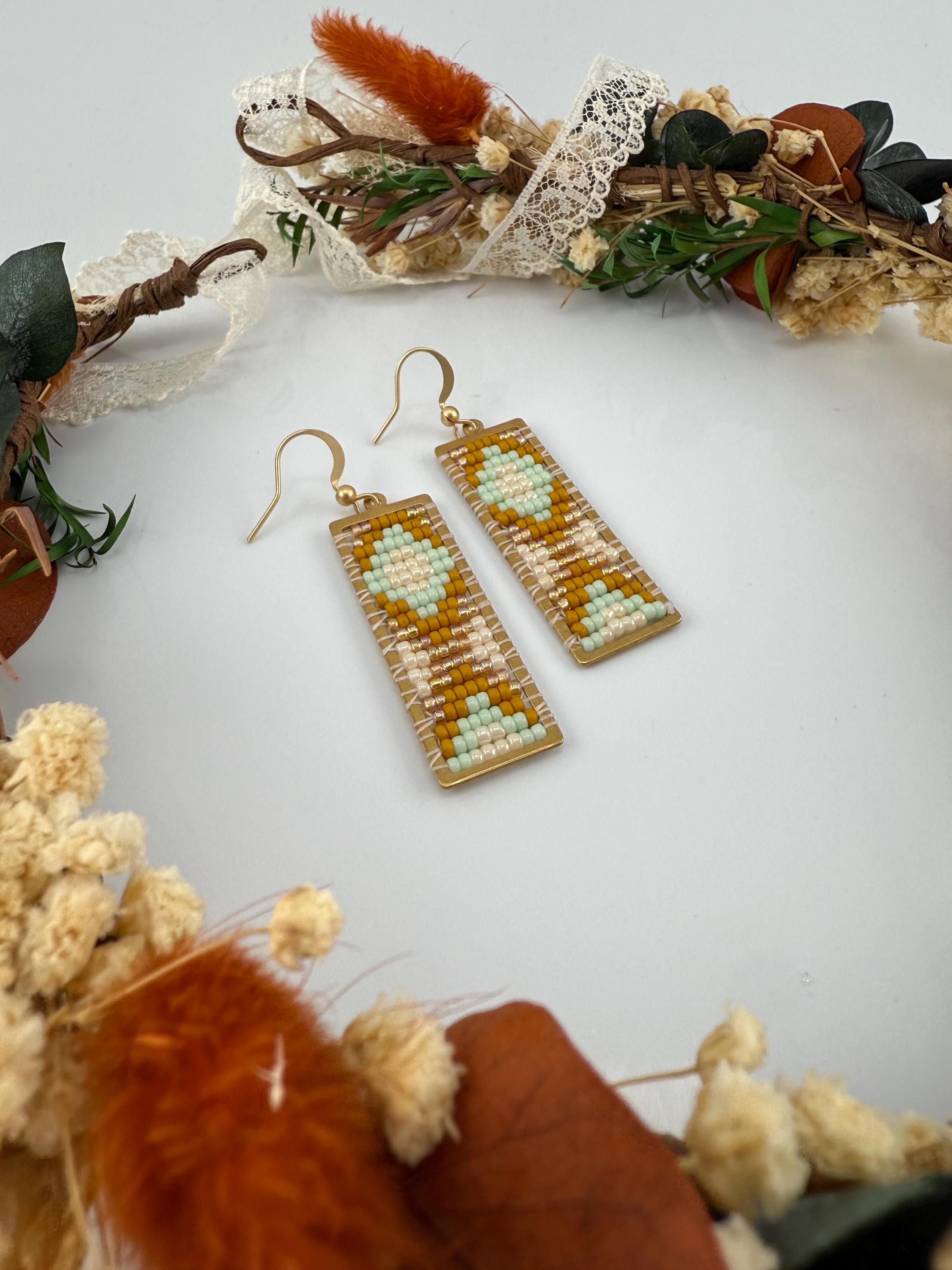 These earrings are a handmade pattern of light pastel colors. Sewn into a rectangular frame, these are the perfect dress up or down, go to earrings for all around town, or girls night out. They are fun earrings and the colors are perfect. They hang approximately 2.5 inches in length.