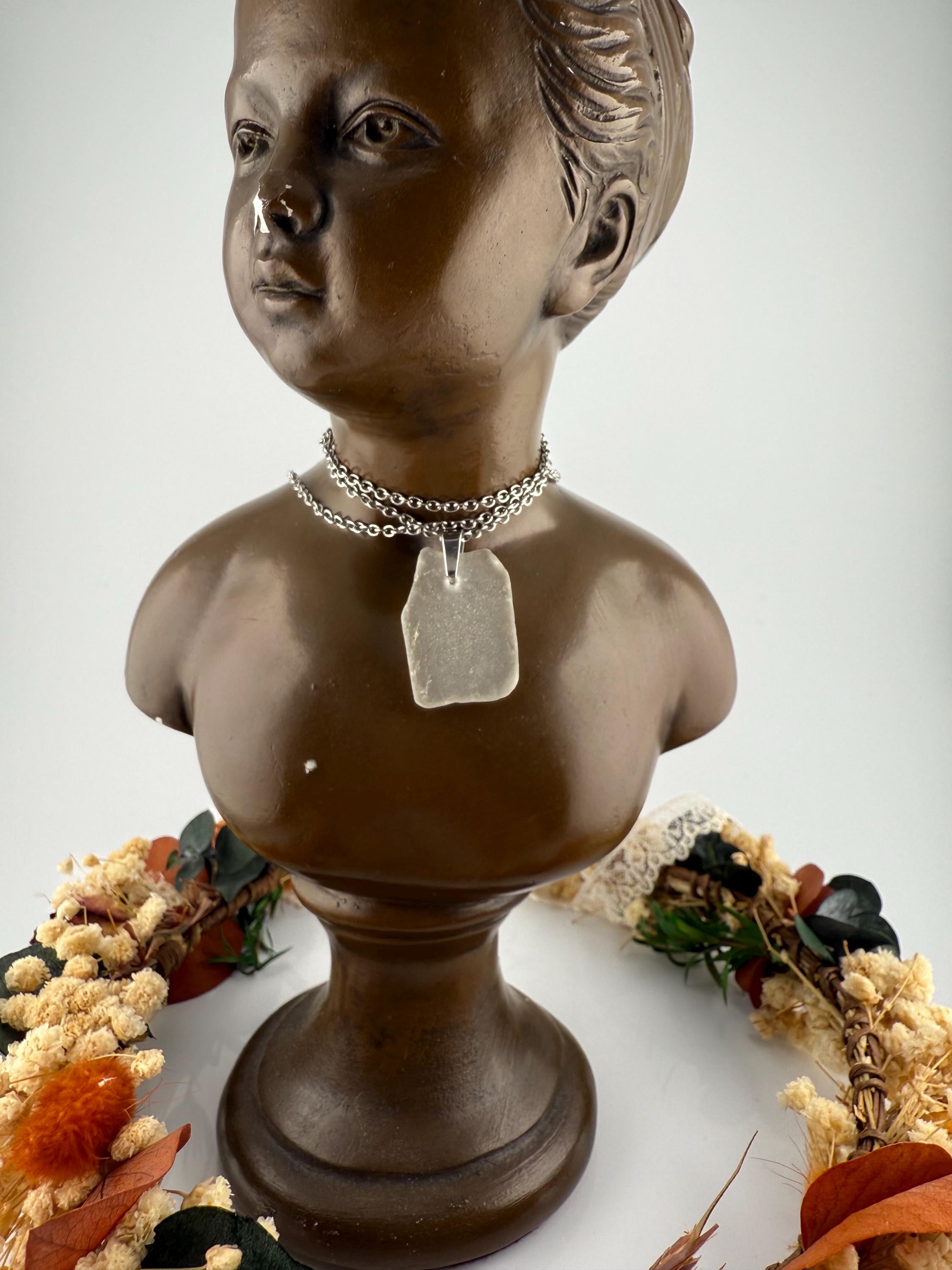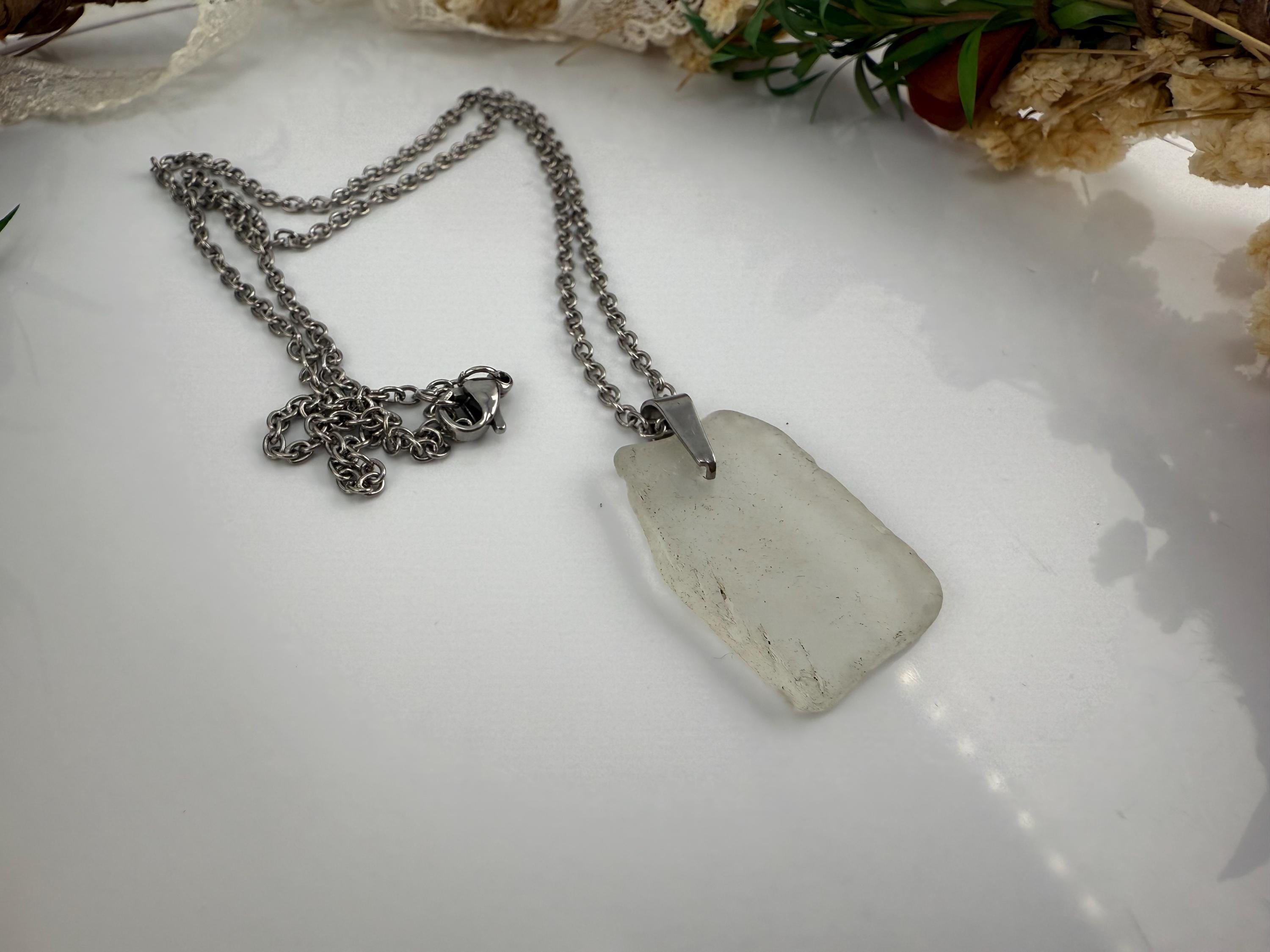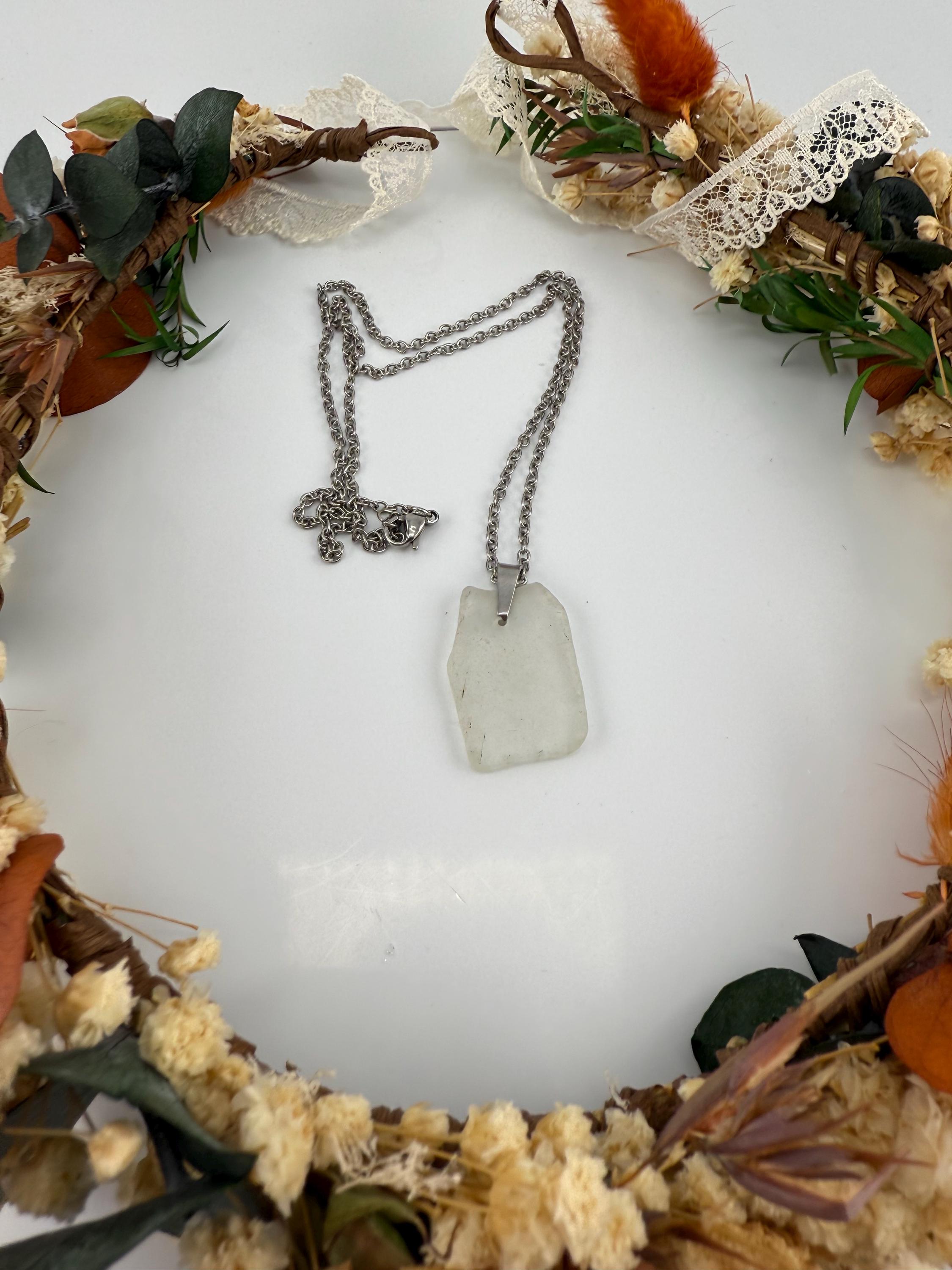 For my birthday this year I traveled to Scotland. While visiting portree we came across some beautiful bit of sea glass. I knew exactly what I wanted to do. So I came home and learned to drill the glass, ordered my bits to complete the piece and made the most beautiful pendants from mother natures repurposed pieces. It’s one of the rare things that can be taken form a state of waste and turned into something so incredibly beautiful. This piece is off white, finished with a stainless steel bail and hung from a stainless steel chain. Rough, not tumbled again, but the cutest little shape; and made from its original shape and designed by Mother Nature herself.