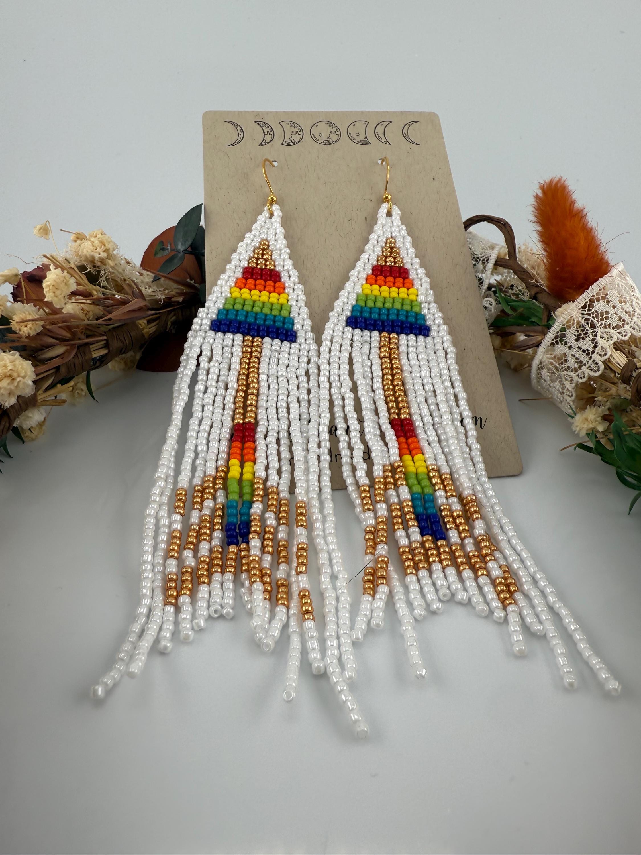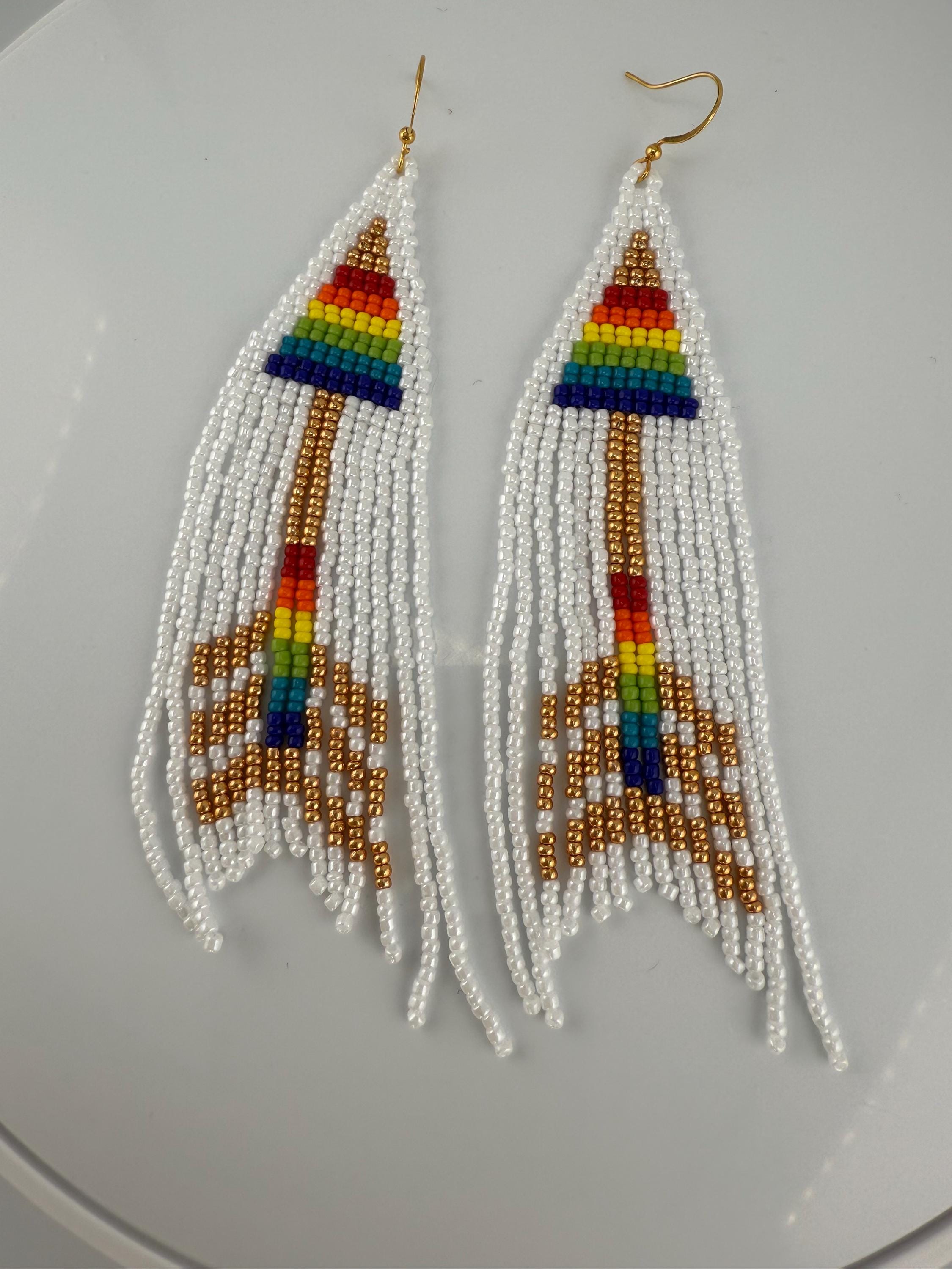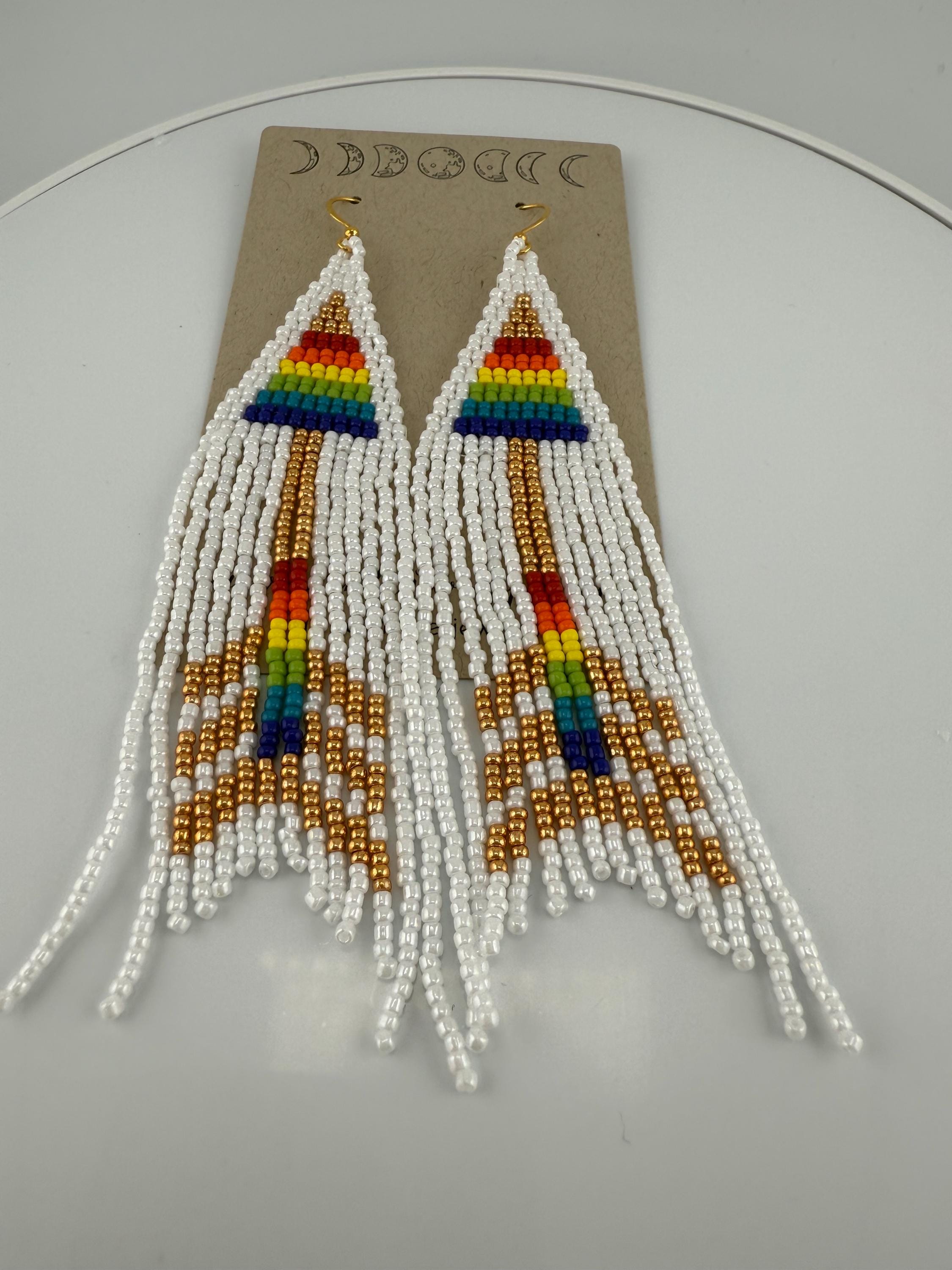These are a pair of hand-made beaded fringe earrings. They are a delightful pattern that is both beautiful and poetic , cause love is love is love! and no matter how that arrow hits the heart we all know love fills our souls. Lots of color and shine on these beautiful earrings. They are handmade, and come in around 4 hours time to complete. They are not overly heavy, but do hang around 4.25-4.5 inches in length.