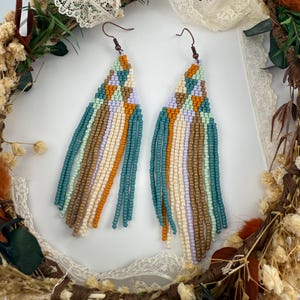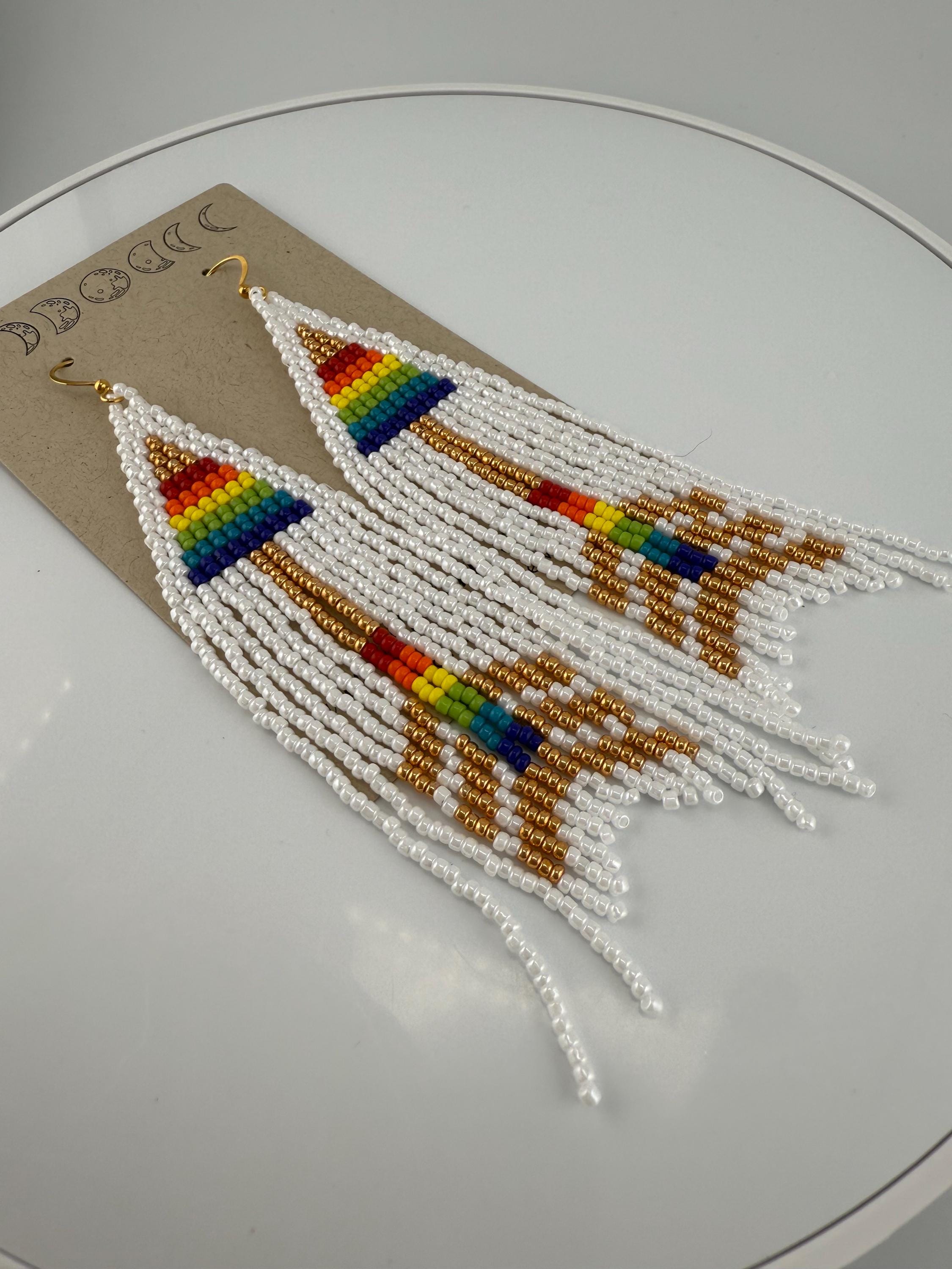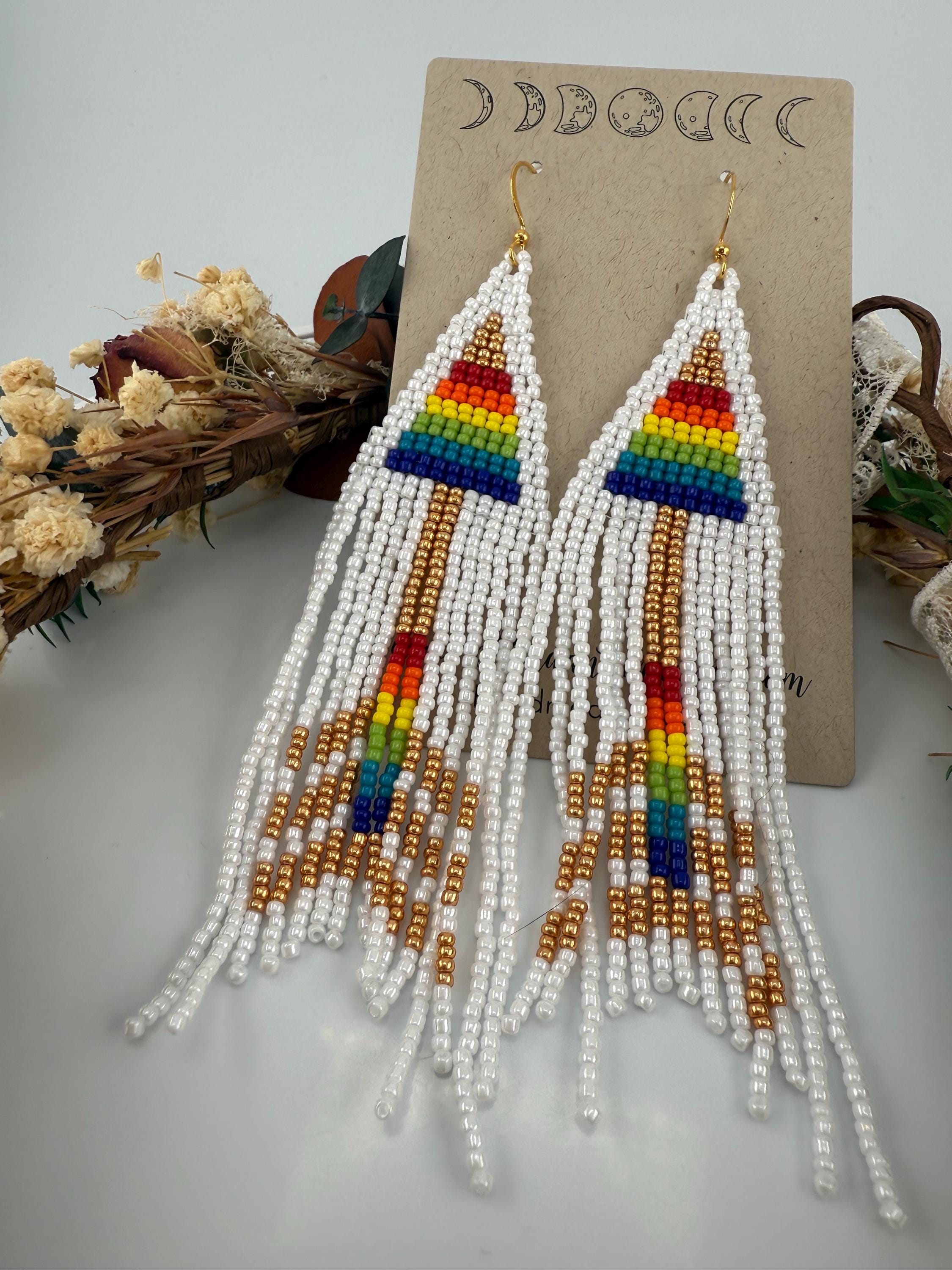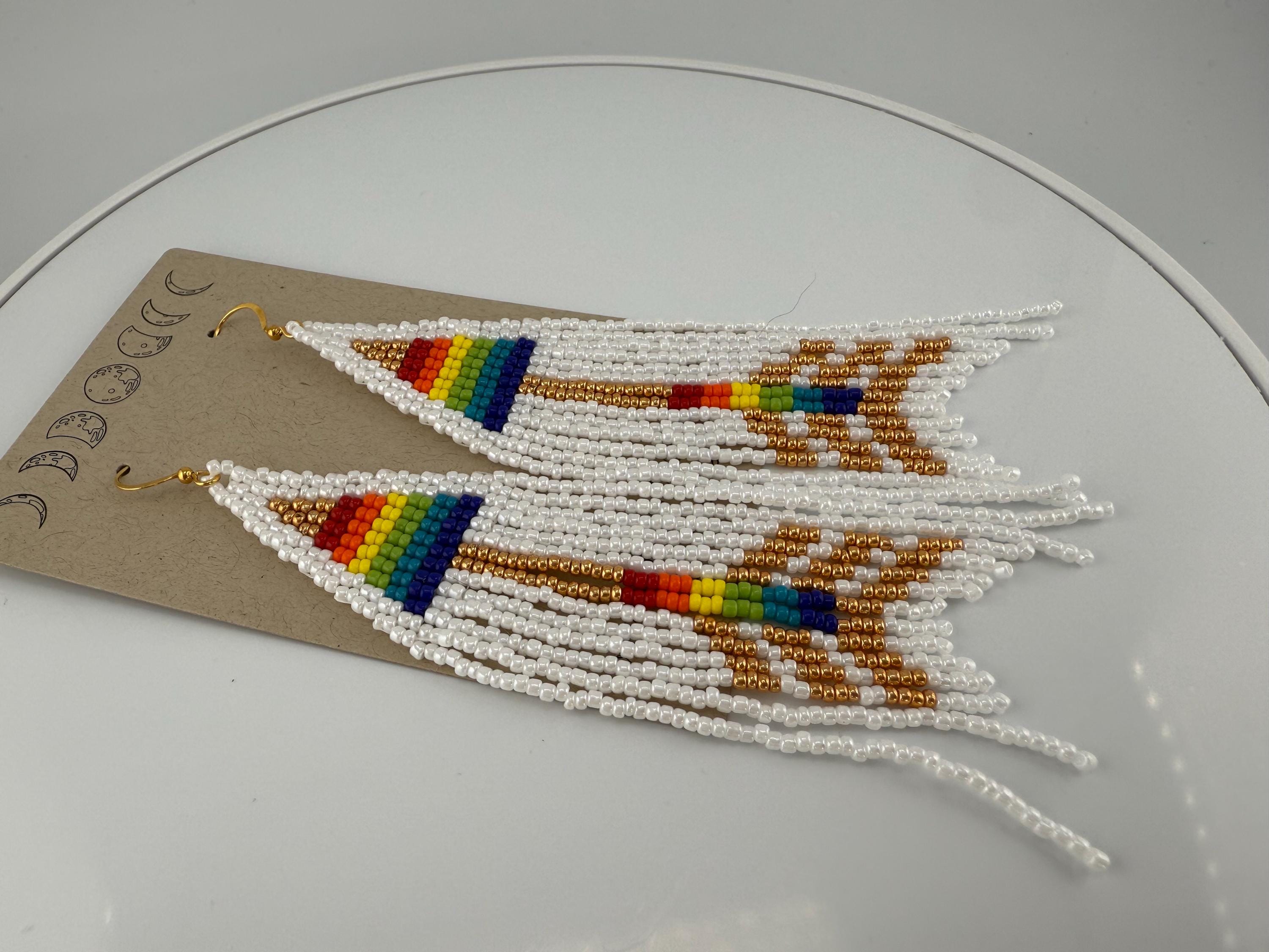 These are a pair of hand-made beaded fringe earrings. They are a delightful pattern that is both beautiful and poetic , cause love is love is love! and no matter how that arrow hits the heart we all know love fills our souls. Lots of color and shine on these beautiful earrings. They are handmade, and come in around 4 hours time to complete. They are not overly heavy, but do hang around 4.25-4.5 inches in length.
