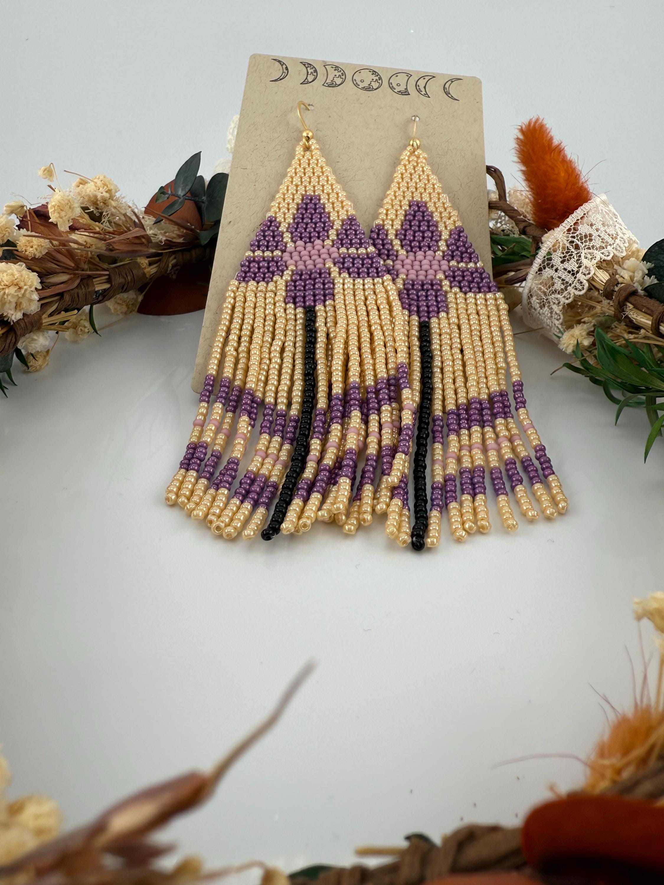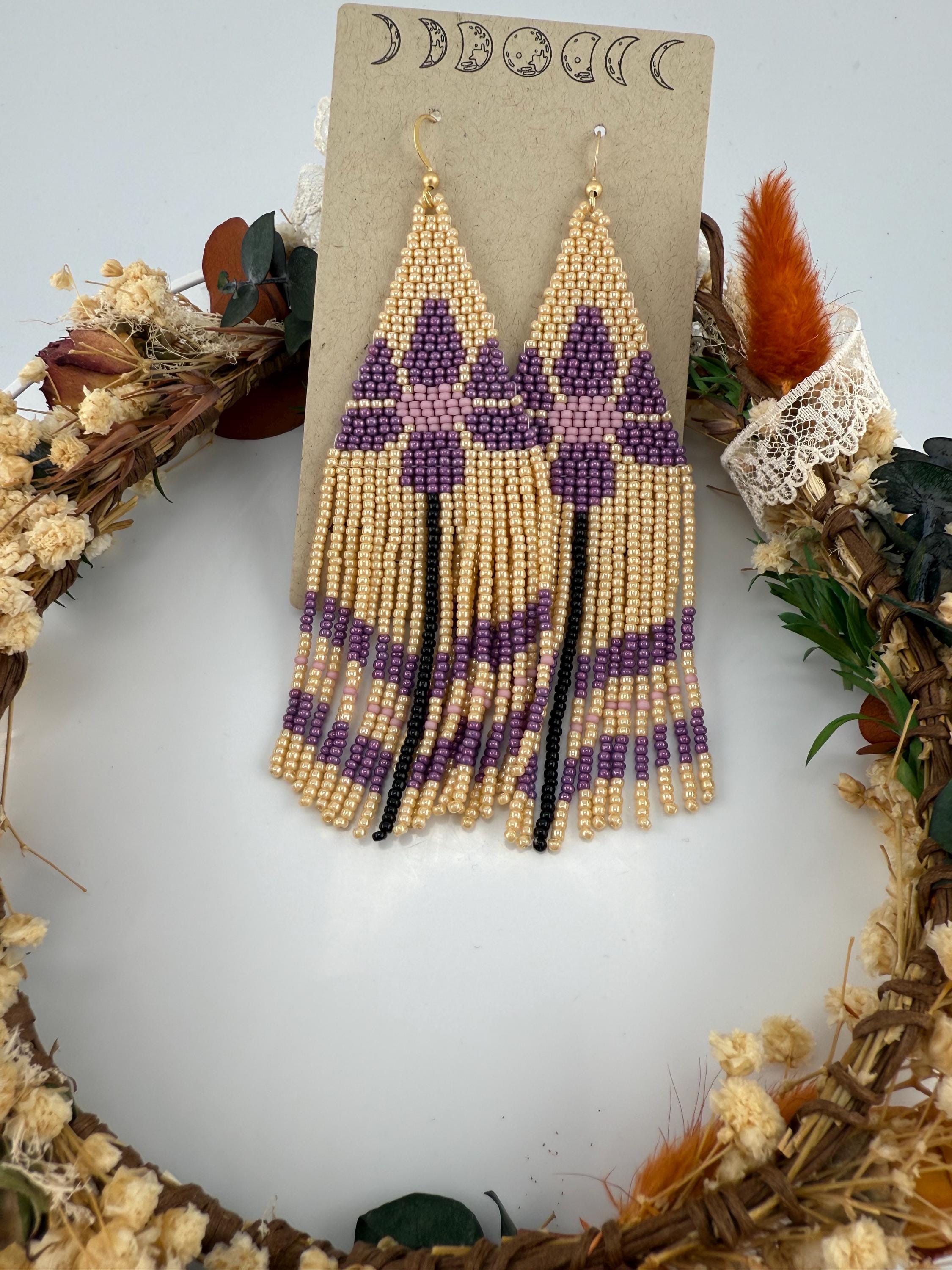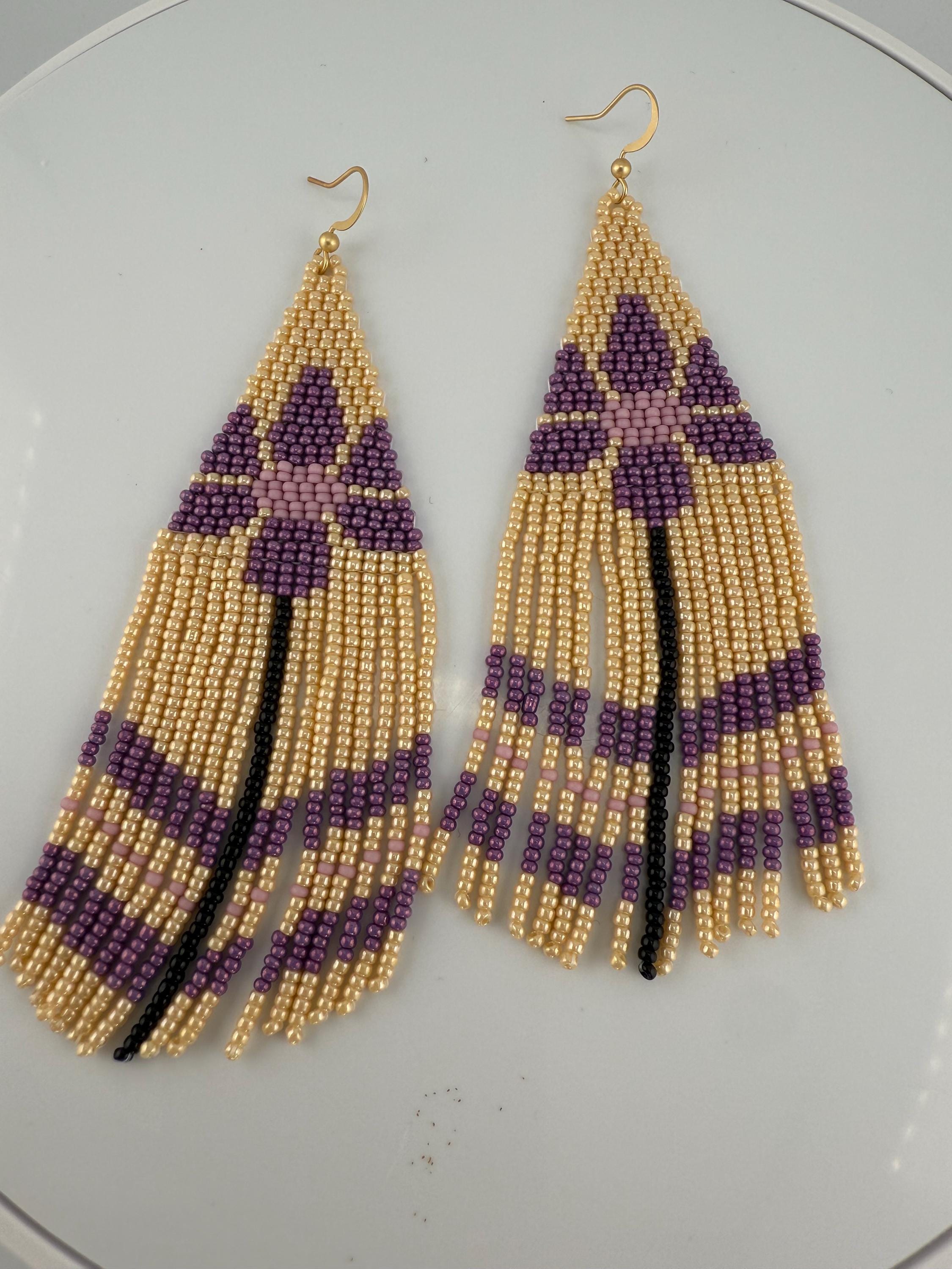 These are a pair of hand-made beaded fringe earrings. They are a delightful flower pattern that is both chic and beautiful , with an added color flare with purple! They are handmade by me, and come in around 4.5 hours time to complete. These beautiful little crafted gems hang around 5-5.5 inches in length.
