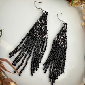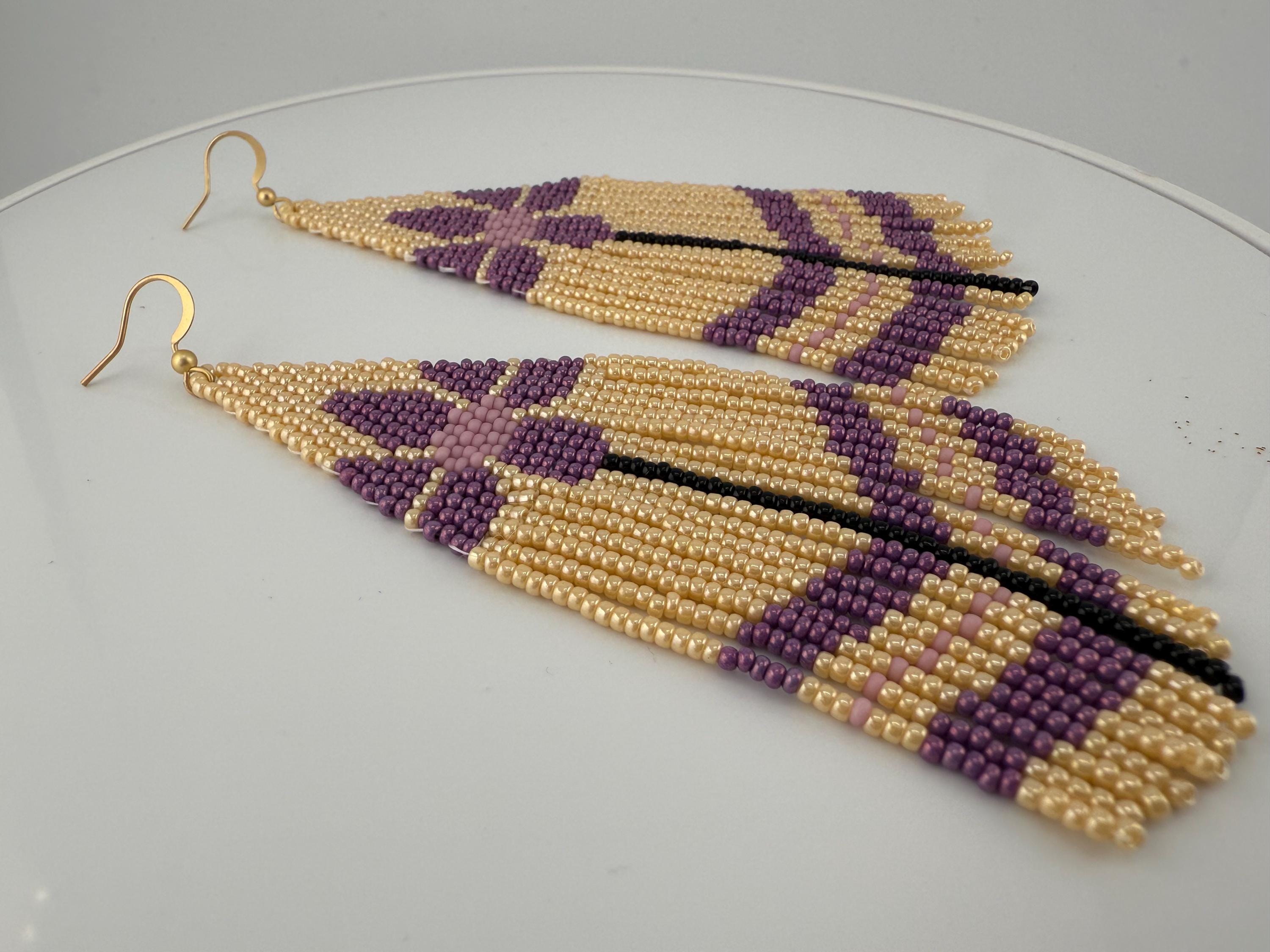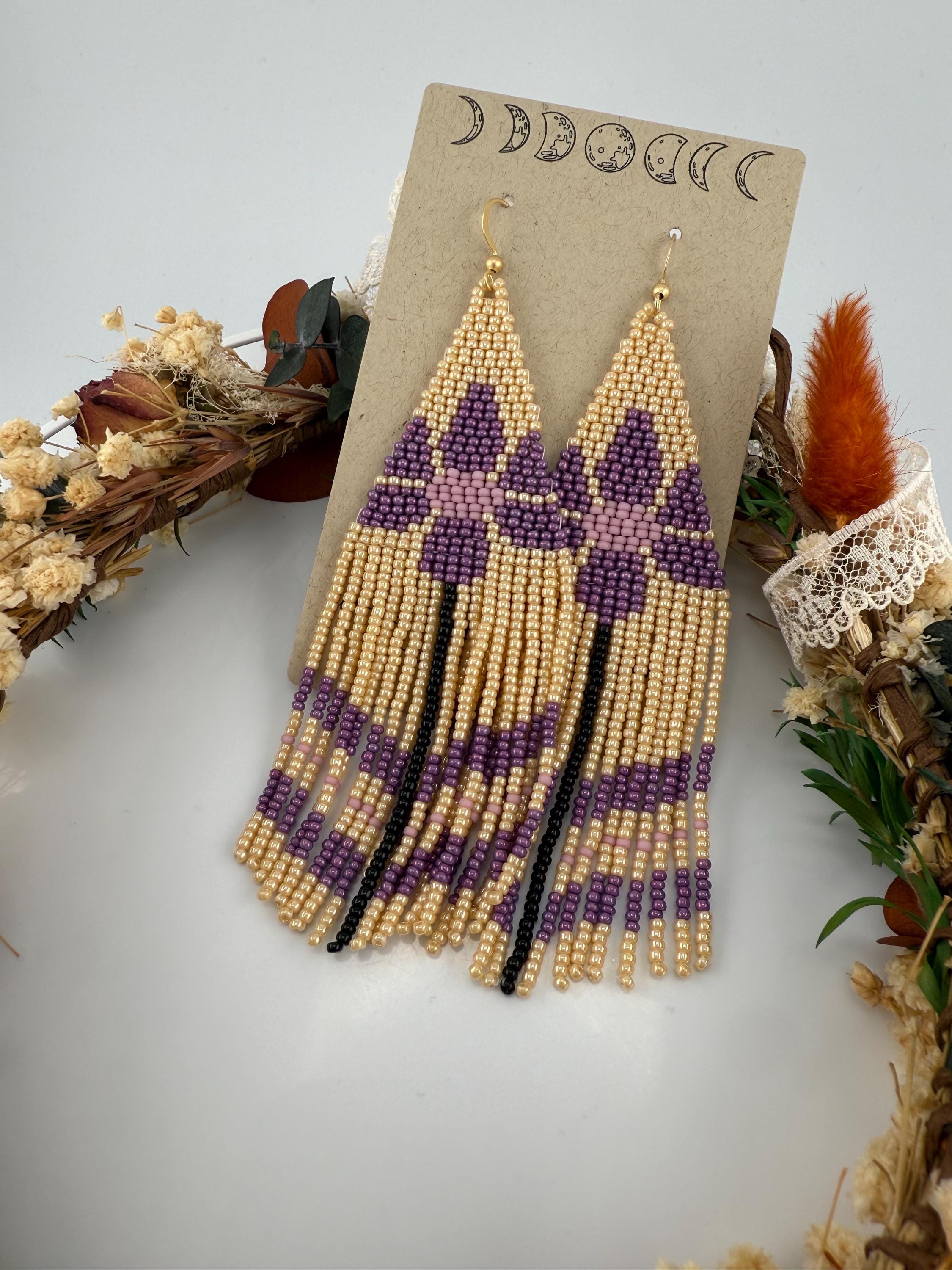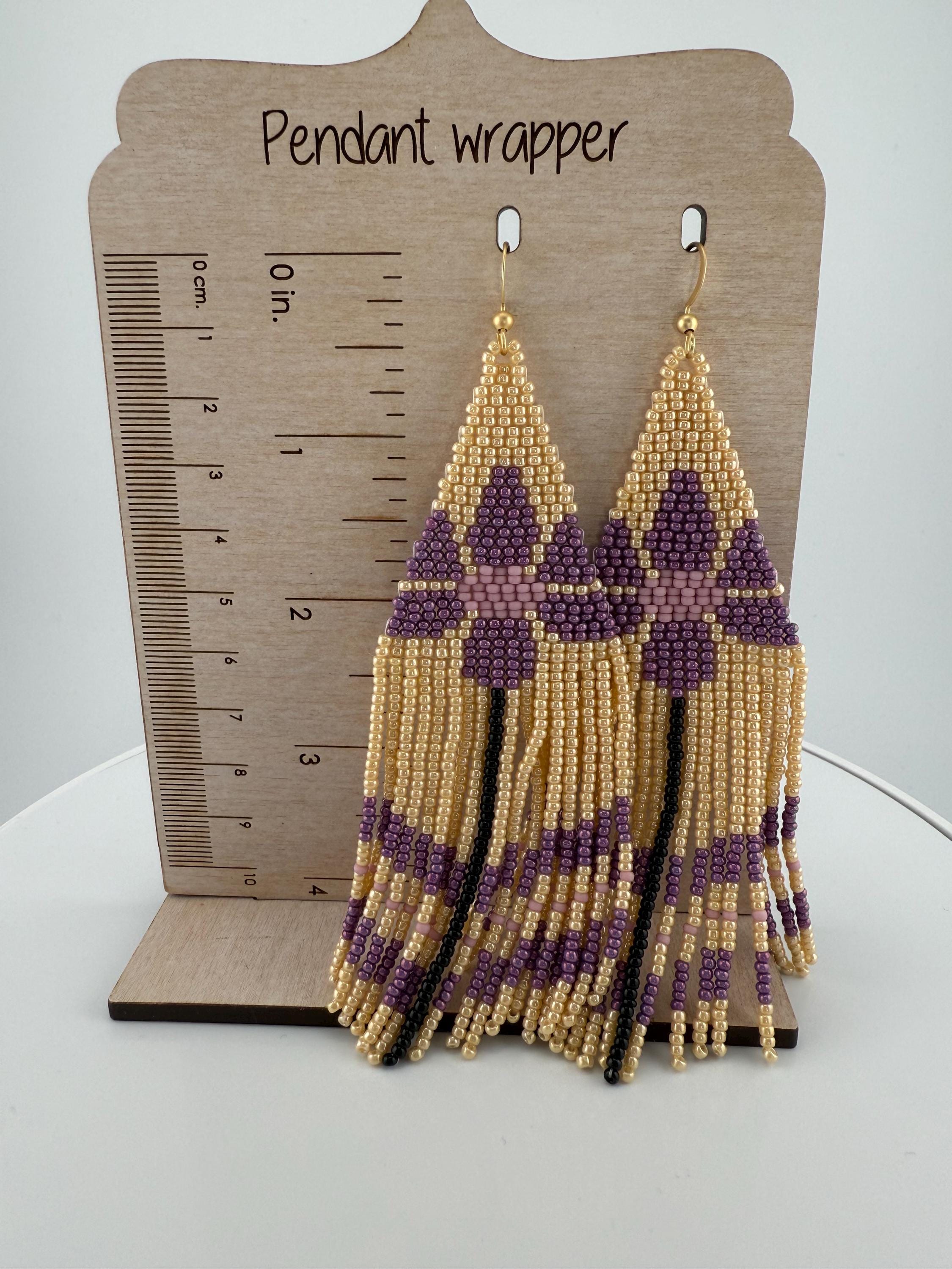 These are a pair of hand-made beaded fringe earrings. They are a delightful flower pattern that is both chic and beautiful , with an added color flare with purple! They are handmade by me, and come in around 4.5 hours time to complete. These beautiful little crafted gems hang around 5-5.5 inches in length.