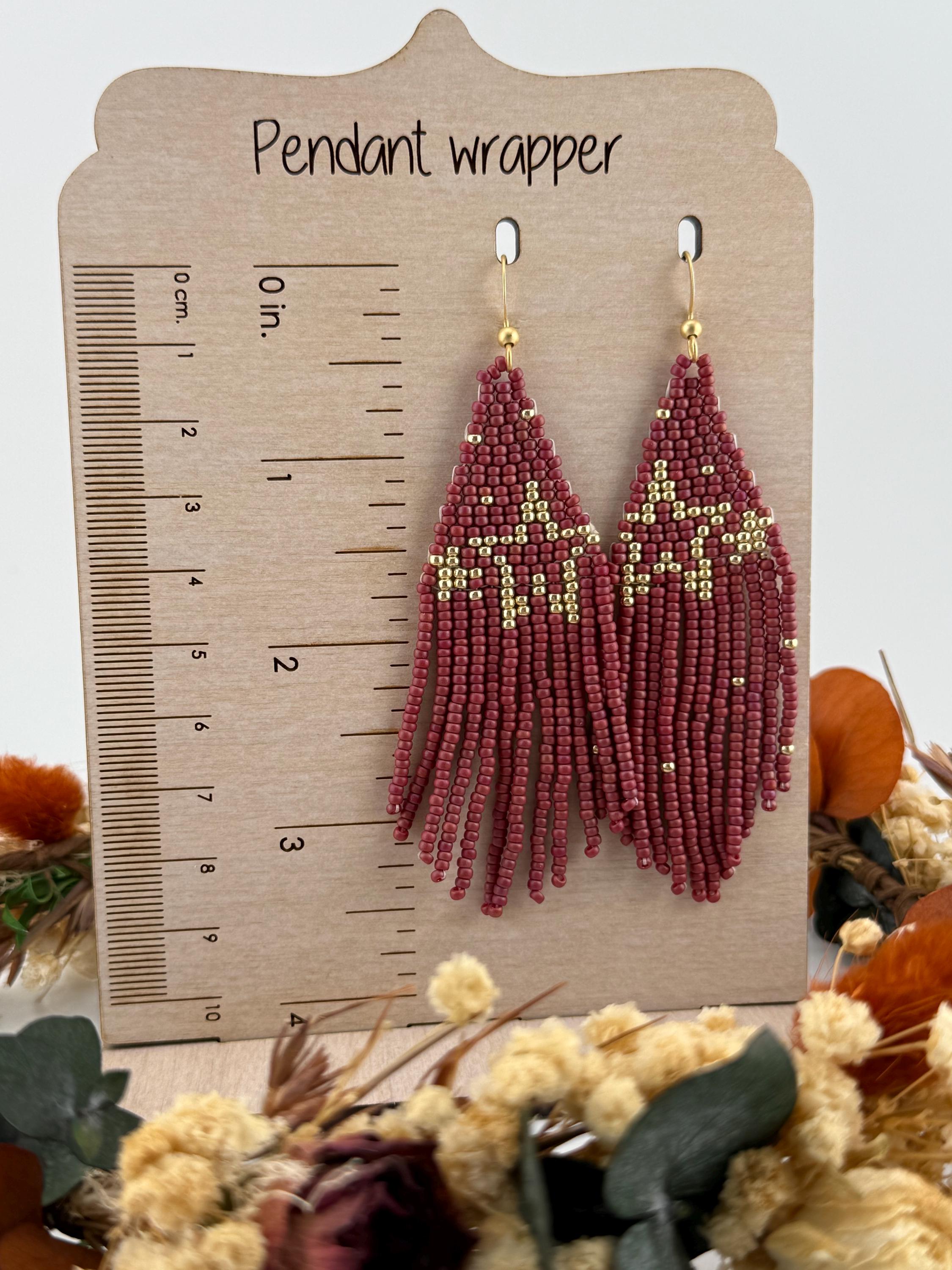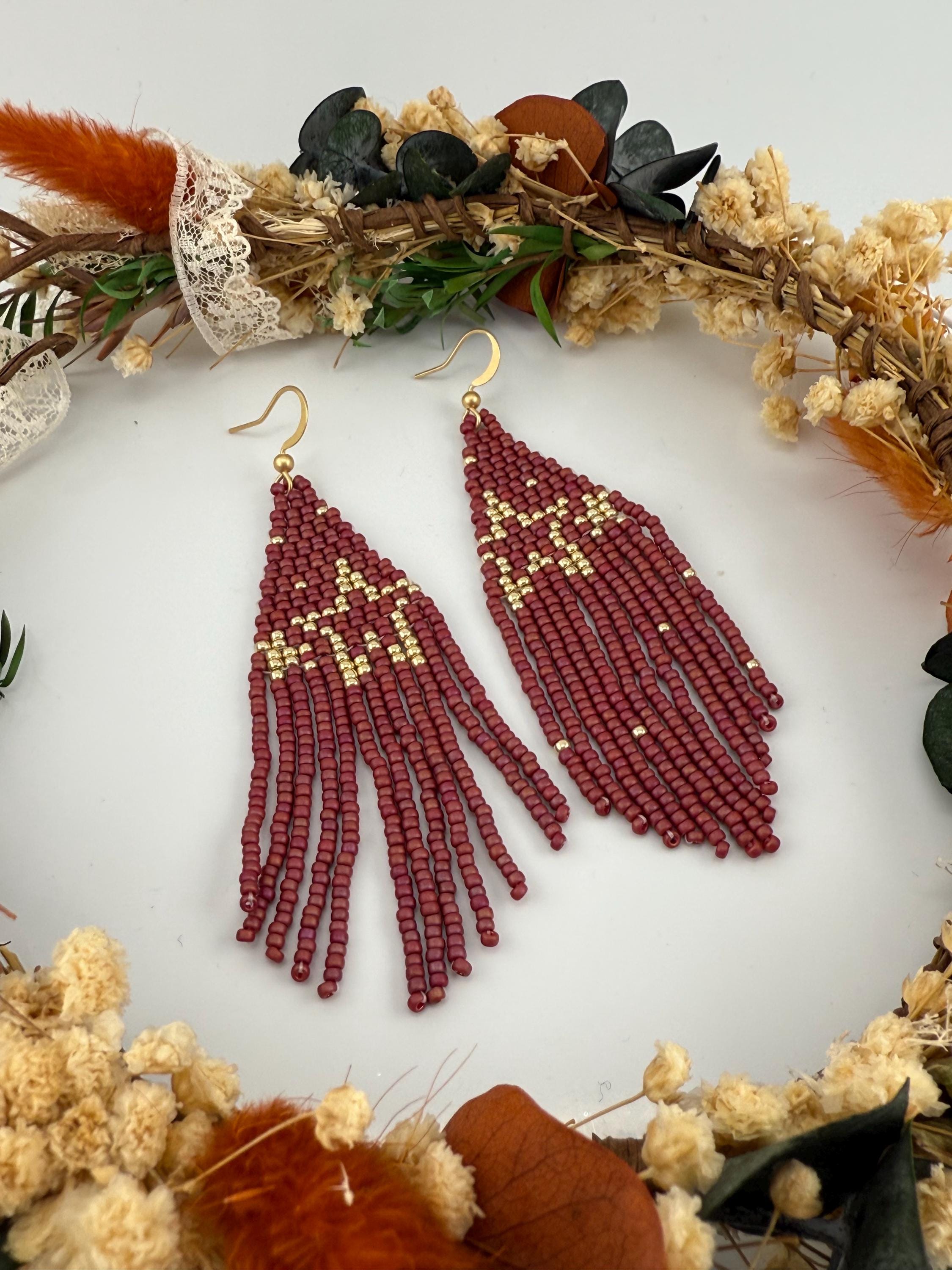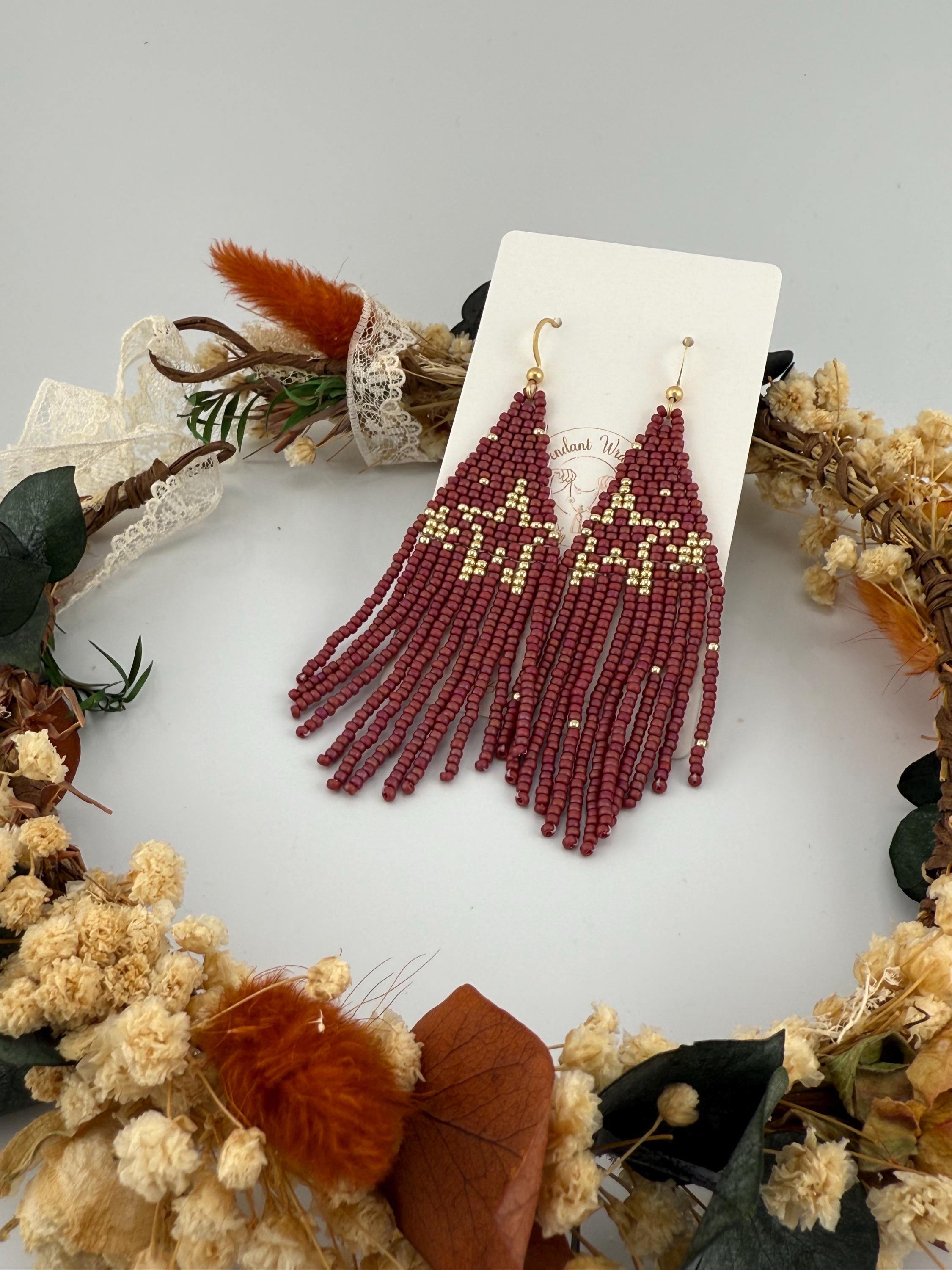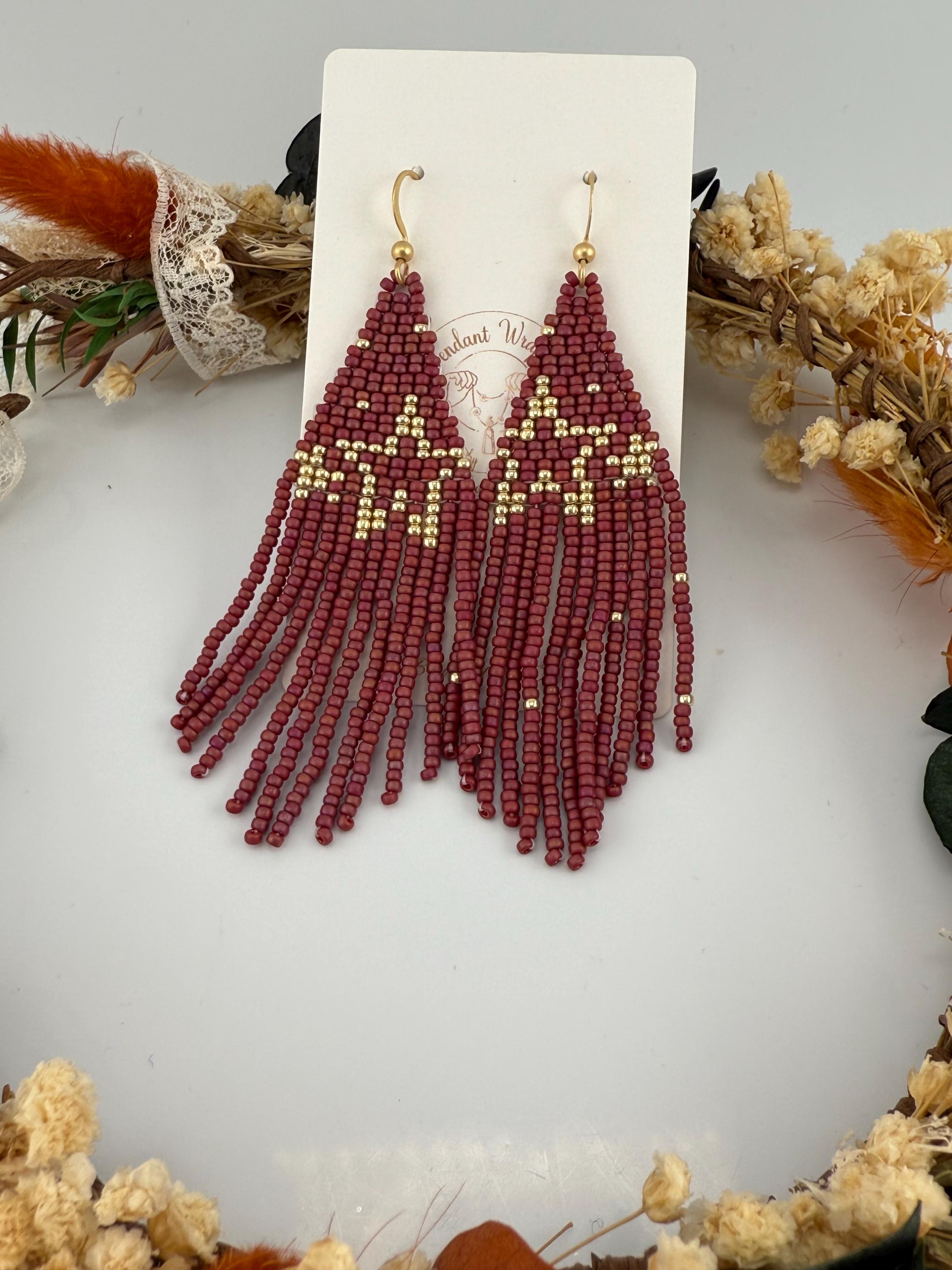 These handmade earrings are a beautiful pearly purple and gold blend with a whimsical star design. Much, much shorter then most of my fringe earrings these are dainty and cute and just enough sparkle to dress up or down. Length is closer to 3.5 inches in total and weight is much less then my traditional fringe.