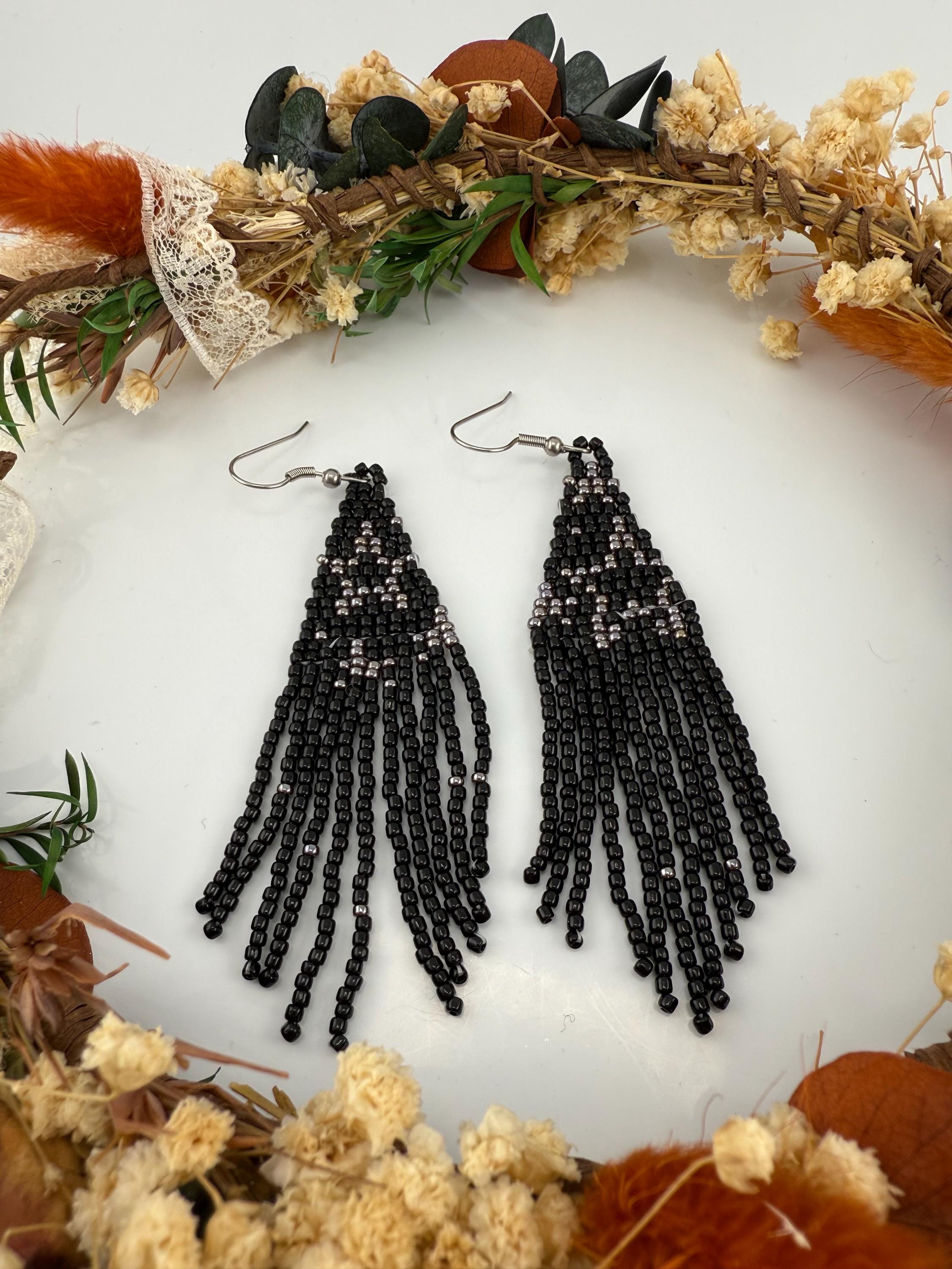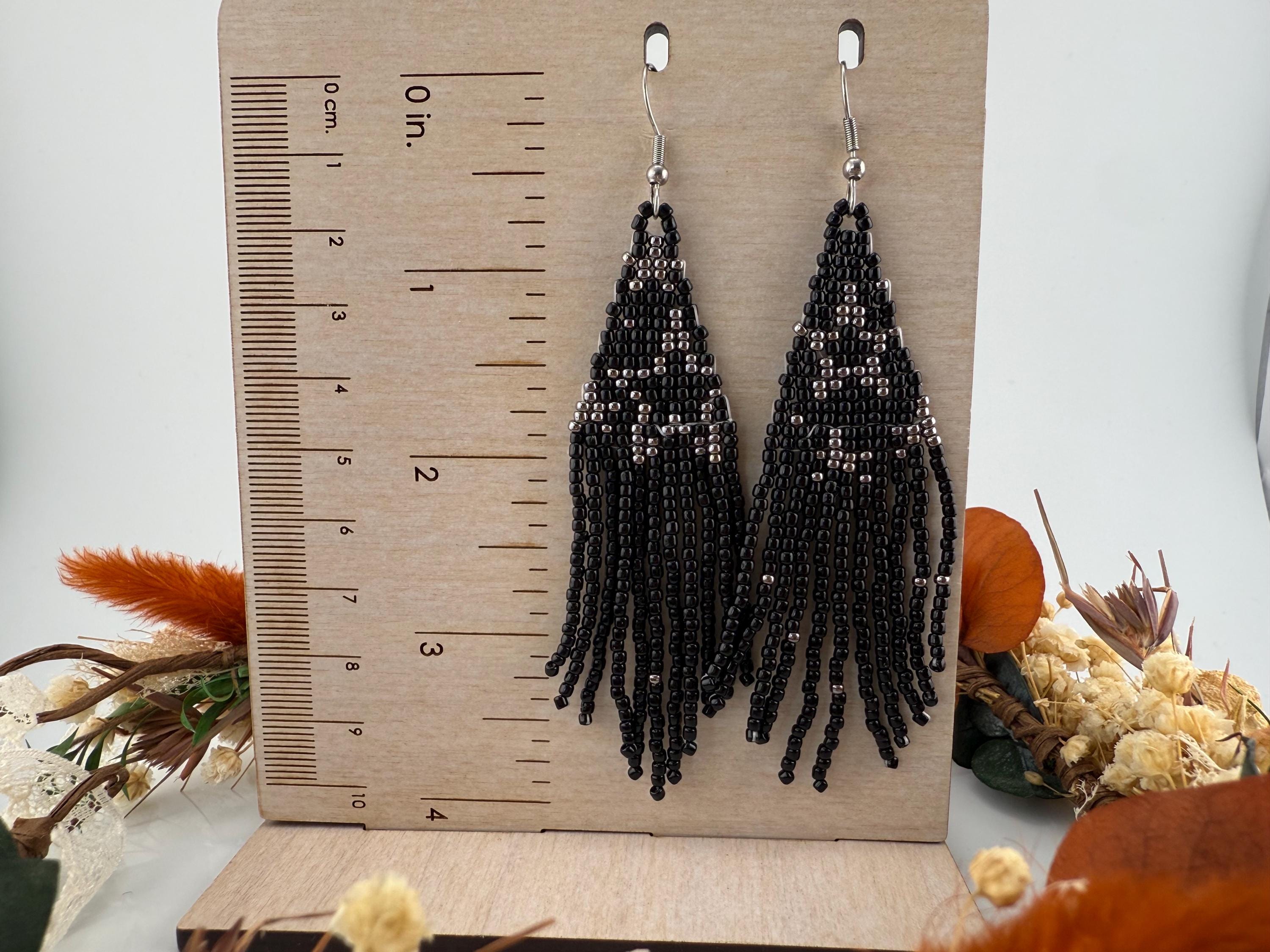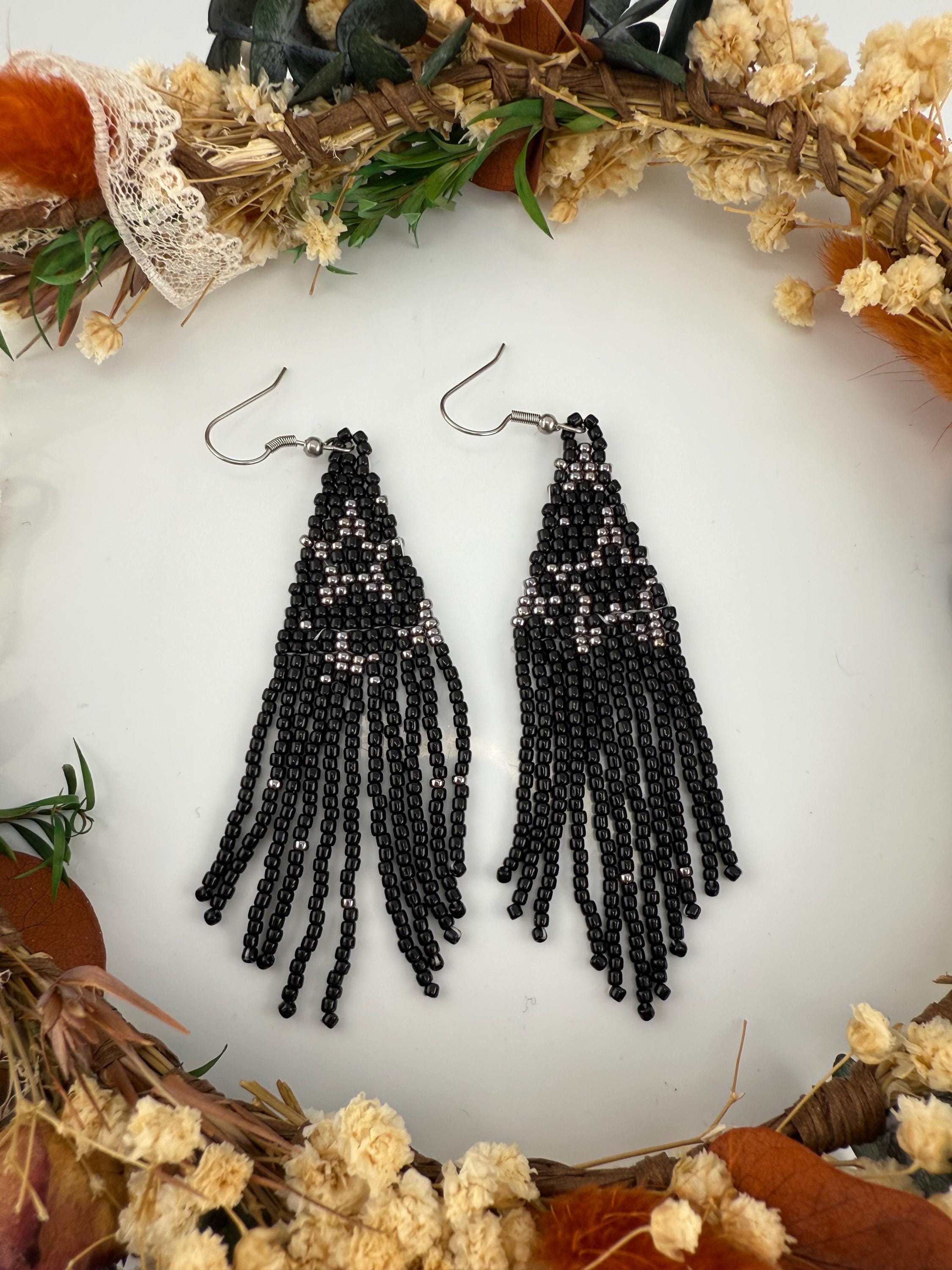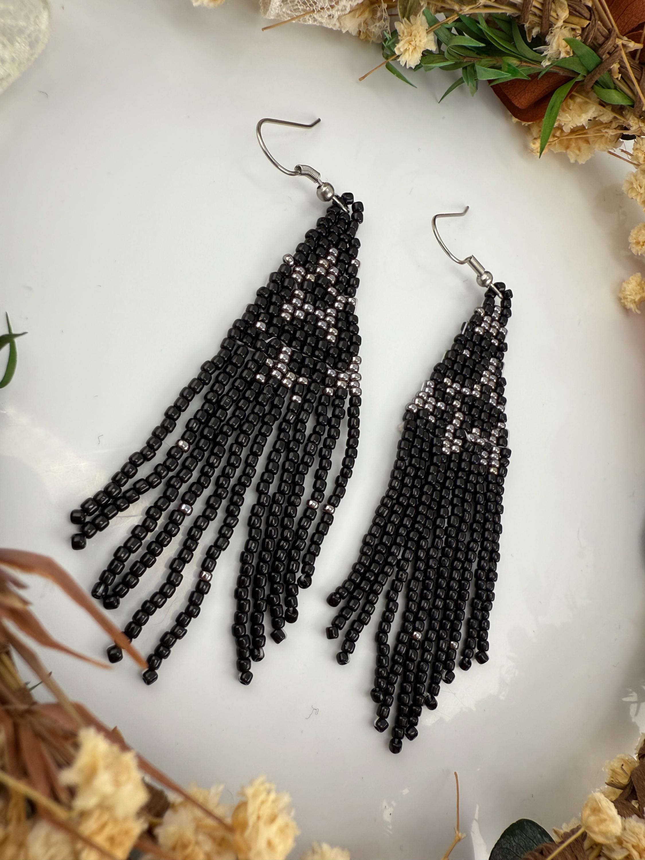 These handmade earrings are a black and silver combination with a whimsical star design. Much, much shorter then most of my fringe earrings these are dainty and cute and just enough sparkle to dress up or down. Length is closer to 3.5 inches in total and weight is much less then my traditional fringe. Perfect to pair with any black dress.
