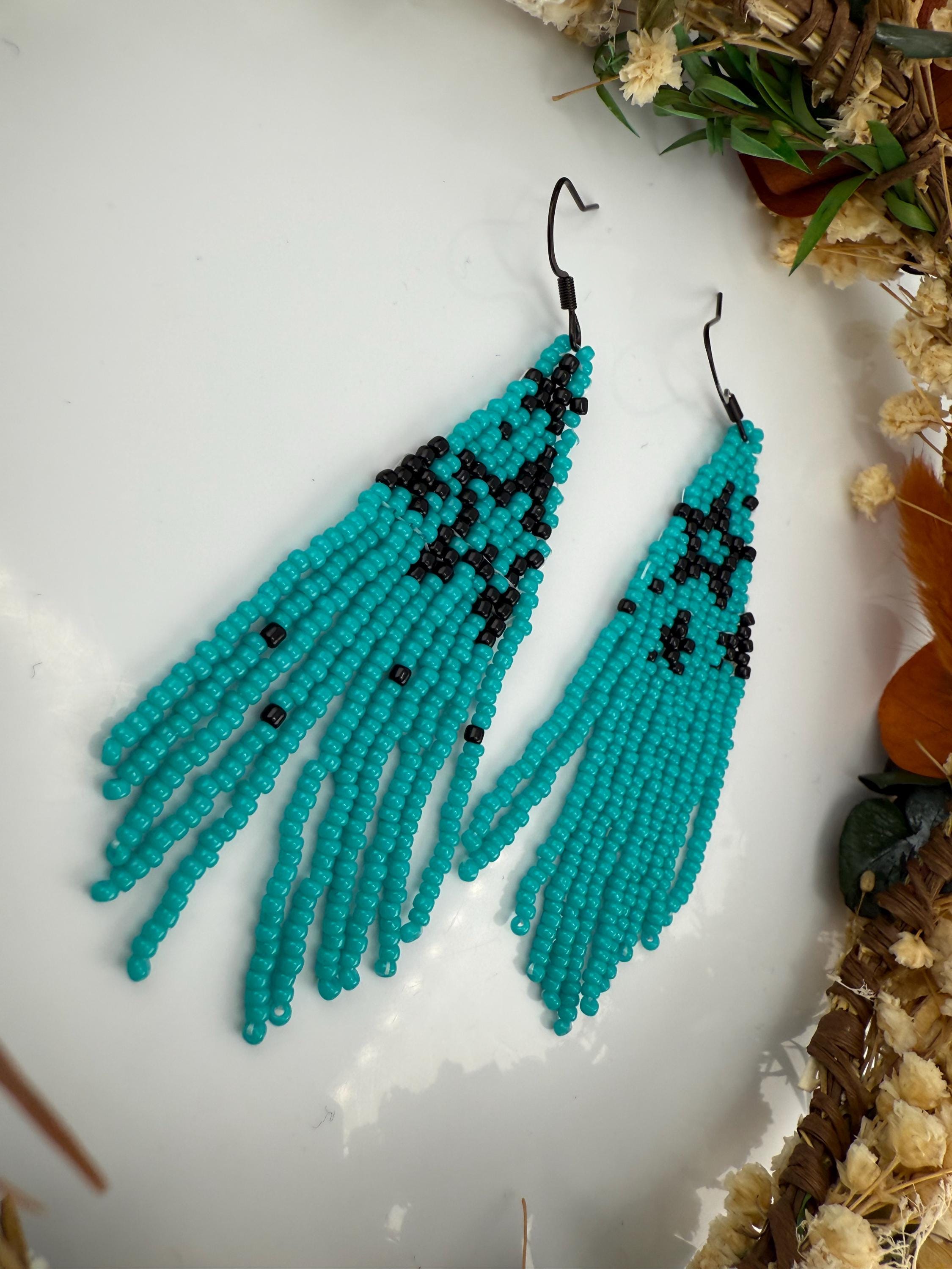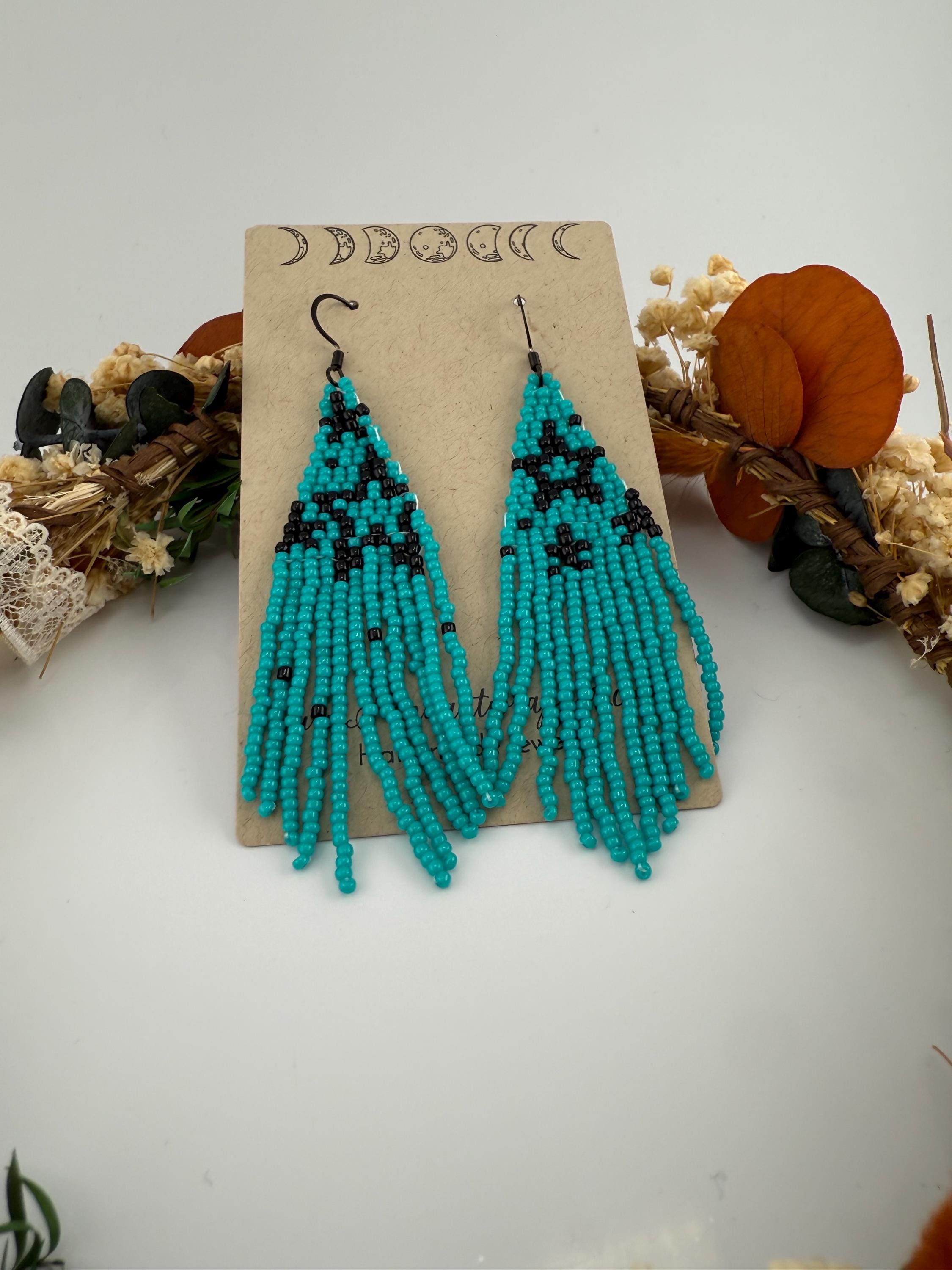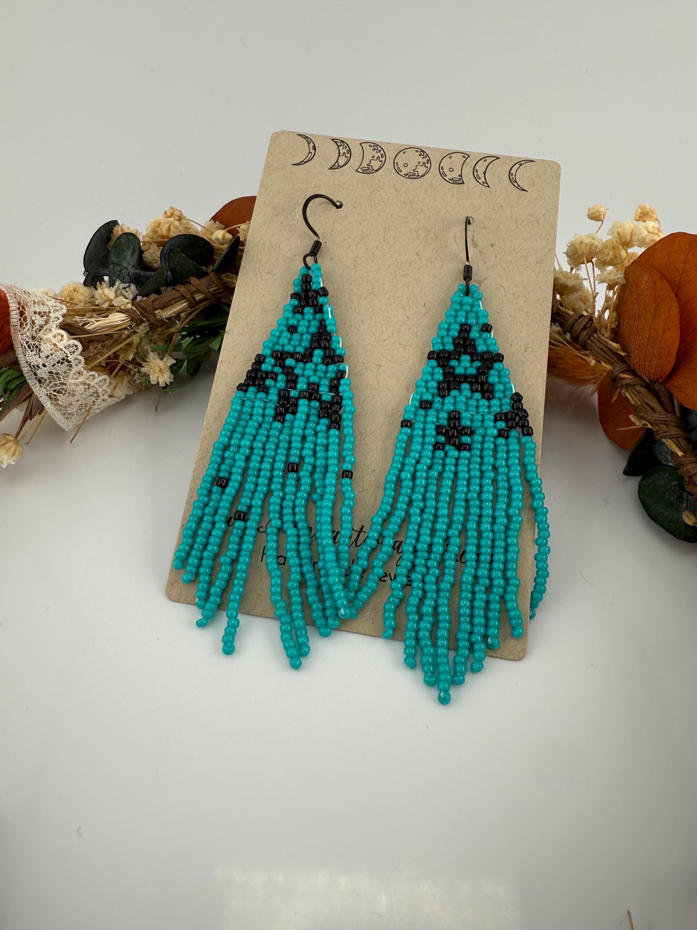 These handmade earrings are a beautiful turquoise and black combination with a whimsical star design. Much, much shorter then most of my fringe earrings these are dainty and cute and just enough sparkle to dress up or down. Length is closer to 3.5 inches in total and weight is much less then my traditional fringe. Color of these are vibrant and bold!