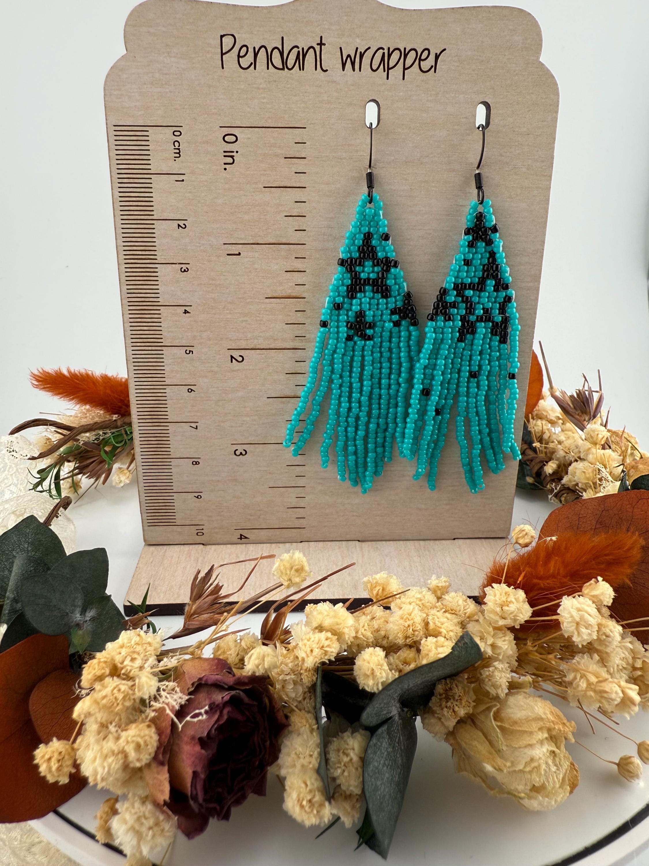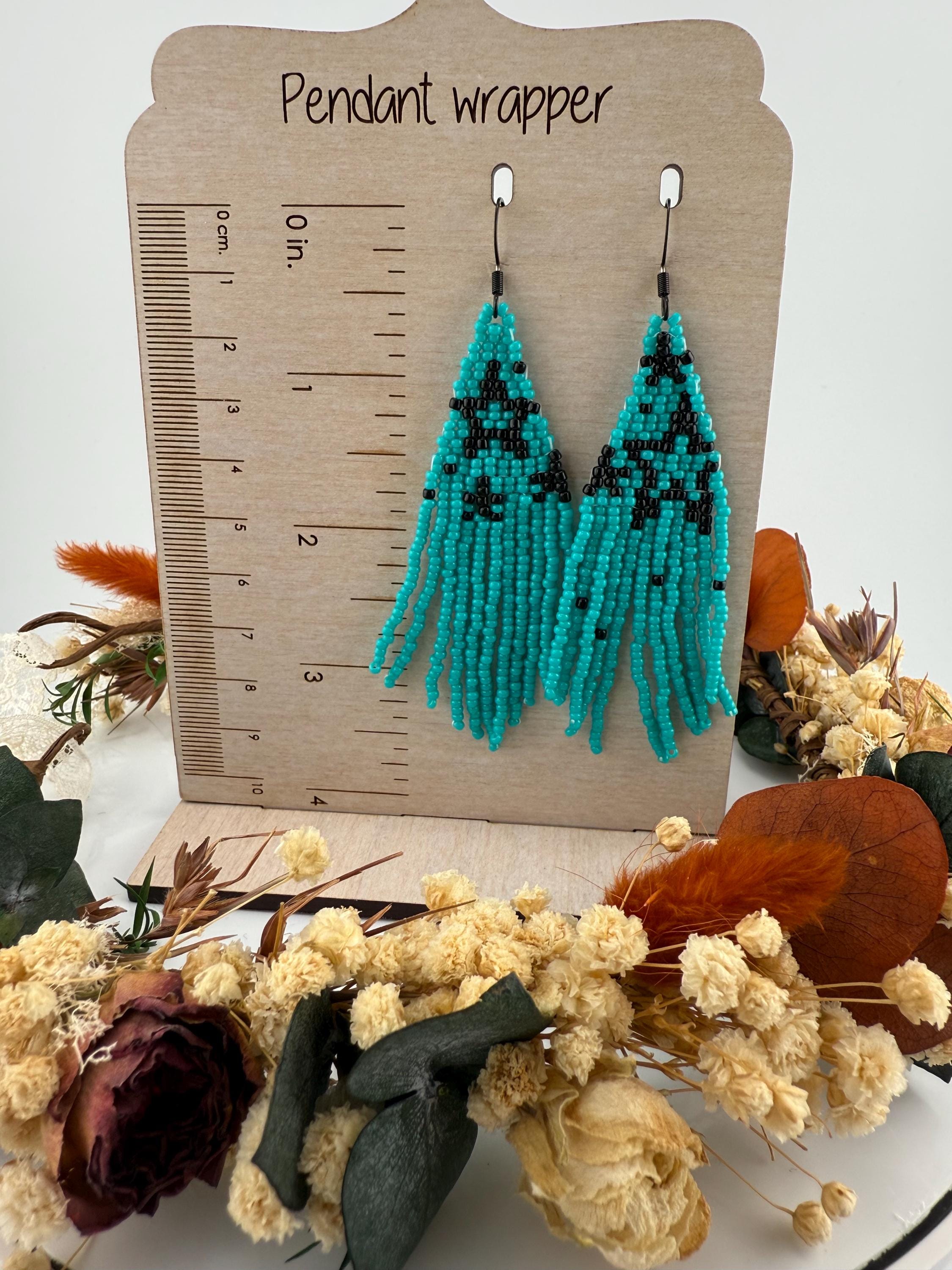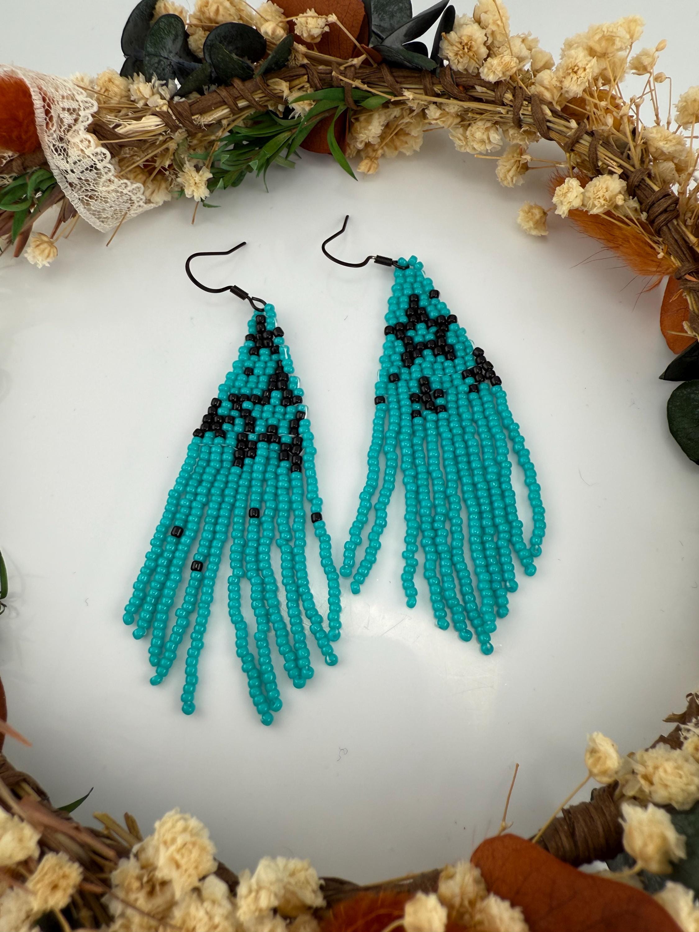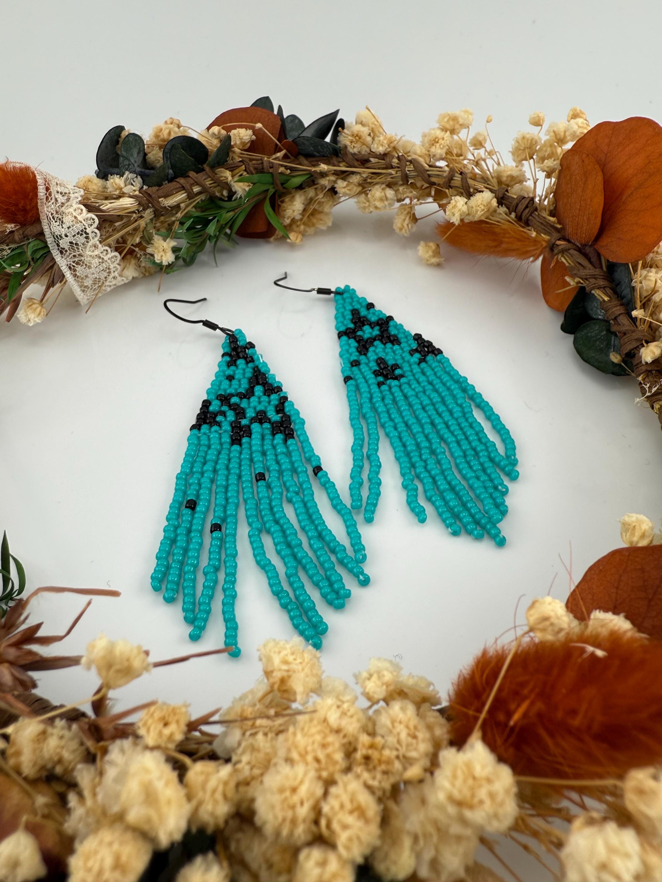 These handmade earrings are a beautiful turquoise and black combination with a whimsical star design. Much, much shorter then most of my fringe earrings these are dainty and cute and just enough sparkle to dress up or down. Length is closer to 3.5 inches in total and weight is much less then my traditional fringe. Color of these are vibrant and bold!