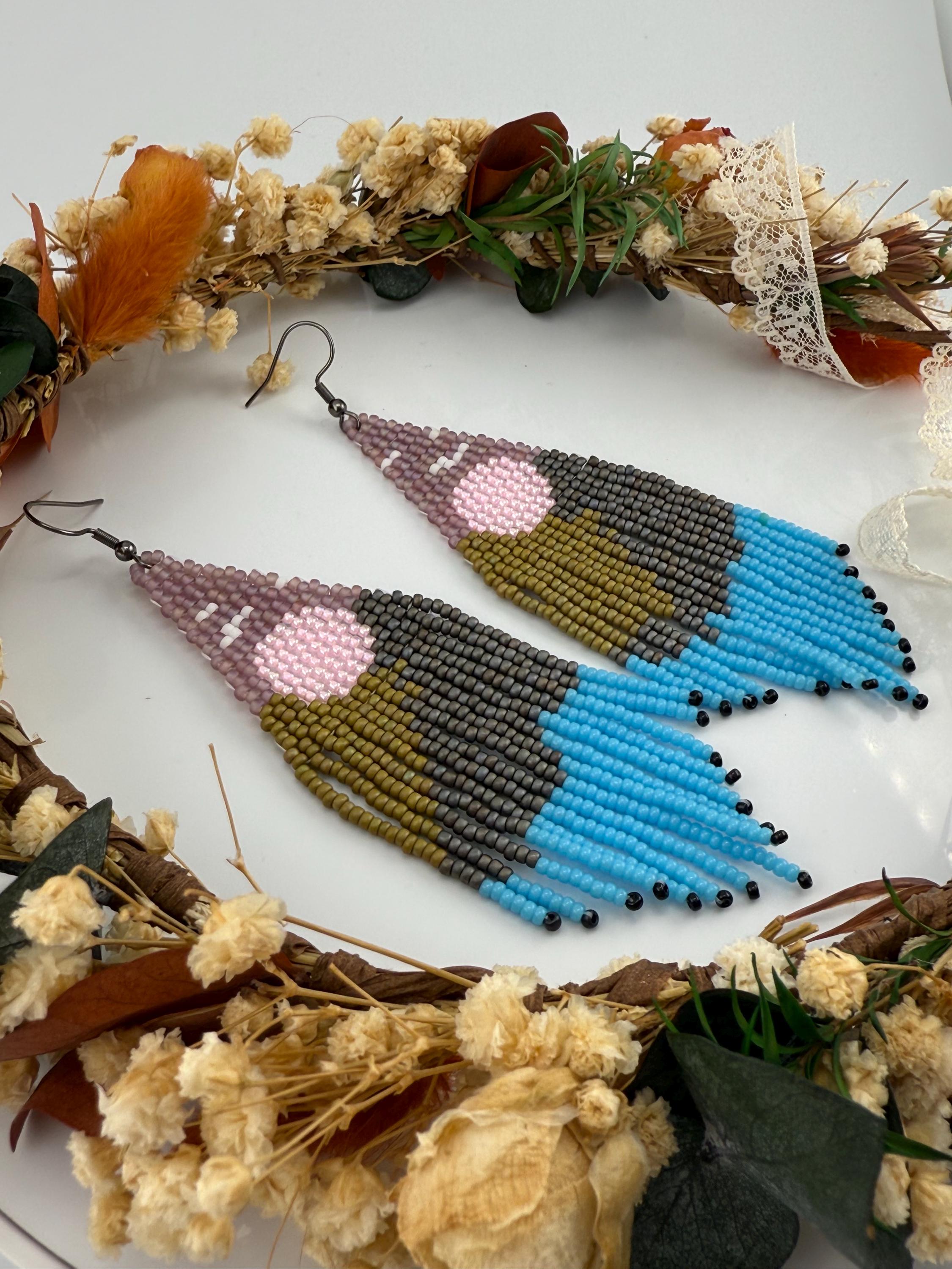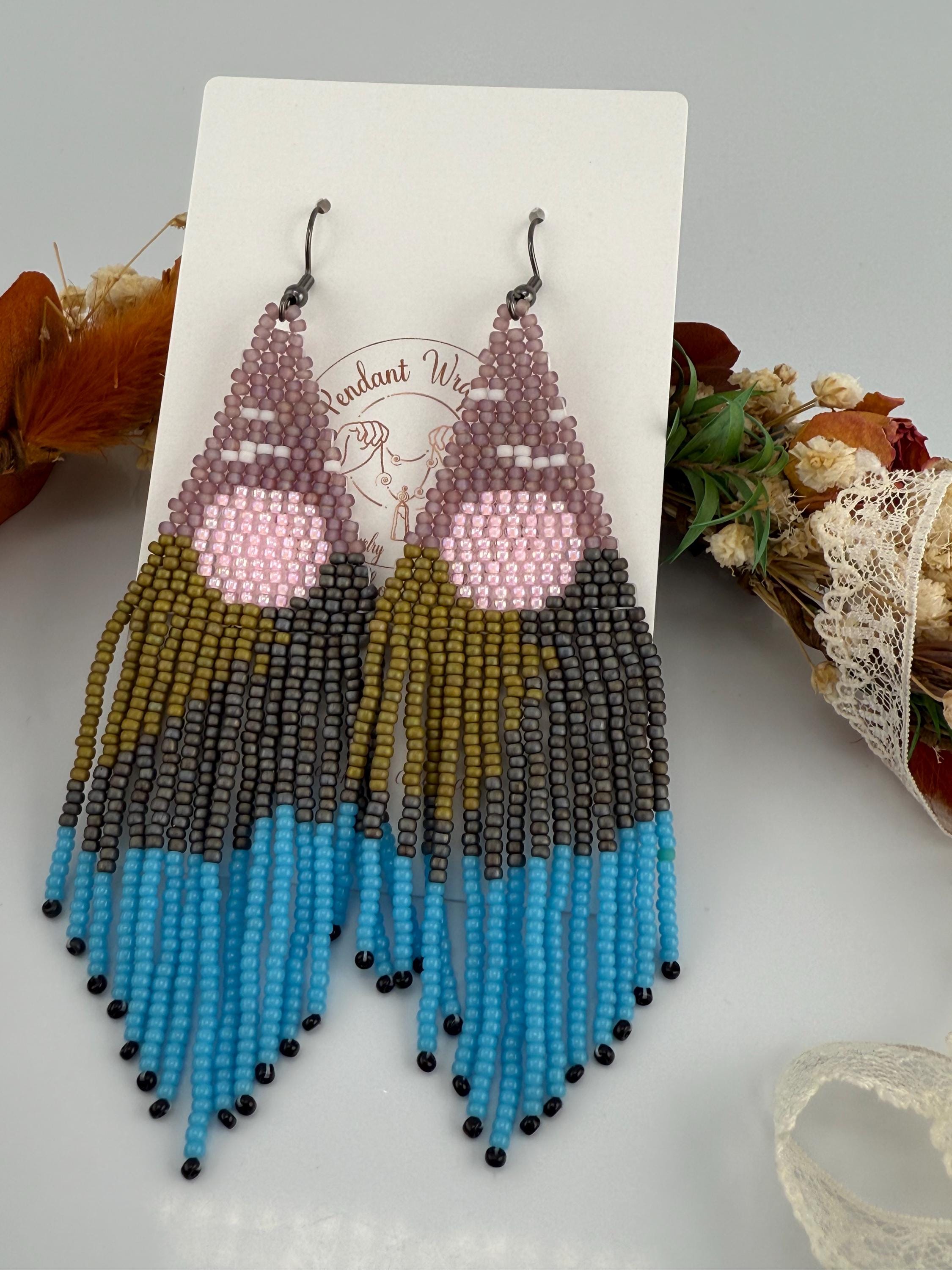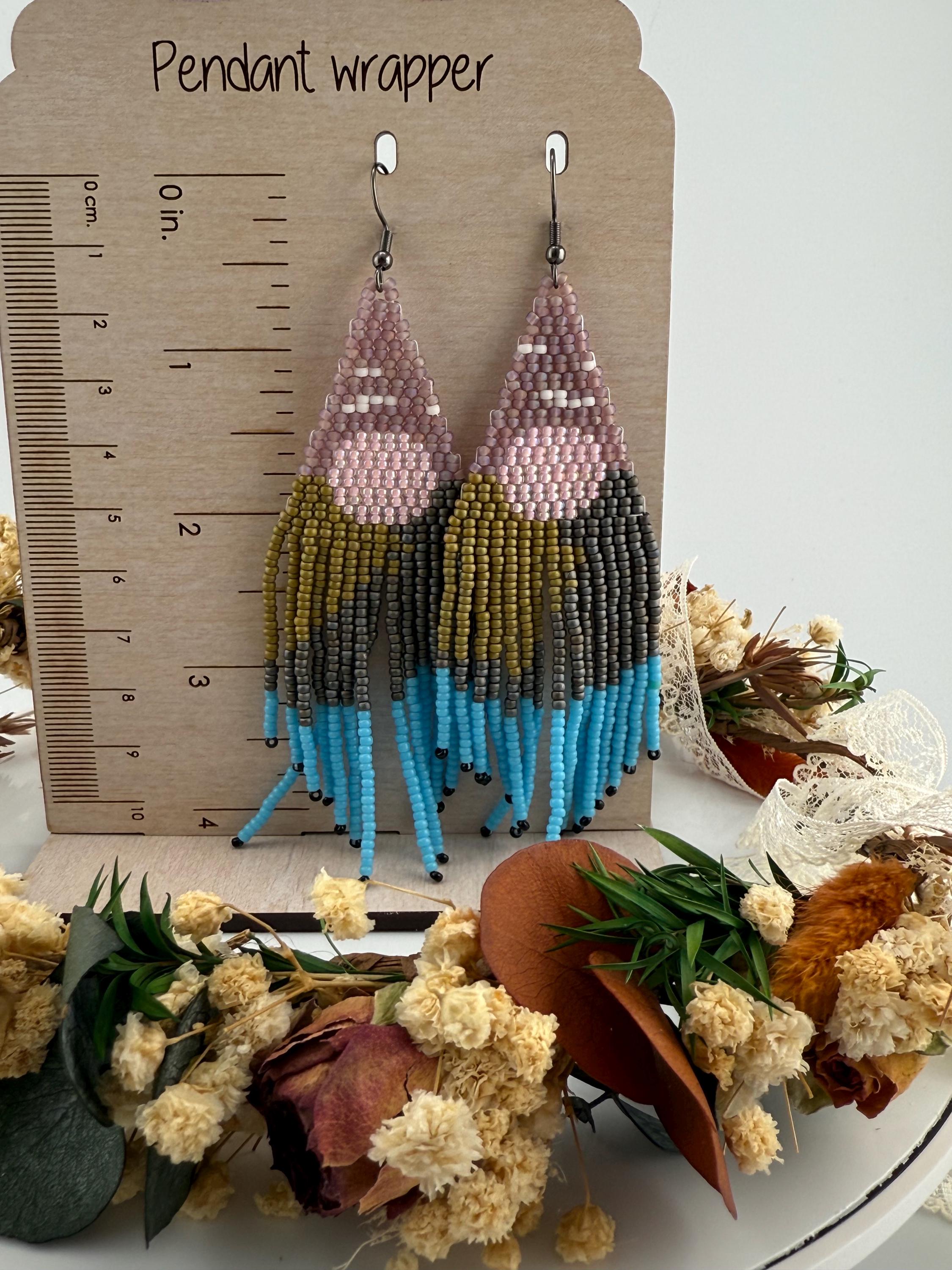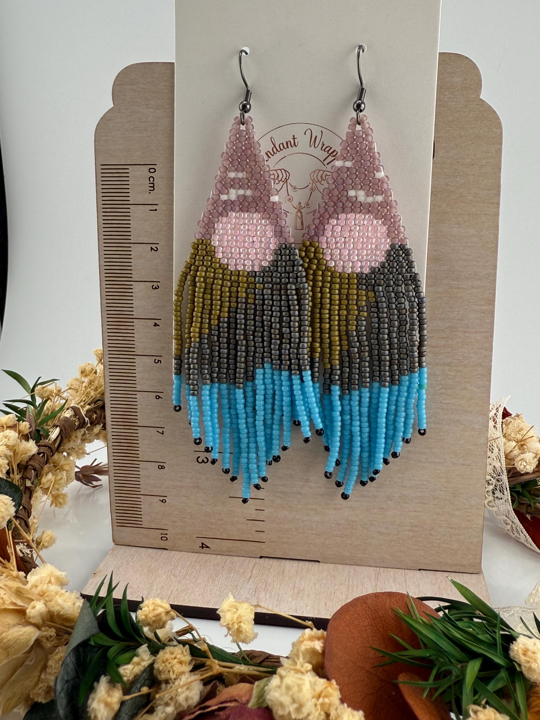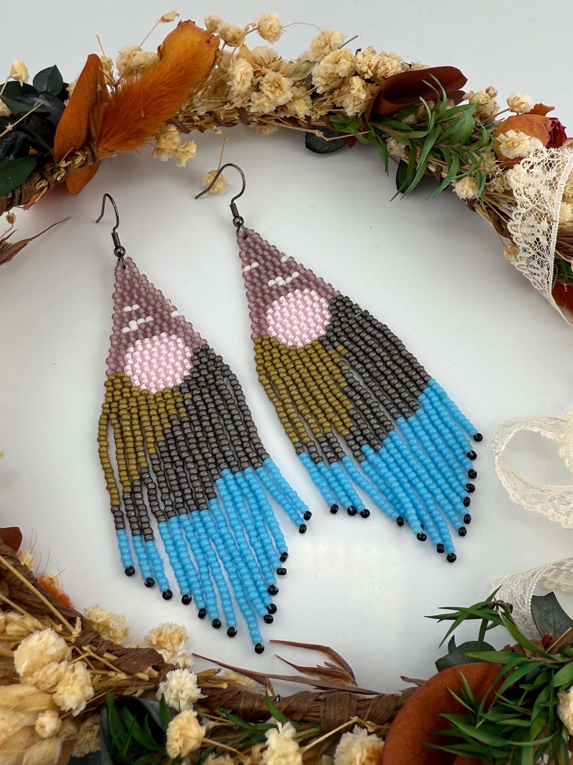 Beautiful sunsets, long roads, mountains and trees is what one sees on a mountain adventure weekend. These earrings are every part of that. These handmade earrings take me about four hours, but the end work is glorious! Mountains, trees, a lake, all part of the scene that makes these so delightful. Must have fringe beauties!